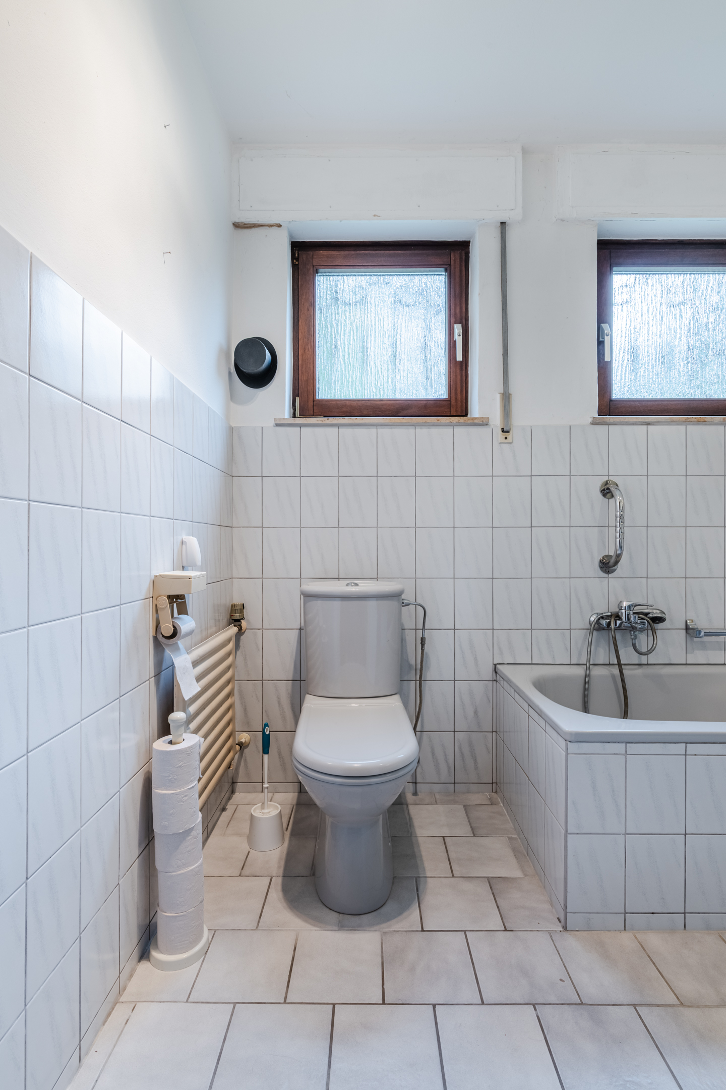 Badkamer met ligbad, douche, toilet en wastafel.