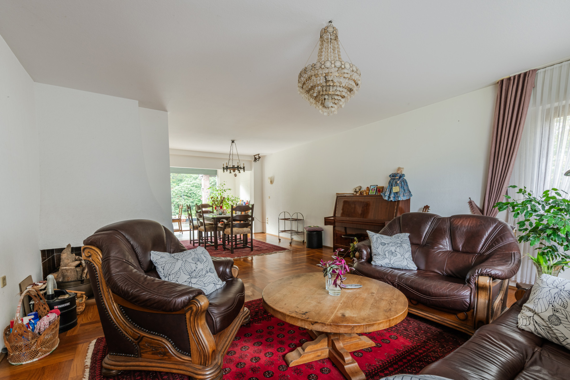 L-vormige woonkamer met parketvloer en open haard.