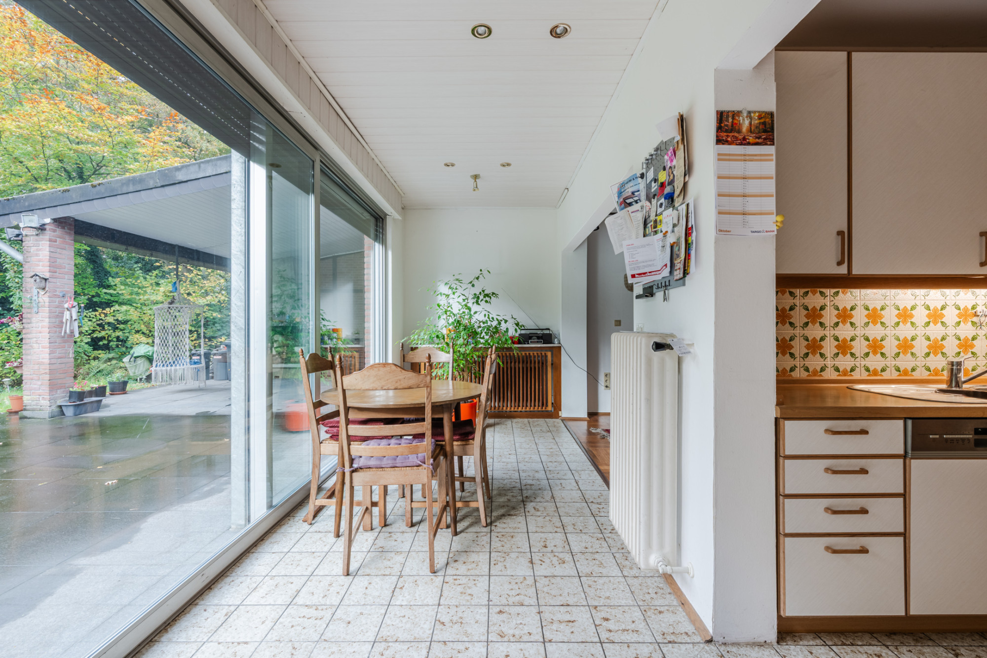 Eetkamer/tuinkamer met tegelvloer en brede schuifpui en toegang naar terras.