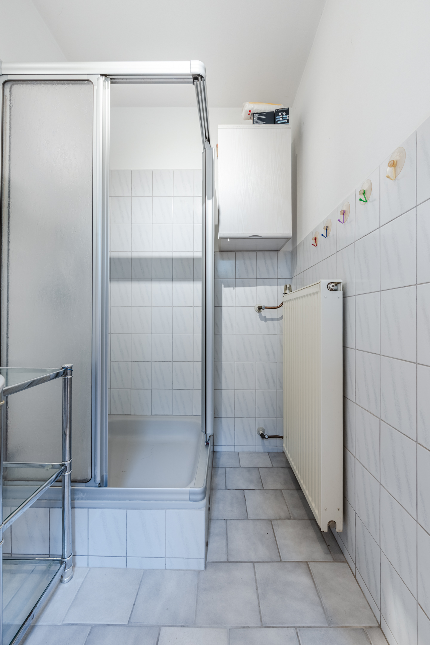 Kleine badkamer met douche, toilet en wastafel.