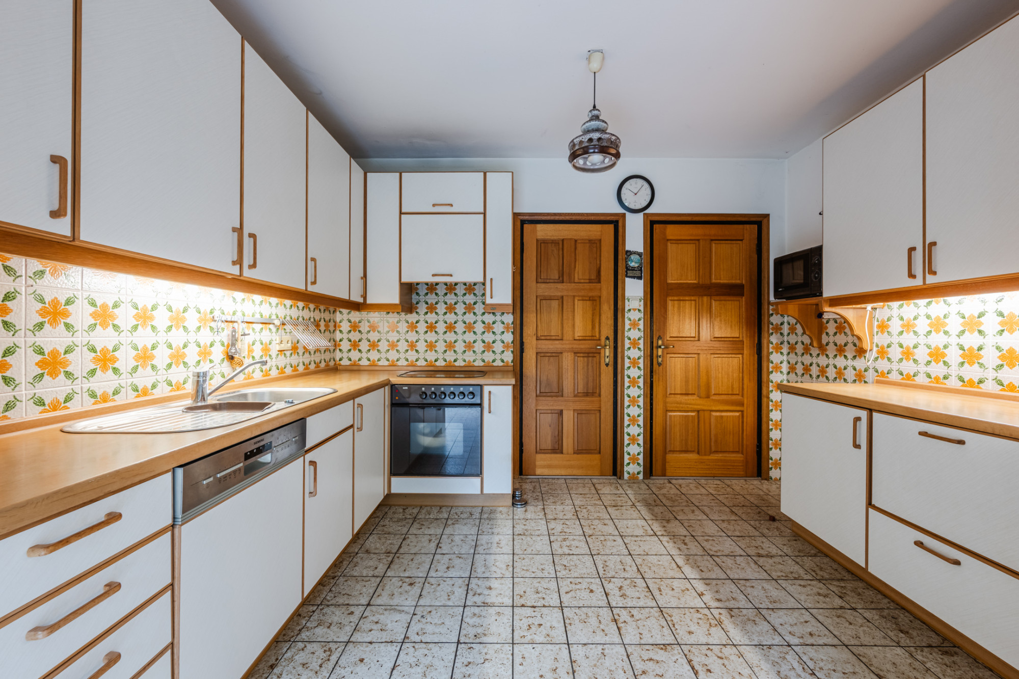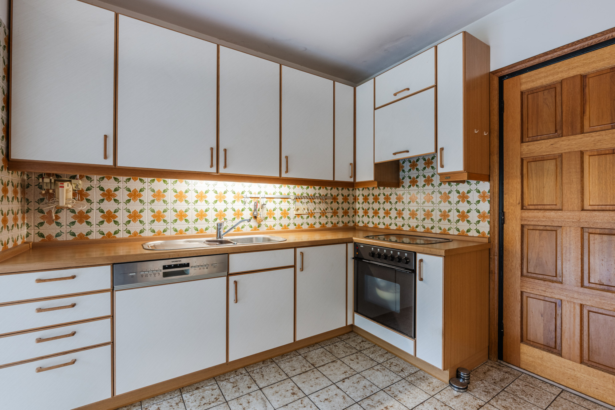 Halfopen keuken met verouderde aanbouwopstelling incl. apparatuur.