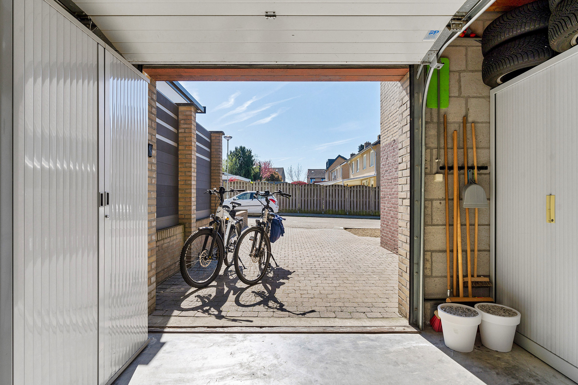 De oprit biedt plaats voor 2 auto's. Garage is voorzien van een elektrische sectionaalpoort en is ook via een deur in de aanbouw bereikbaar. In de garage is eveneens de witgoedaansluiting.