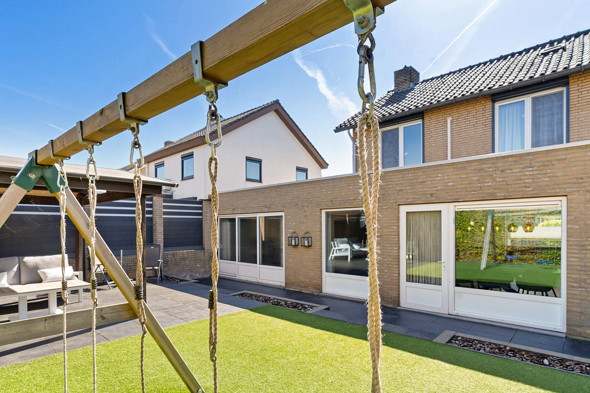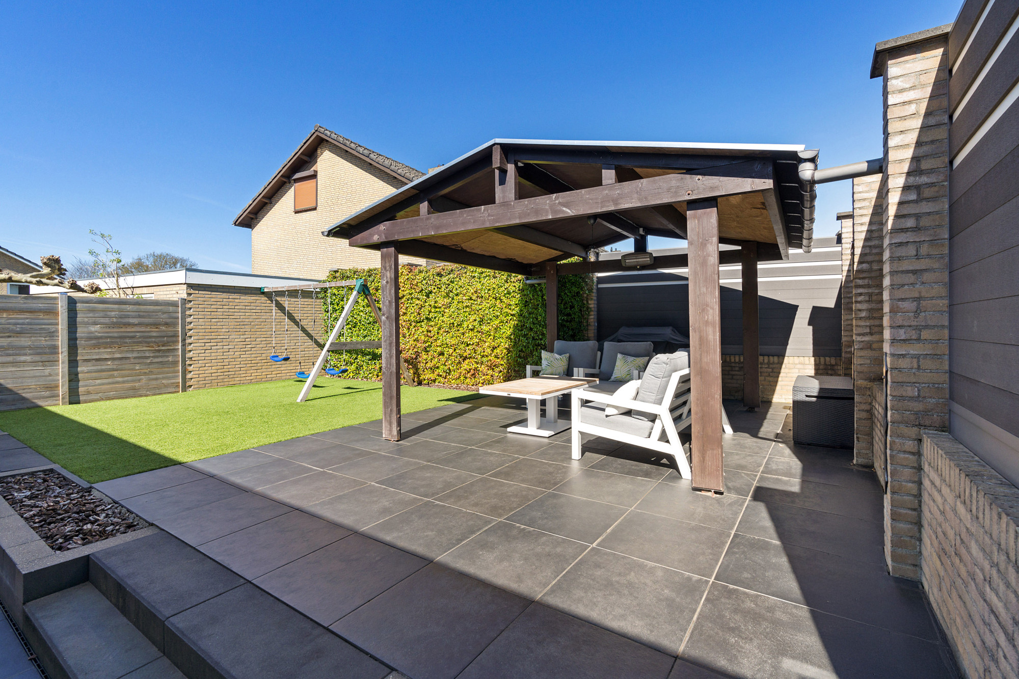 De fraai aangelegde tuin met kunstgras biedt veel privacy en is een heerlijke plek om te ontspannen. Dankzij de overkapping kun je hier het hele jaar door genieten van het buitenleven.