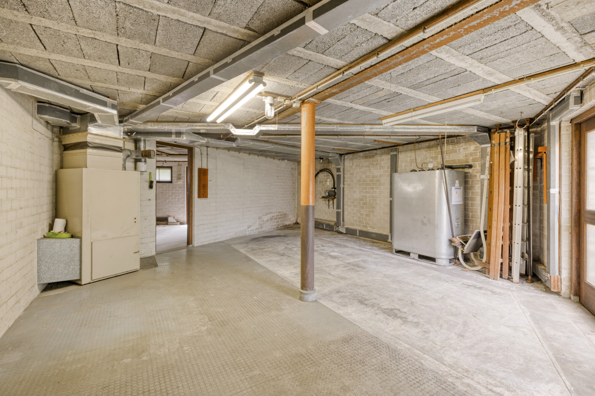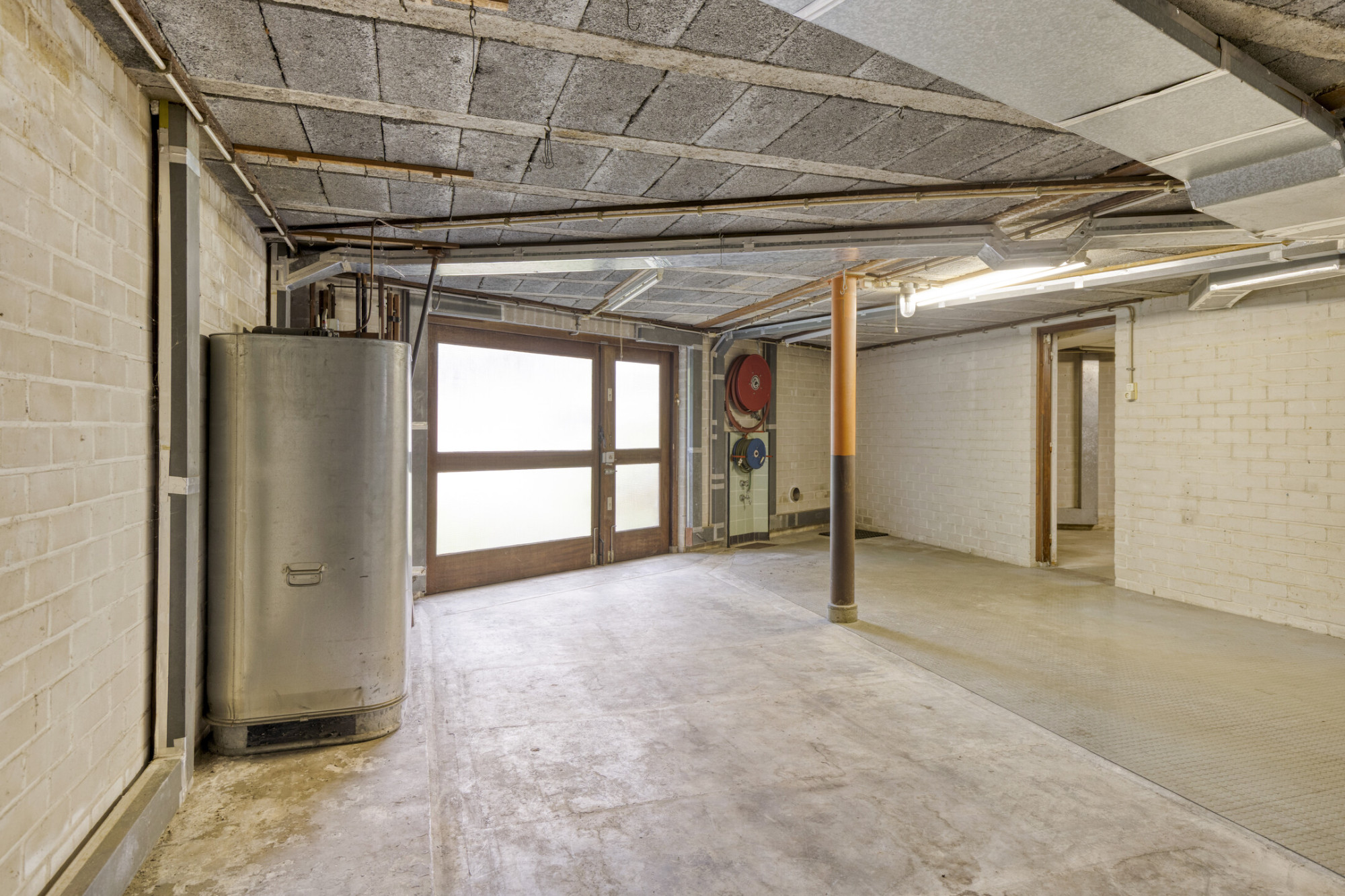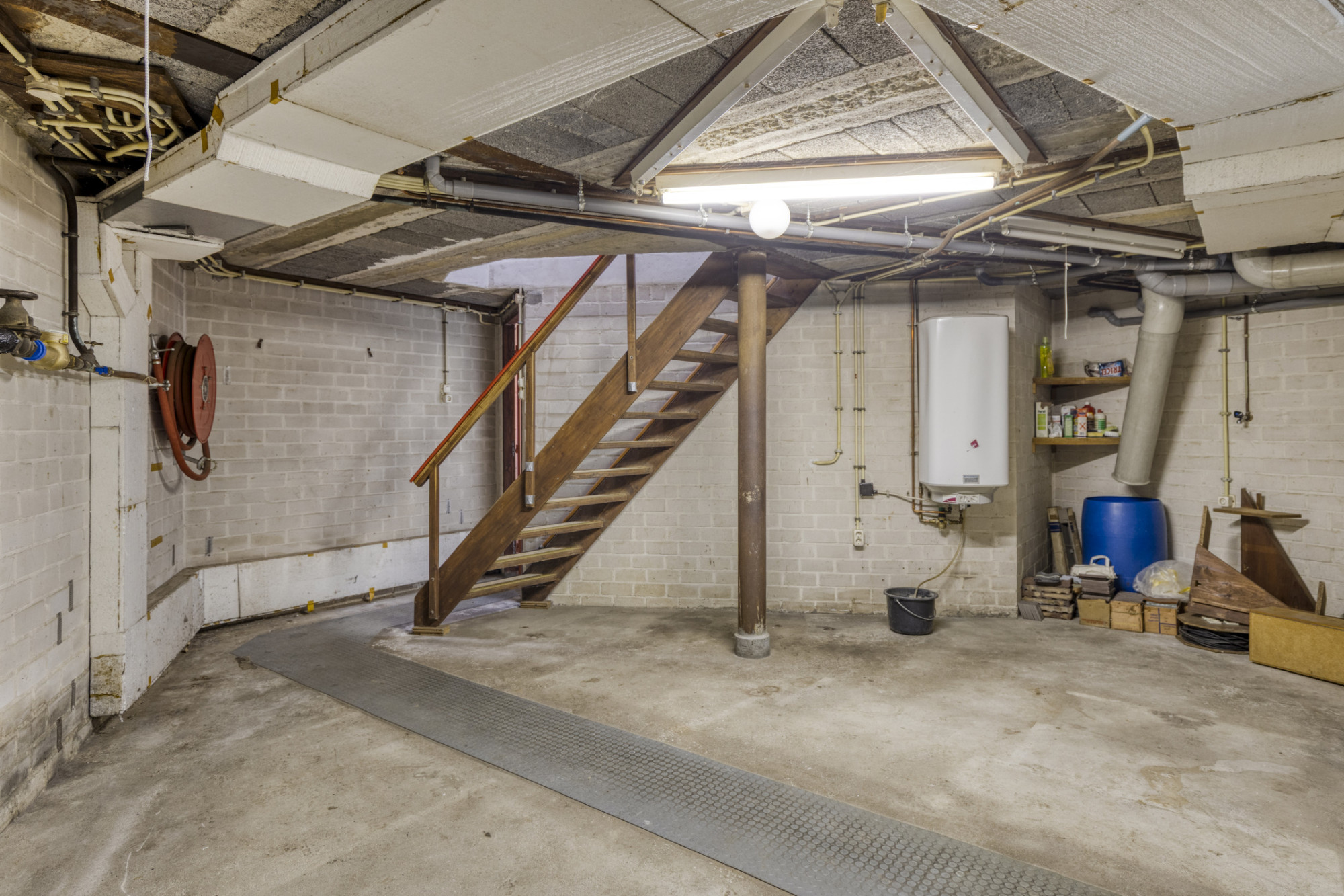 Grote ruimte met boiler en aansluiting/afvoer wasmachine.