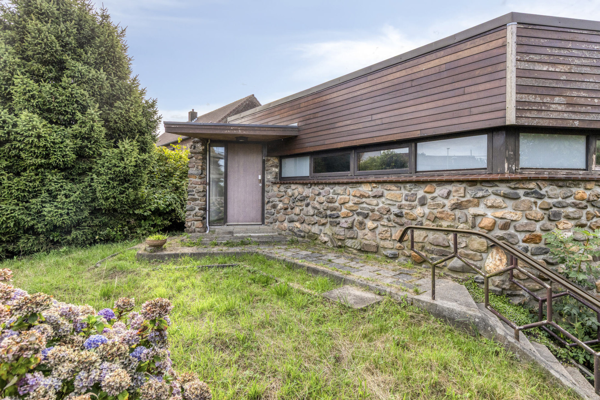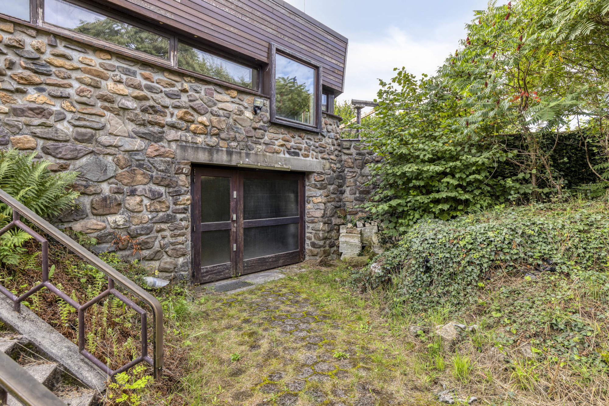 Voortuin met oprit naar de garage. Trap naar de entree van de woning.