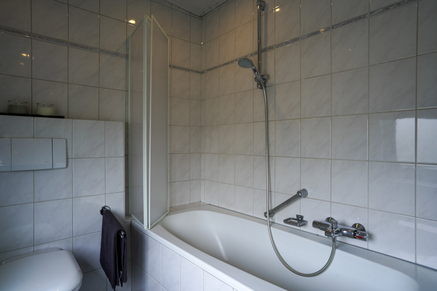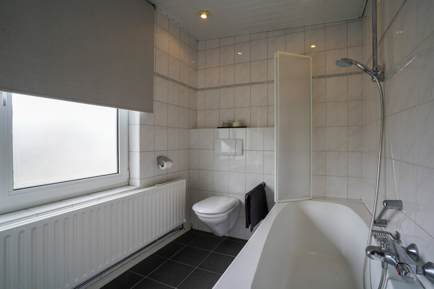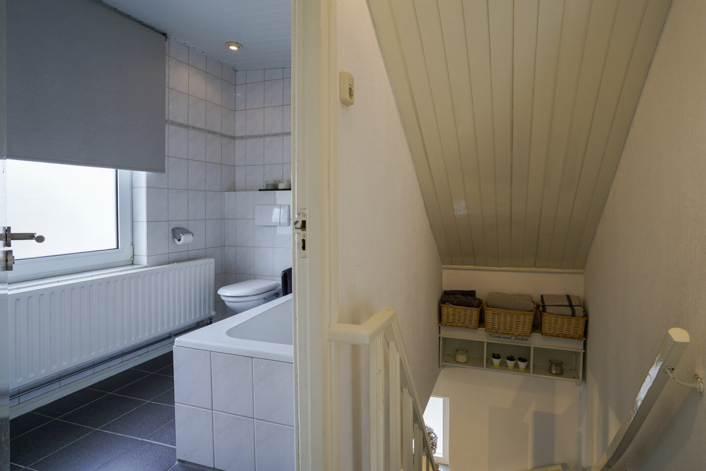 Overloop met toegang naar 3 slaapkamers, de berging en de badkamer. Badkamer (5,5 m2) met ligbad , toilet en badkamermeubel.