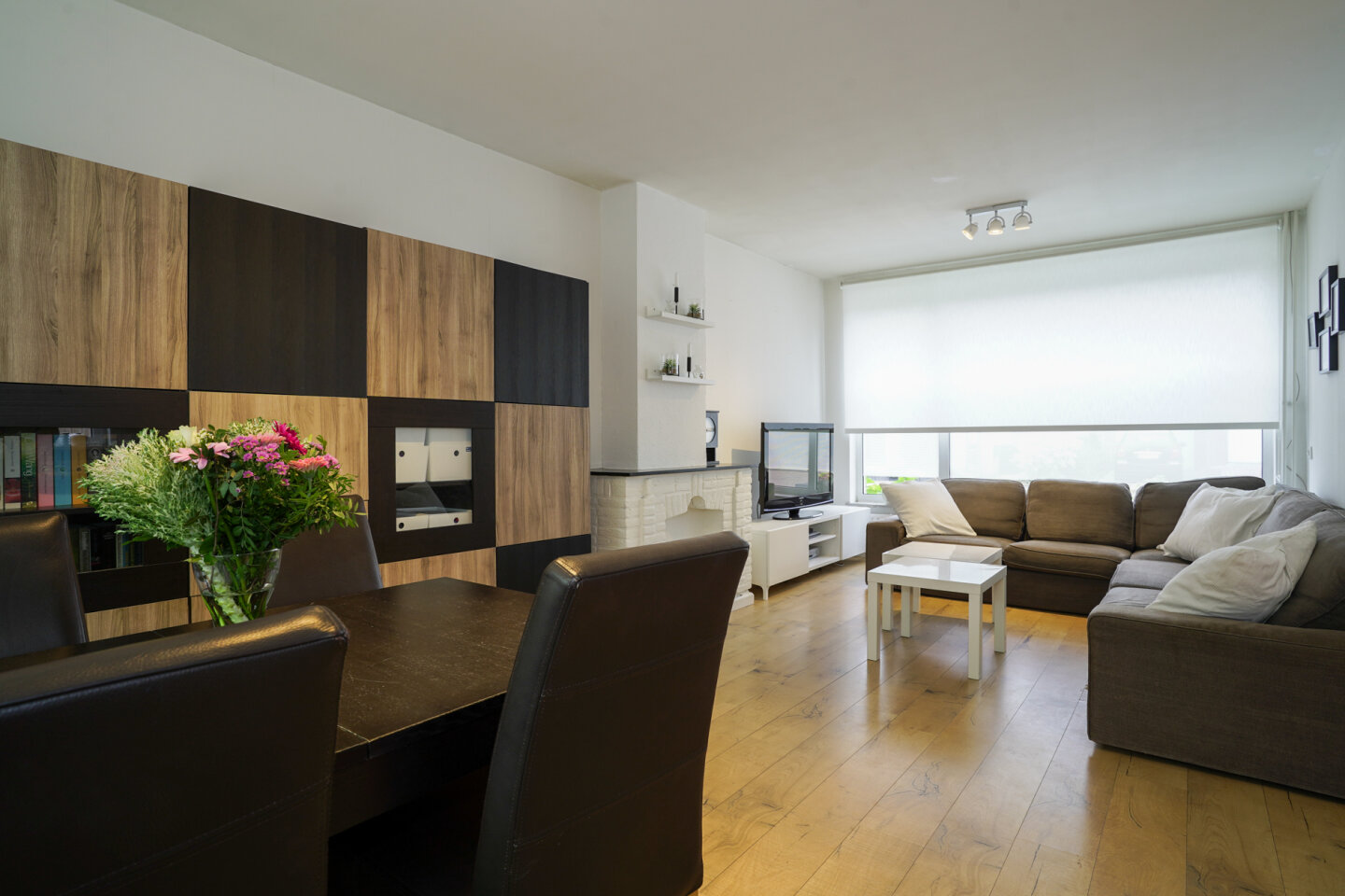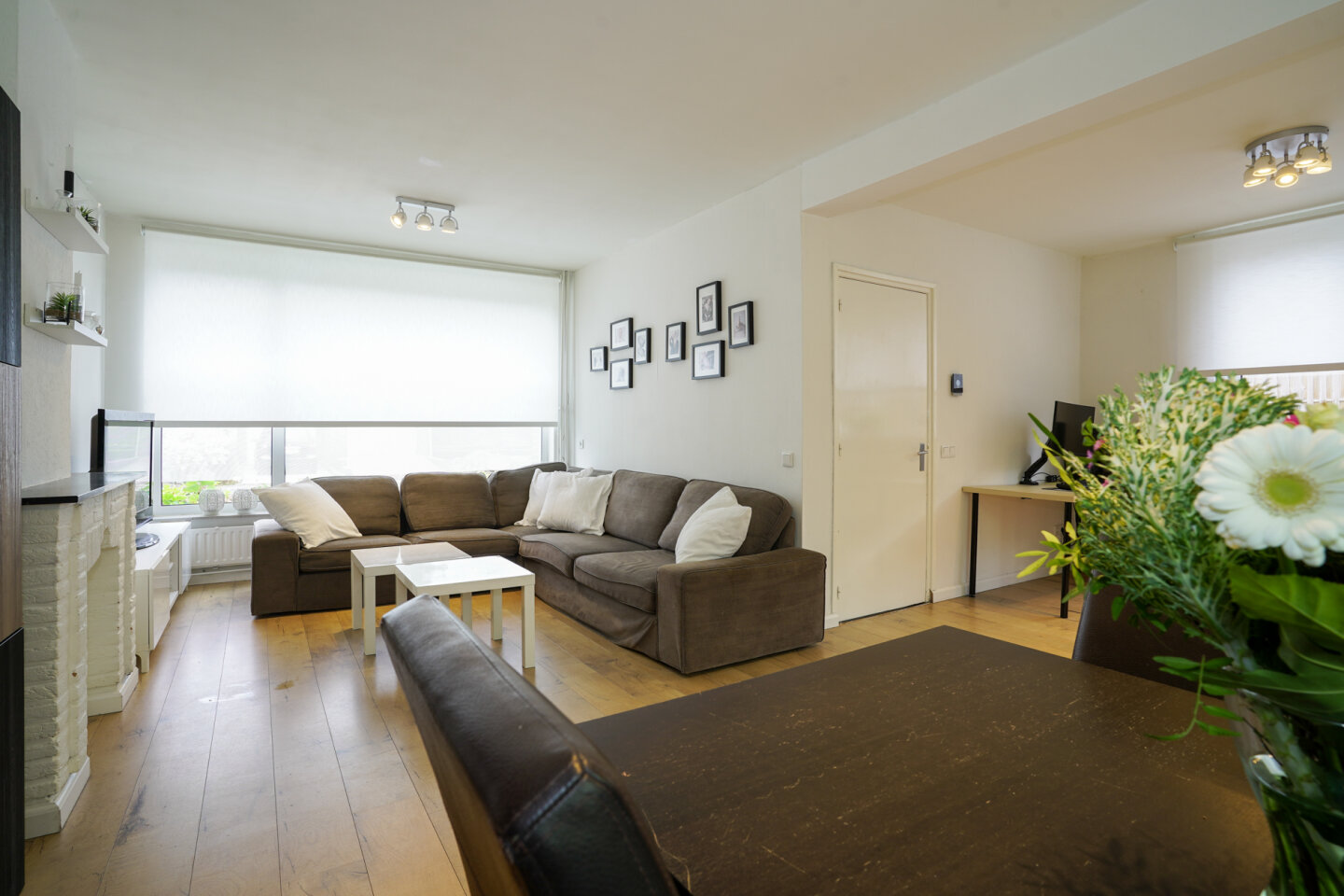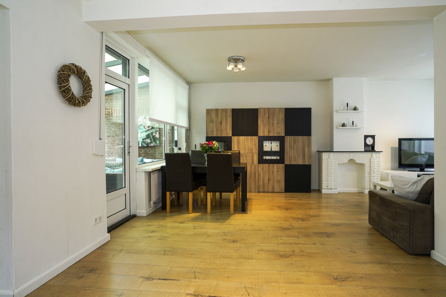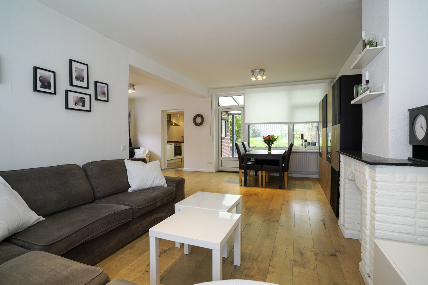 Ruime lichte woonkamer (33 m2) met laminaatvloer. De schouw is nog aanwezig om een kachel of haard te plaatsen. Vanuit de woonkamer en vanuit de keuken is de tuin bereikbaar.