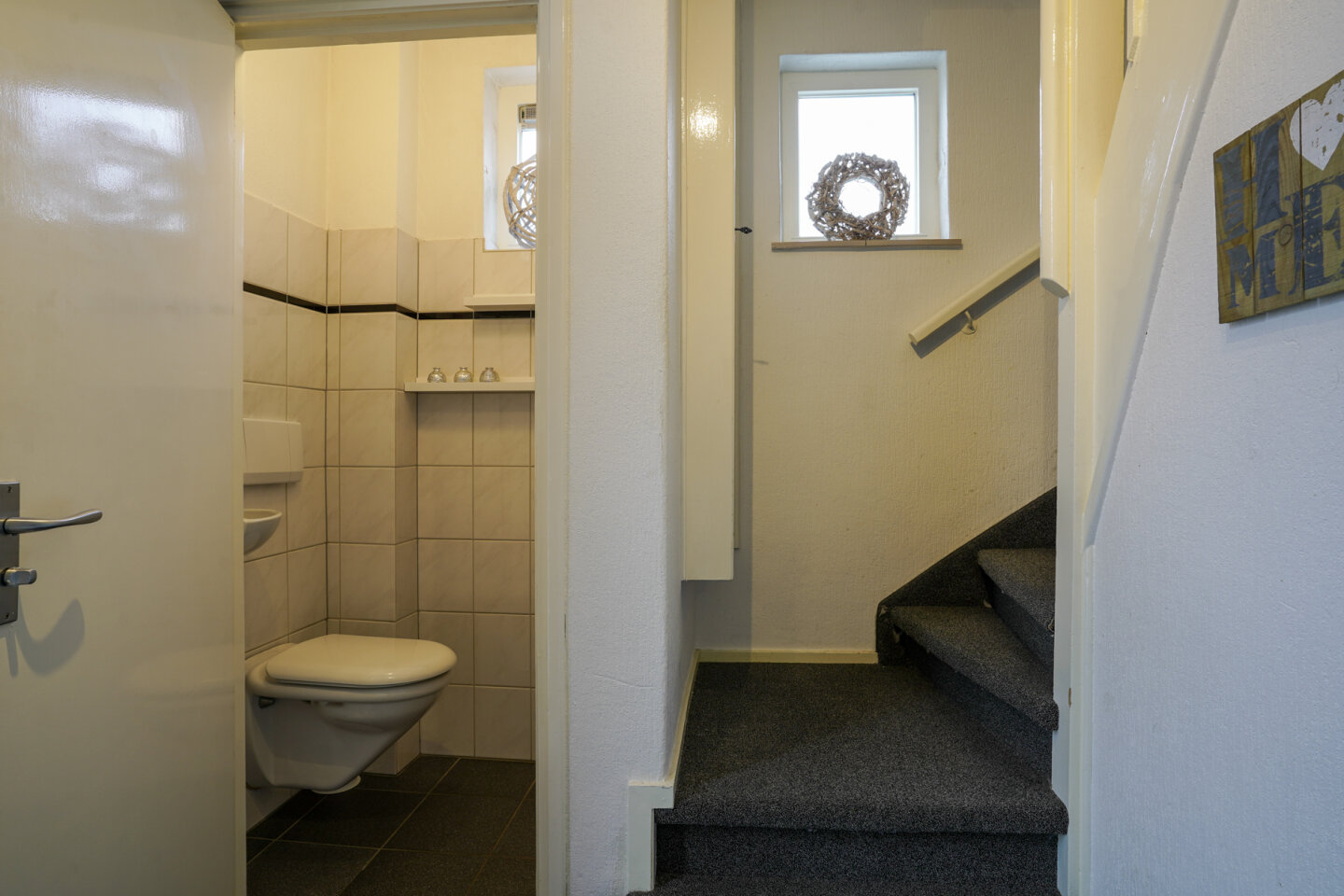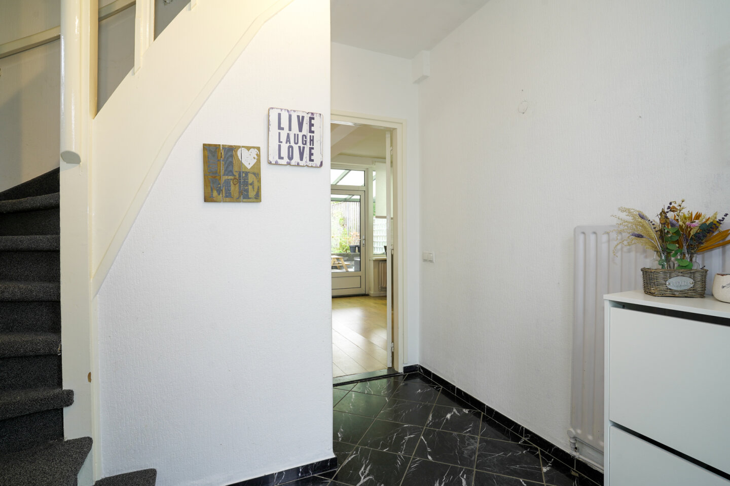 Entree met toegang naar het toilet, trap naar de eerste verdieping en de kelder. Toegang naar de woonkamer.