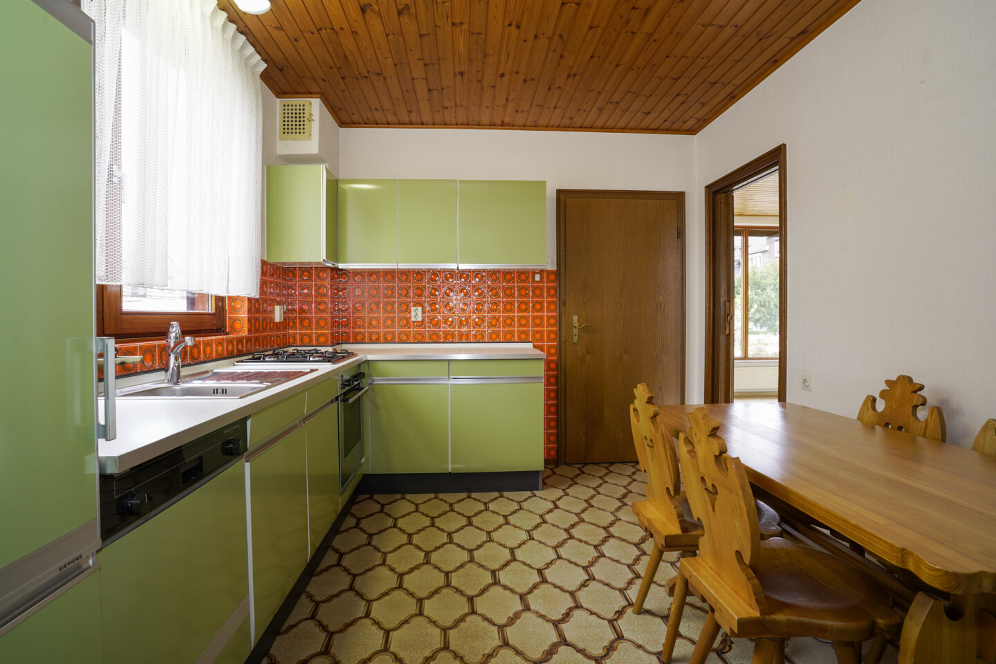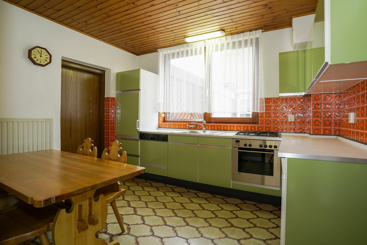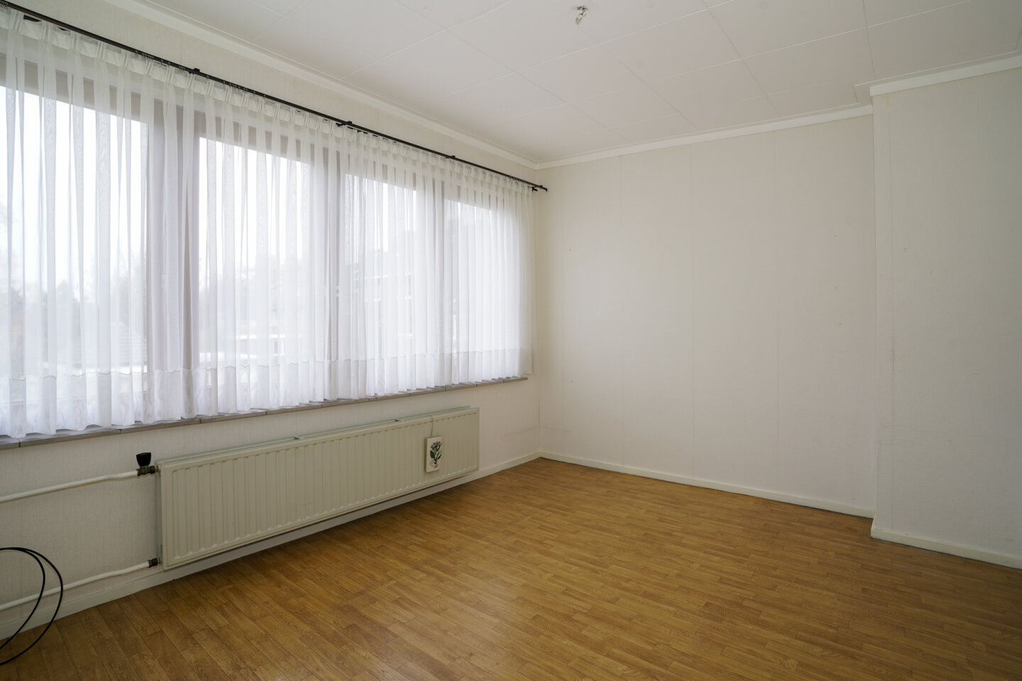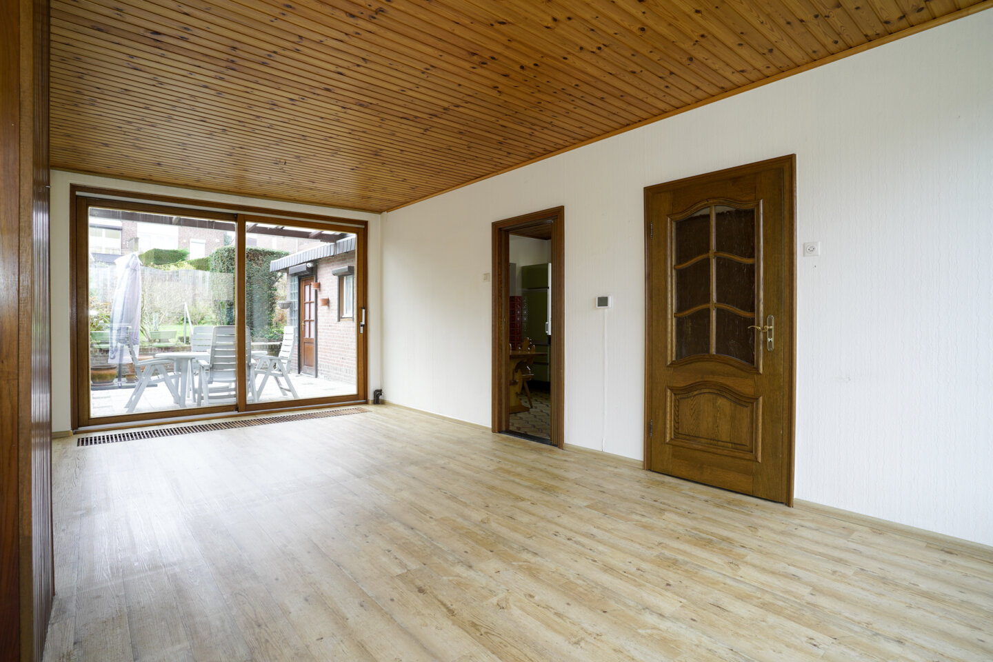 Lichte woonkamer (23 m2) met pvc vloer en schuifpui naar tuin. Keuken (11 m2) is oud maar nog volledig functioneel en is deels voorzien van nieuwe apparatuur koelkast, afwasmachine, afzuigkap, gaskookplaat en oven. Vanuit de keuken is de bijkeuken (10 m2) en garage (18 m2) bereikbaar, beiden zijn voorzien van elektra en verwarming. De tuin is bereikbaar via de woonkamer, bijkeuken en berging bij garage.