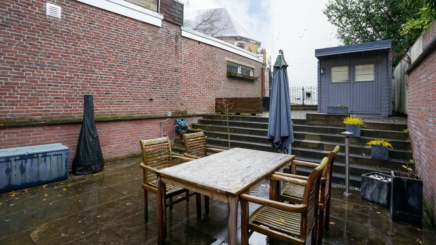 De achtertuin is bereikbaar via een achterom. Bestraat terras. Houten tuinhuis. Ligging op het Noordwesten.