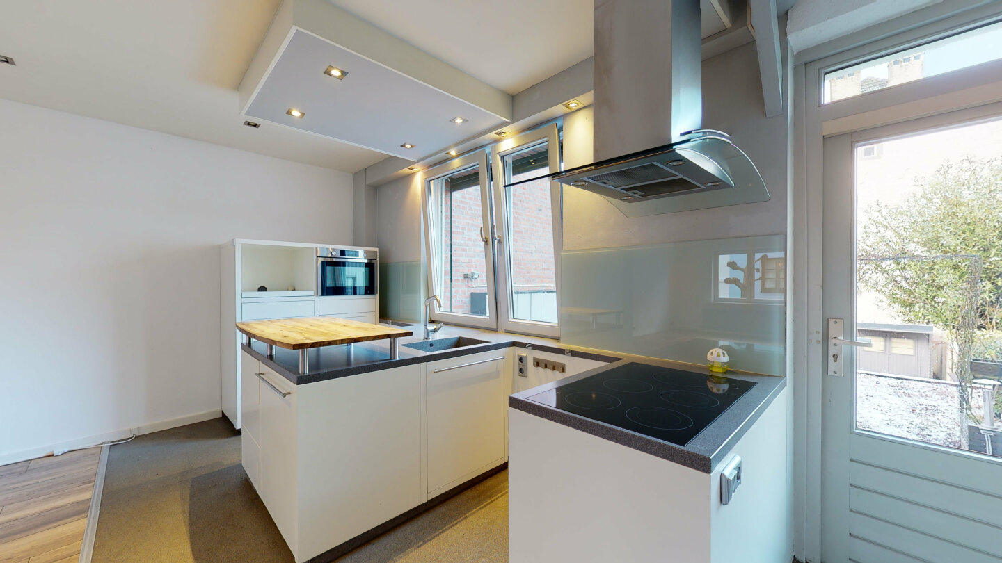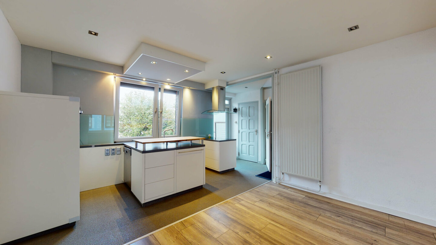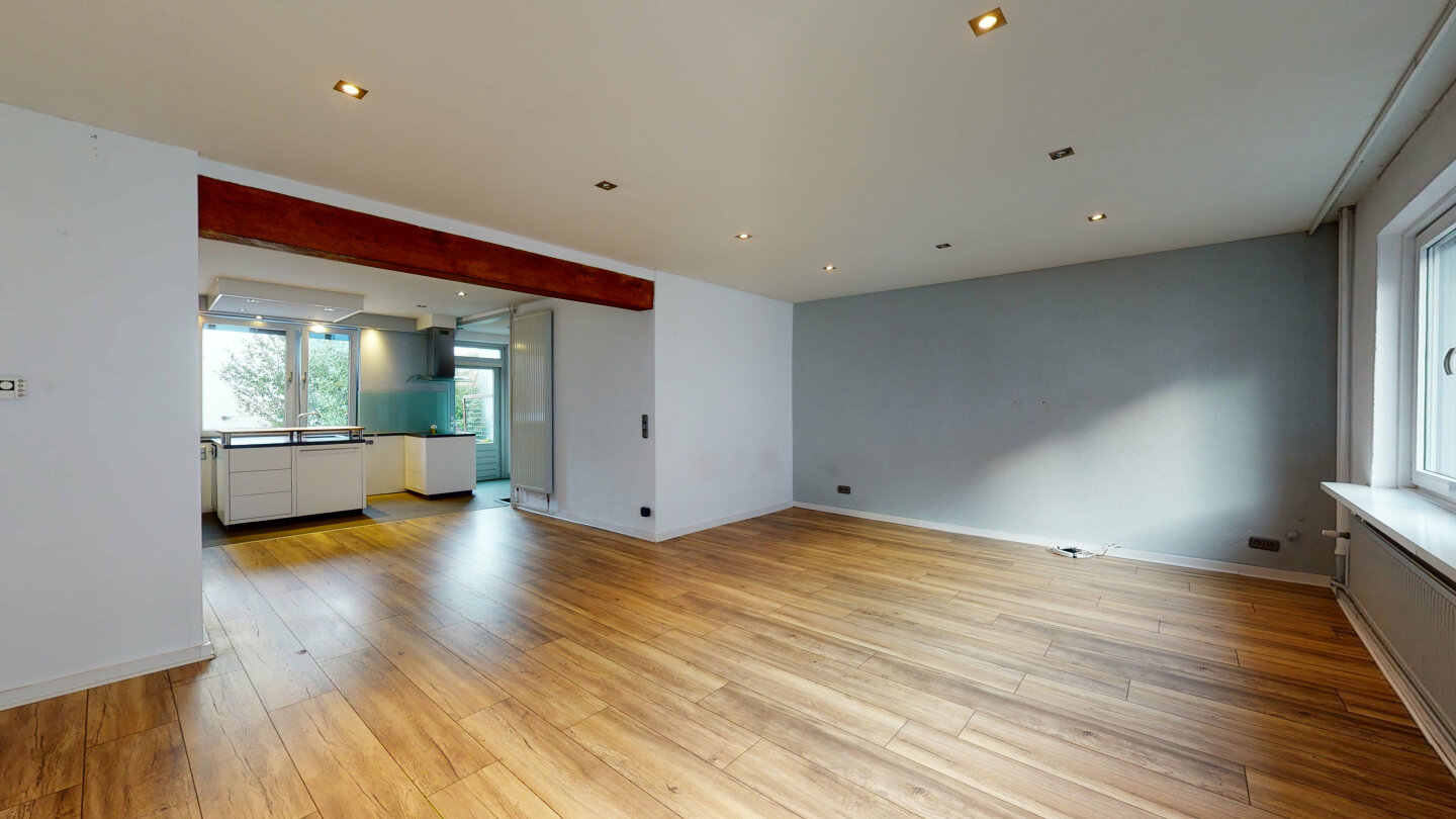 Ruime overloop (4 m2) met toegang naar de woonkamer met open keuken van 50m2. De hoogwaardige open keuken past naadloos in het geheel en is voorzien van alle gebruikelijke keukenapparatuur waarbij een vaatwasser niet ontbreekt. Toegang naar het dakterras aan de achterzijde van de woning.
