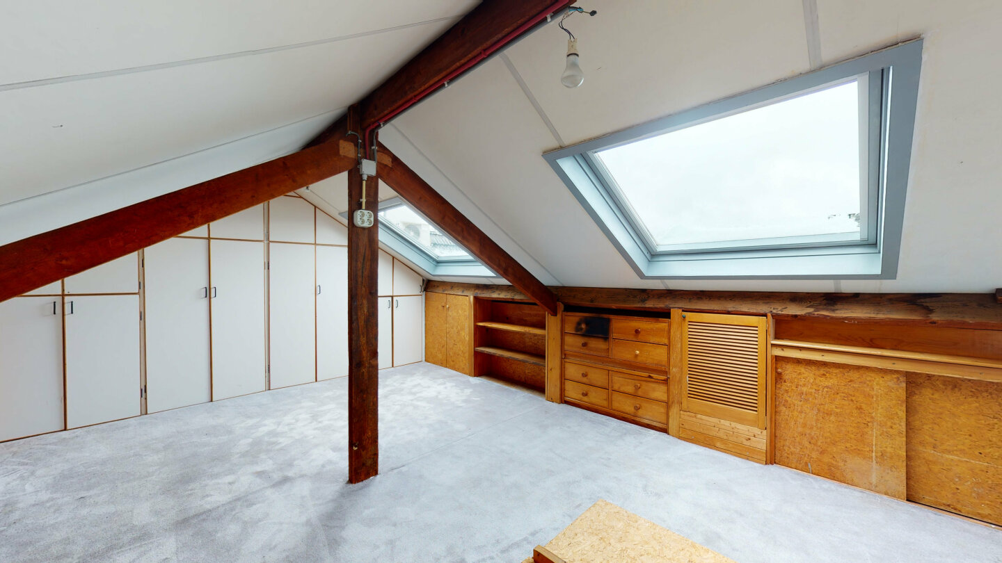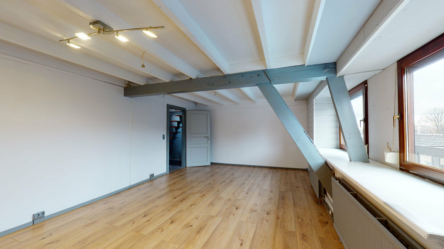 Mooie en ruime dakkamer slaapkamer 4/5 onder het met Unidek beklede dak. De grote Velux ramen zorgen voor meer dan voldoende lichtinval. De inbouwkasten maken de ruimte bijzonder praktisch. Oppervlakte van ca. 20m2.