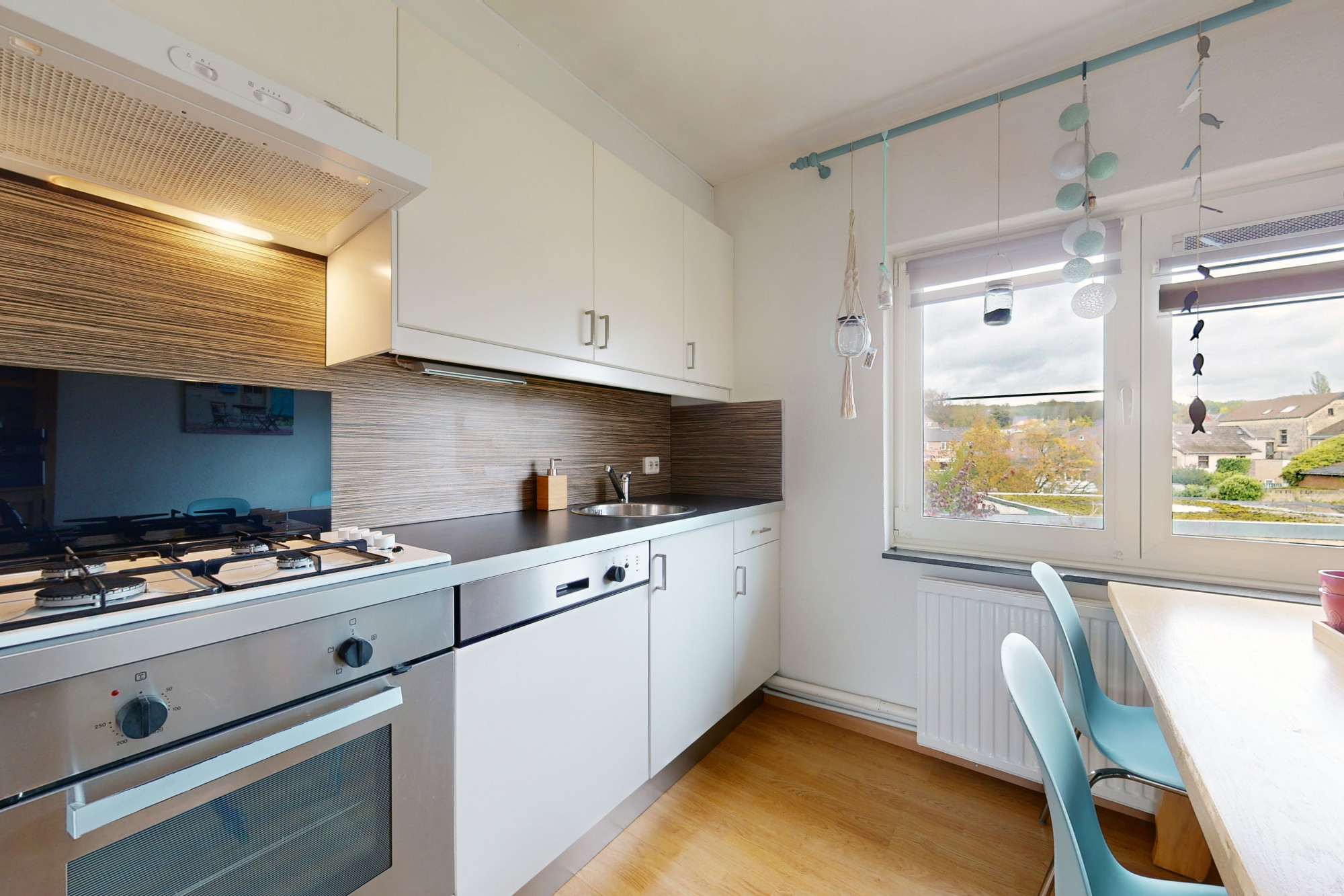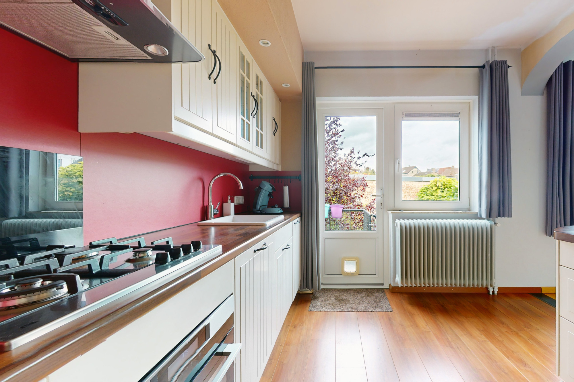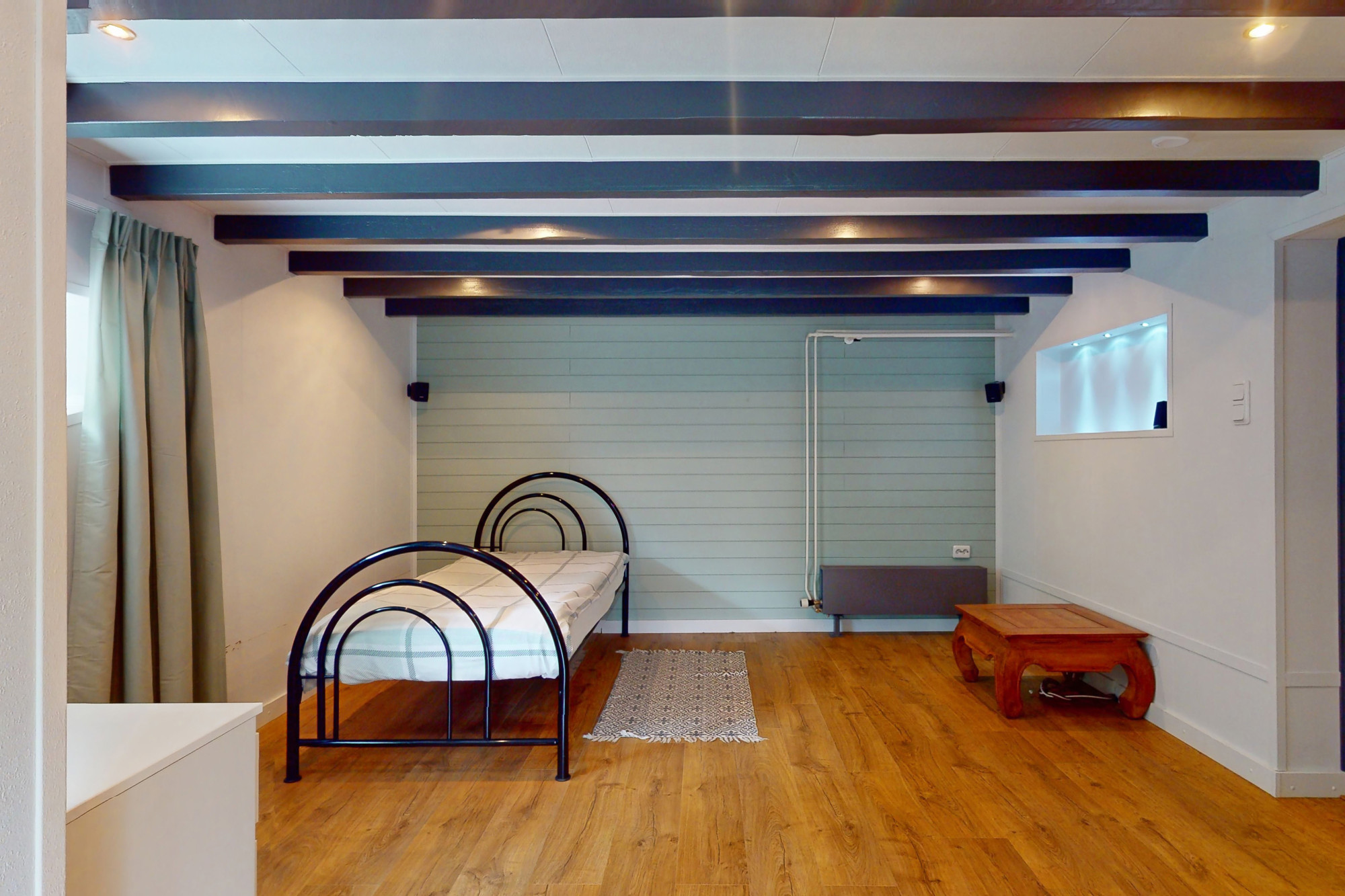 - Slaapkamer 3 (achterzijde links): ca. 8,7 m², momenteel in gebruik als tweede keuken met inbouwapparatuur zoals een 4-pits gasfornuis, oven, vaatwasser en koelkast.