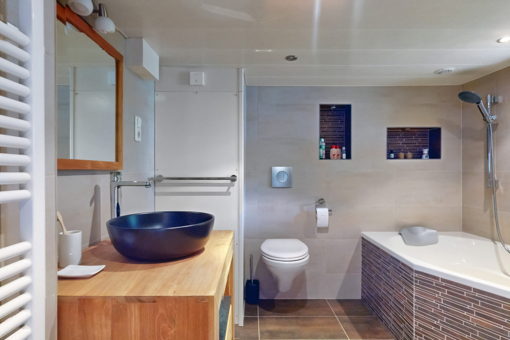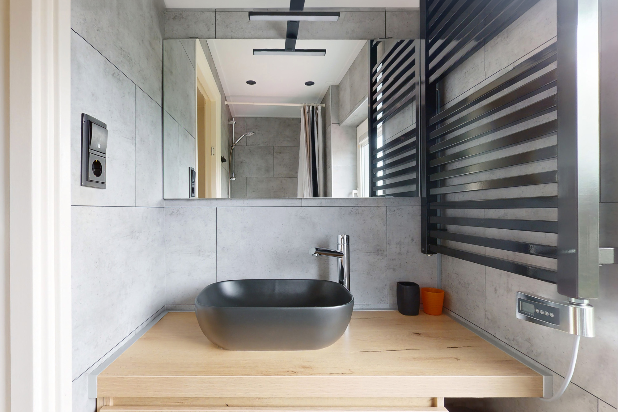 De recent vernieuwde badkamer (ca. 2,5 m²) is voorzien van een inloopdouche, wastafelmeubel en elektrische radiator.