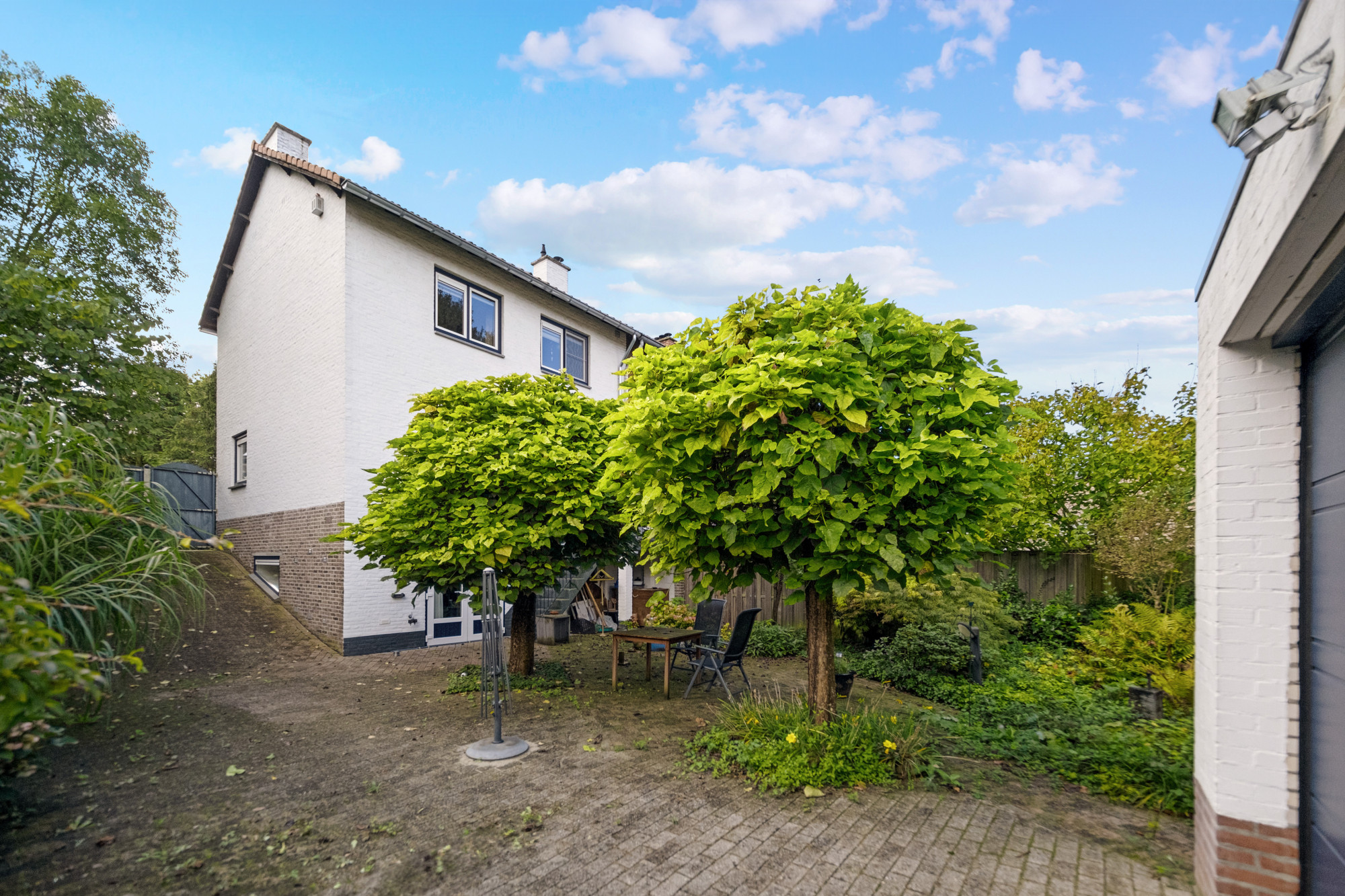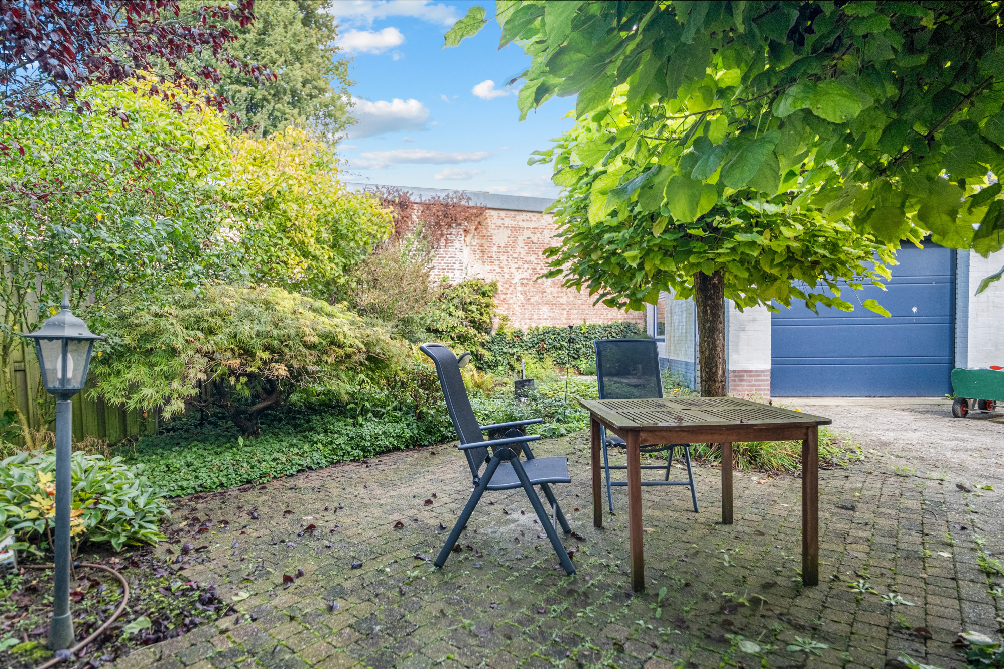 De onderhoudsvriendelijke, noordelijk gelegen achtertuin is volledig bestraat en biedt voldoende ruimte voor ontspanning. Er is een ruime oprit en een vrijstaande stenen garage (5,23 m x 3,28 m) met elektrische sectionaalpoort. Naast de garage bevindt zich een houten berging (2,95 m x 1,95 m), ideaal voor extra opslagruimte.