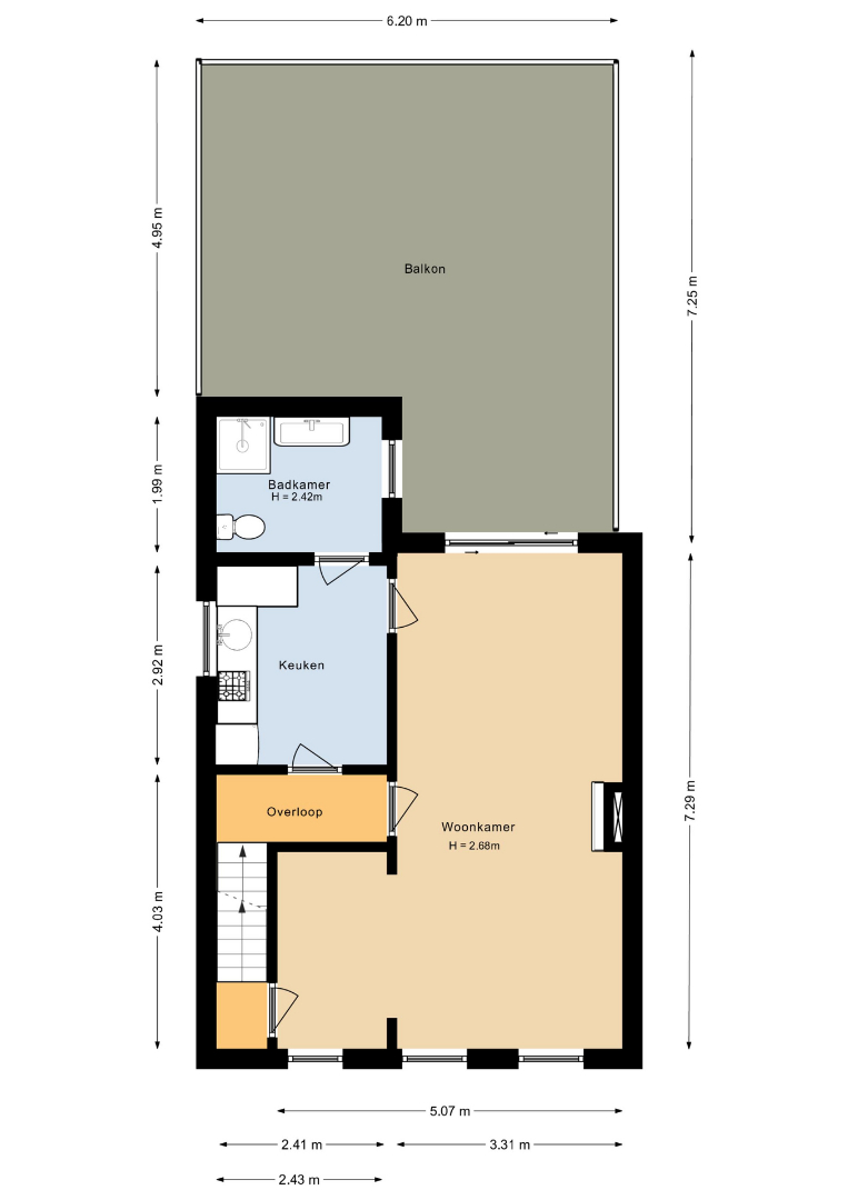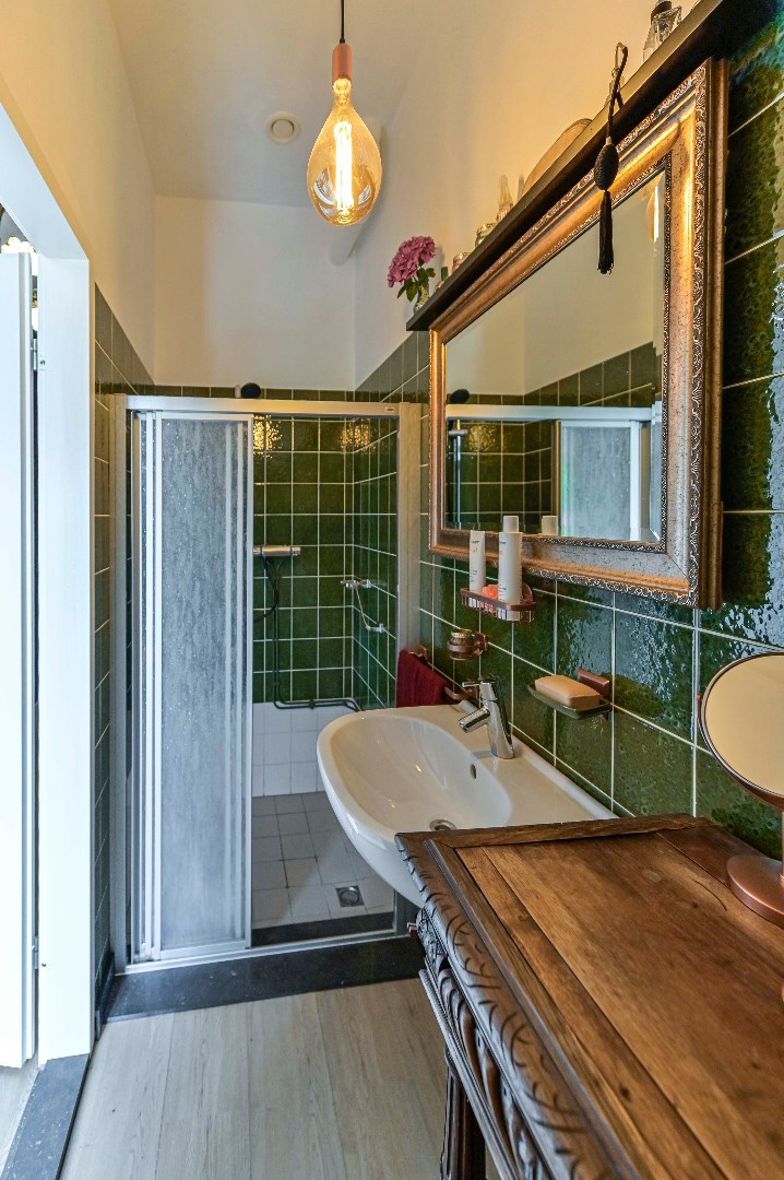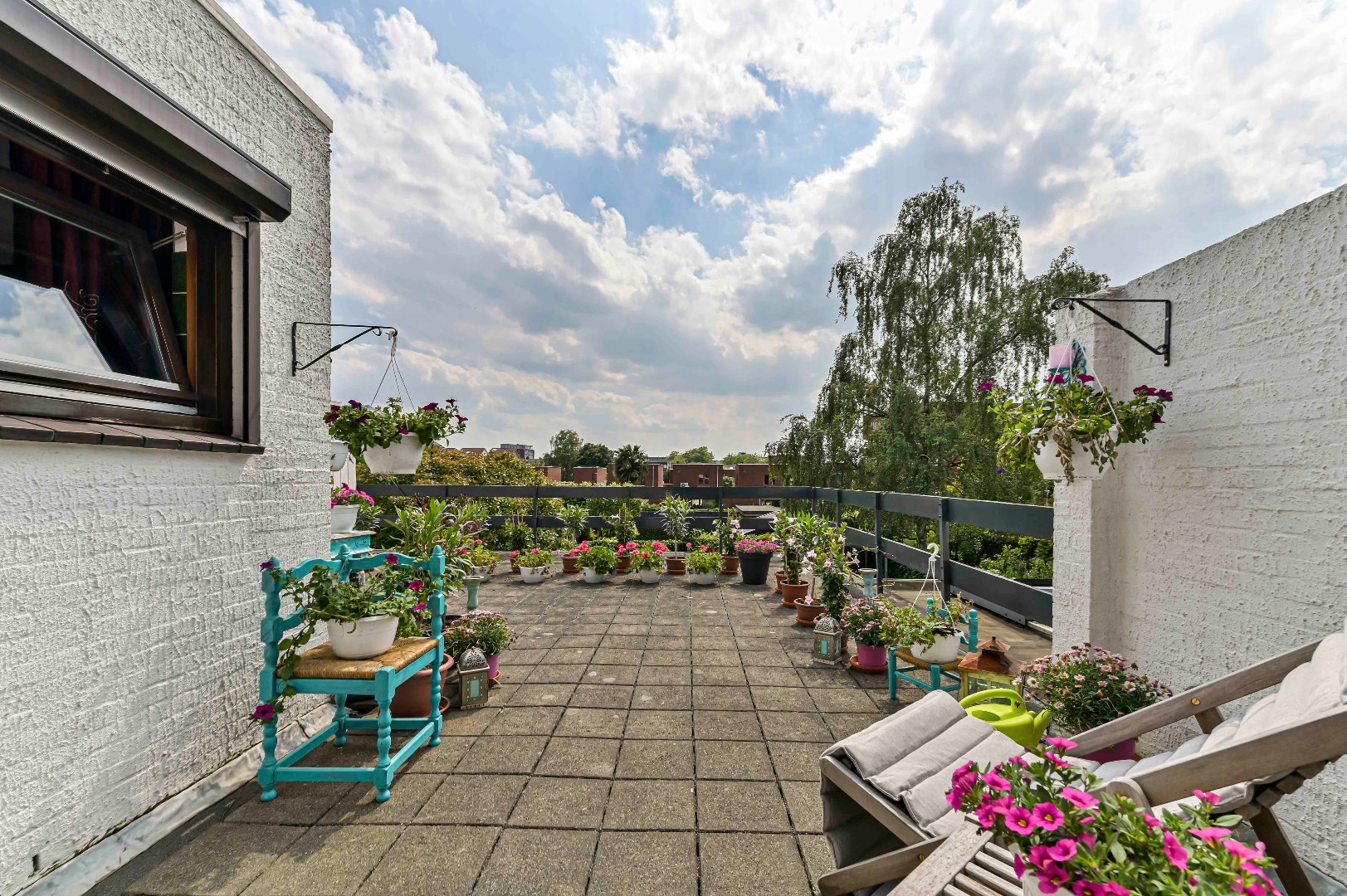1ste verdieping: overloop. L-vormige woonkamer met toegang tot een ruime op het zuiden gelegen dakterras. De achtergevel op zowel de begane grond als de eerste etage (dakterras) zijn voorzien van elektrisch bedienbare zonneschermen. 2de keuken met gaskookplaat, afzuigkap, koelkast en spoelbak. 2de badkamer met douche, toilet en witgoedaansluiting.