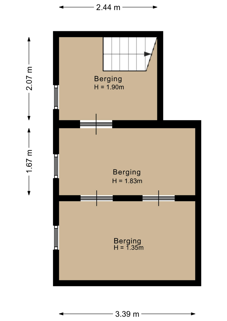 Indeling: twee kelderruimtes waarvan een bereikbaar vanuit de hal en de andere vanuit de tuin.