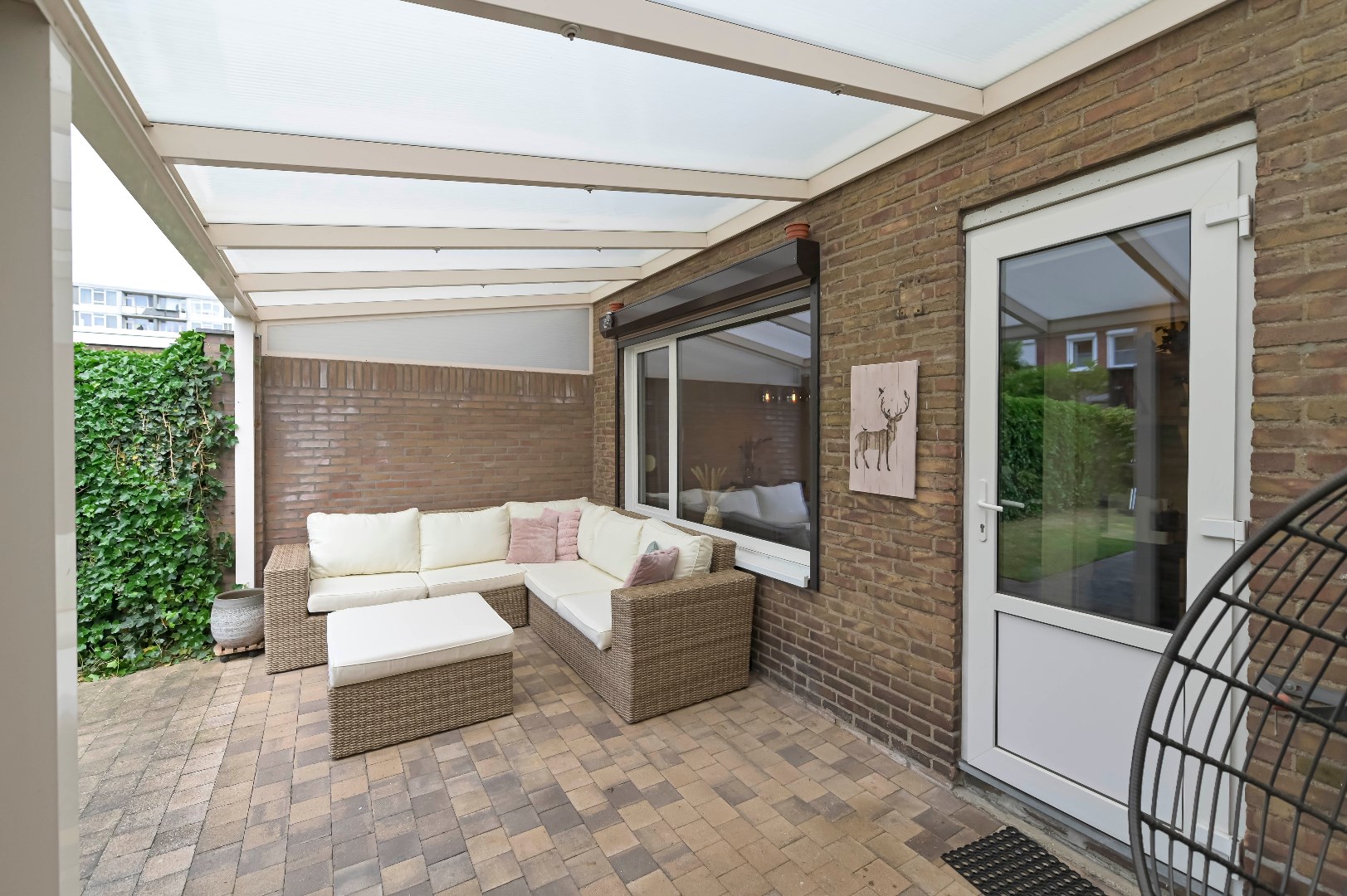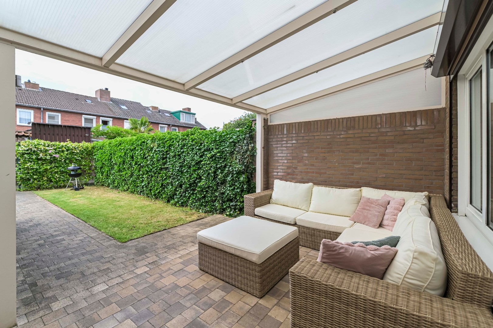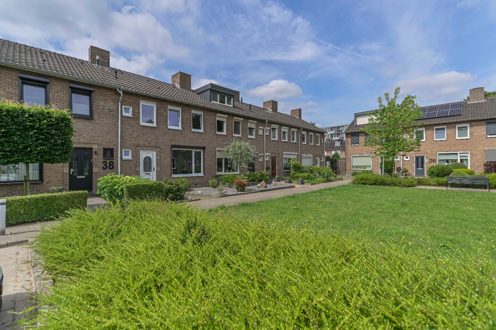 In goede staat door middel van 10 zonnepanelen in 2021 verduurzaamde tussenwoning welke in Venlo Oost aan hofje is gelegen met tuin op het zuidwesten met vrije achterom, aluminium overdekt terras (2008) met inbouwspotjes en aparte berging waarvan de buiten muren van binnen geïsoleerd zijn met PIR + OSB platen.