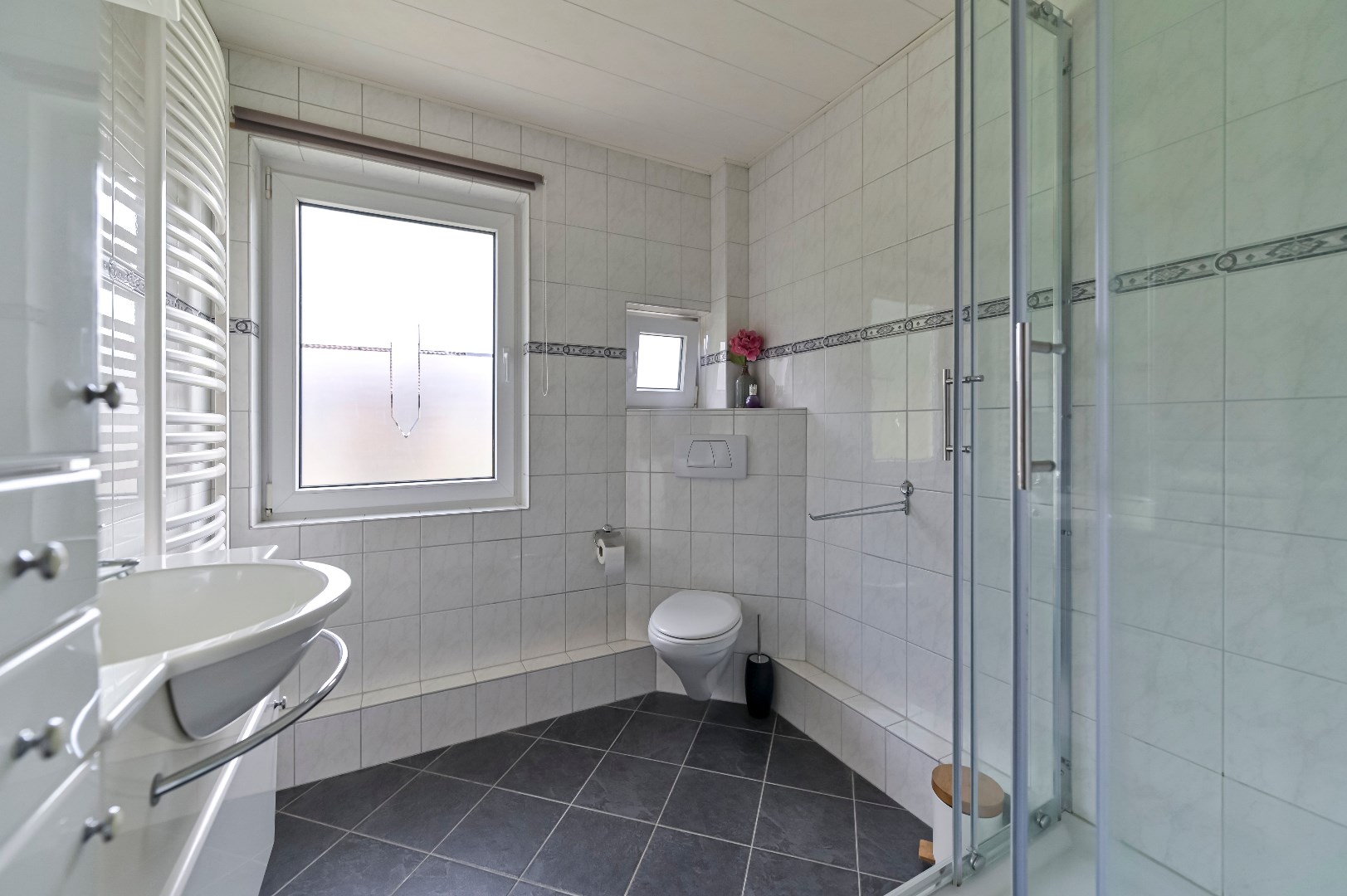 1ste verdieping: overloop met laminaatvloer en muurkast (de muurkast is de voormalige badkamer welke uitermate geschikt is voor het plaatsen van het witgoed). 3 slaapkamers met laminaatvloer waarvan 2 met muurkast. Moderne badkamer (2004) met douche, wastafel, 2de zwevend toilet, designradiator.