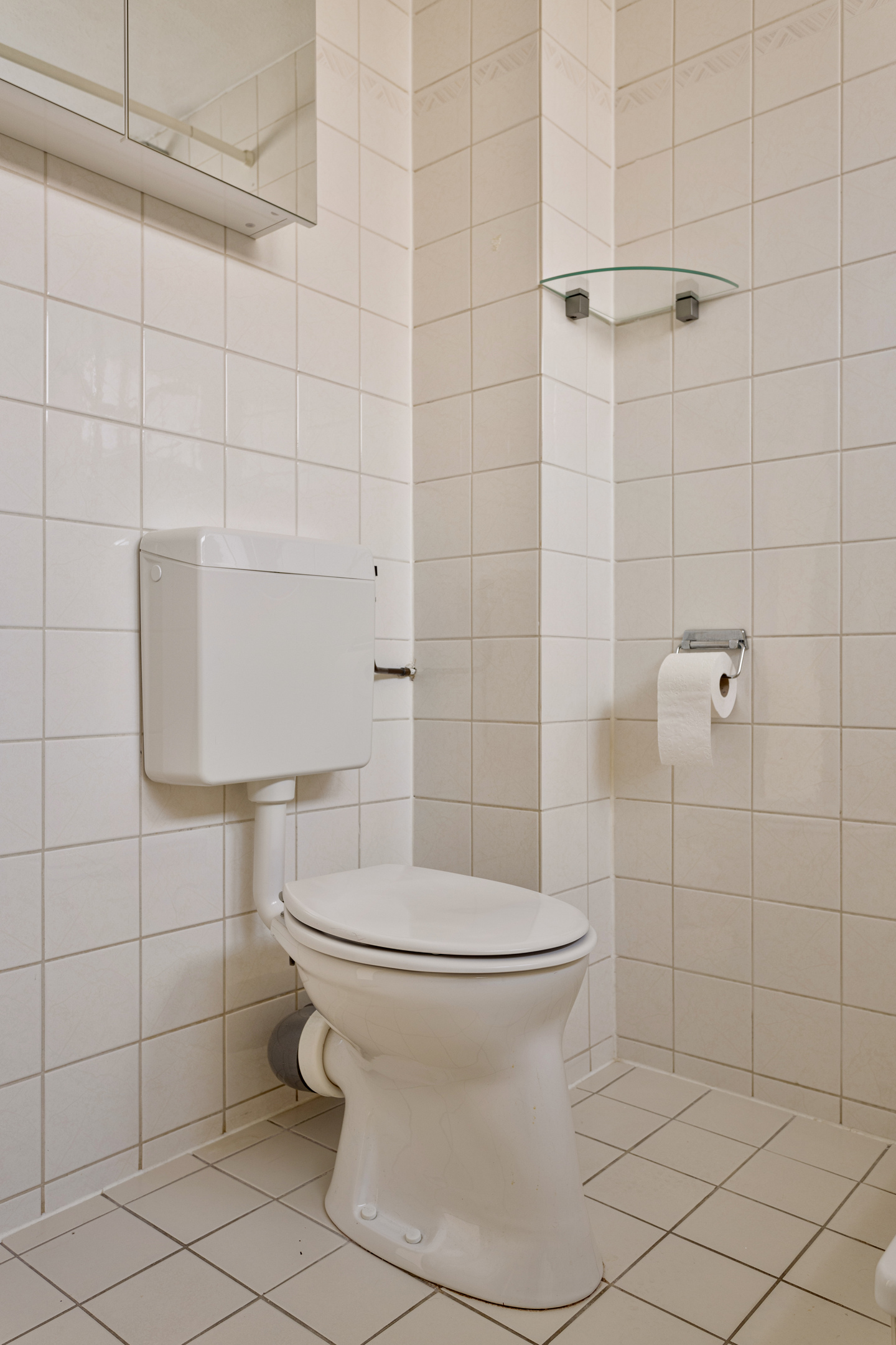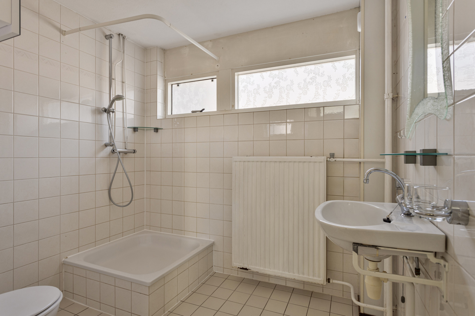 De badkamer is voorzien van een douche, toilet en wastafel.