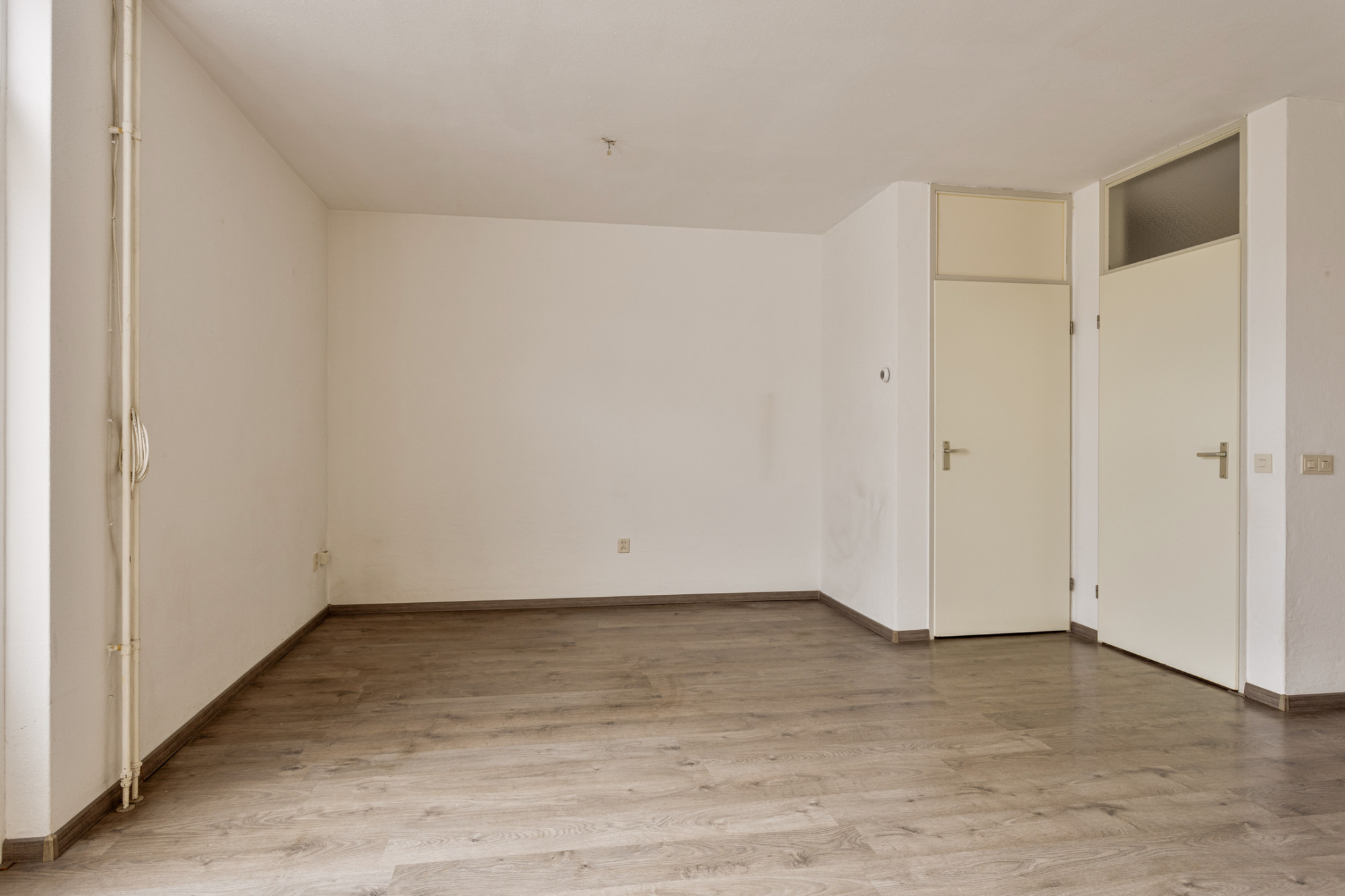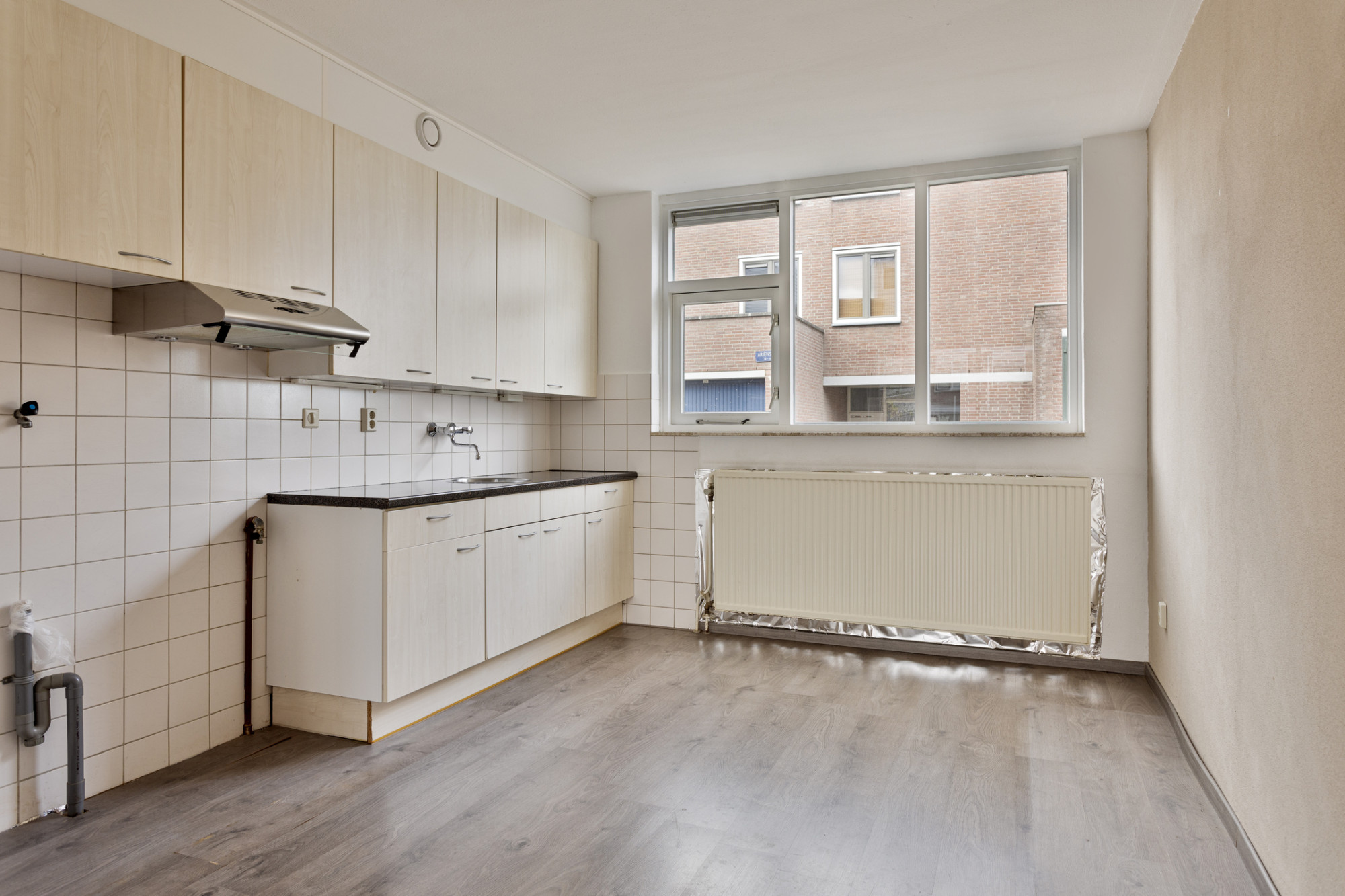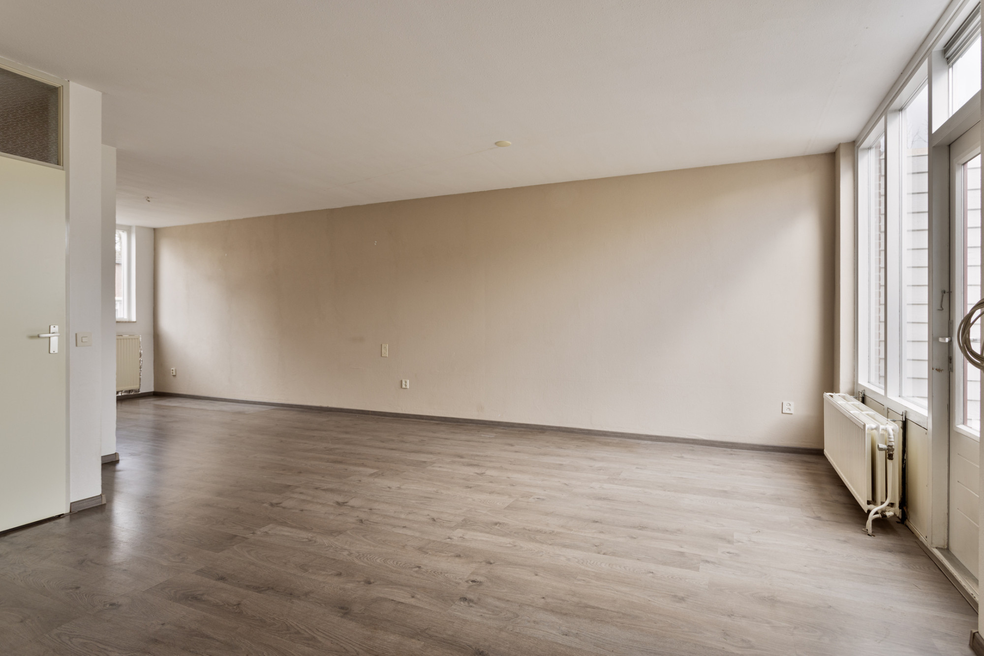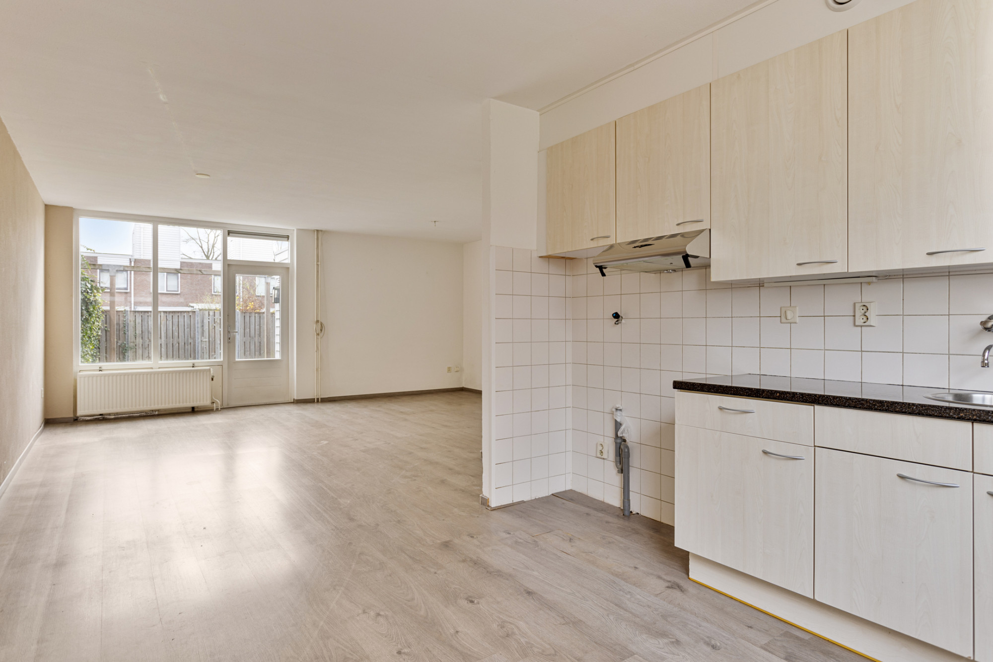 De ruime woonkamer heeft een oppervlakte van circa 28 m² en biedt u directe toegang tot de achtertuin. Door de grote raampartijen aan de voor- en achterzijde van de woning is de begane grond voorzien van veel daglichttoetreding. De open keuken aan de voorzijde van de woning is voorzien van een eenvoudig keukenblok zonder inbouwapparatuur.