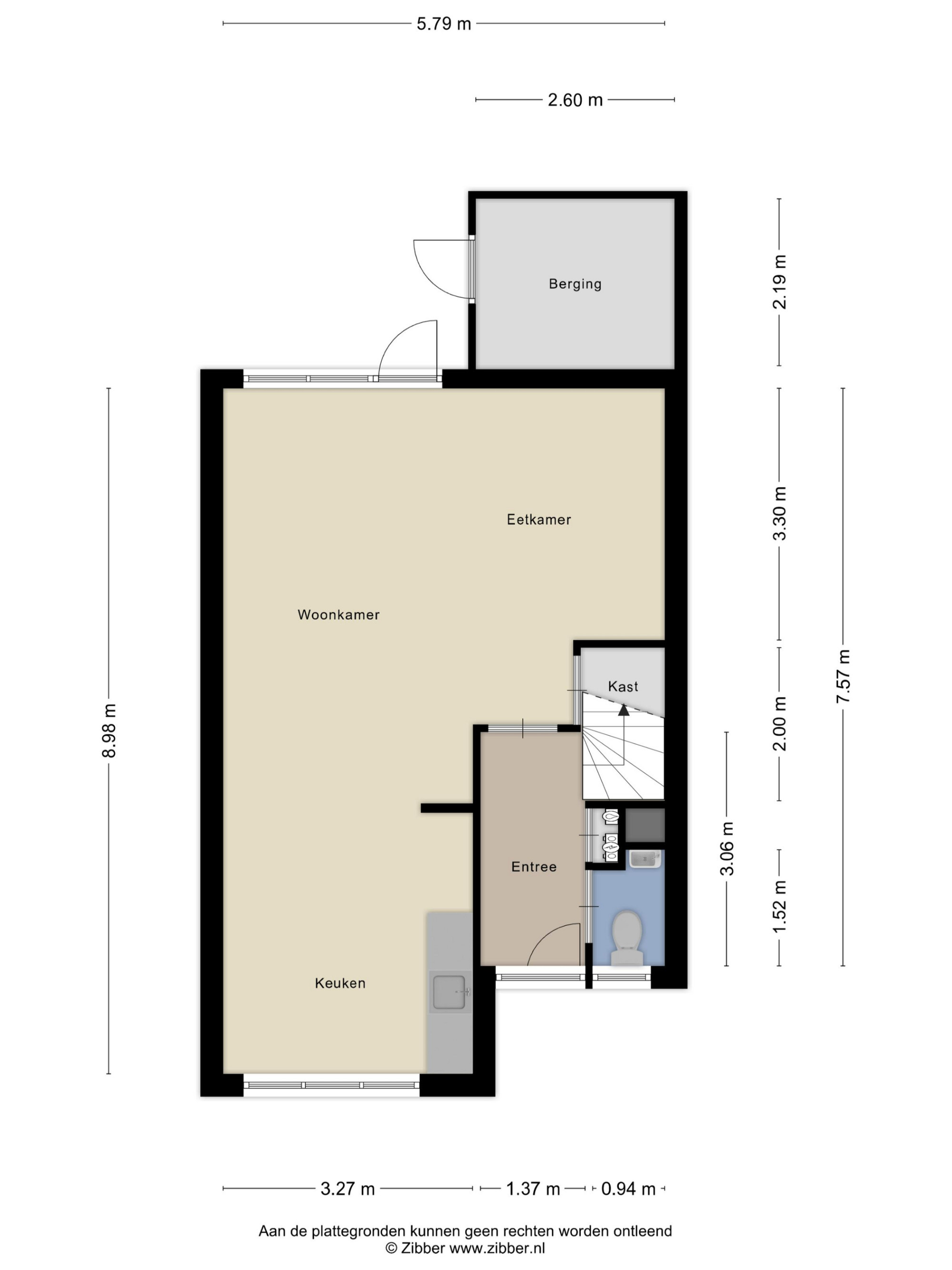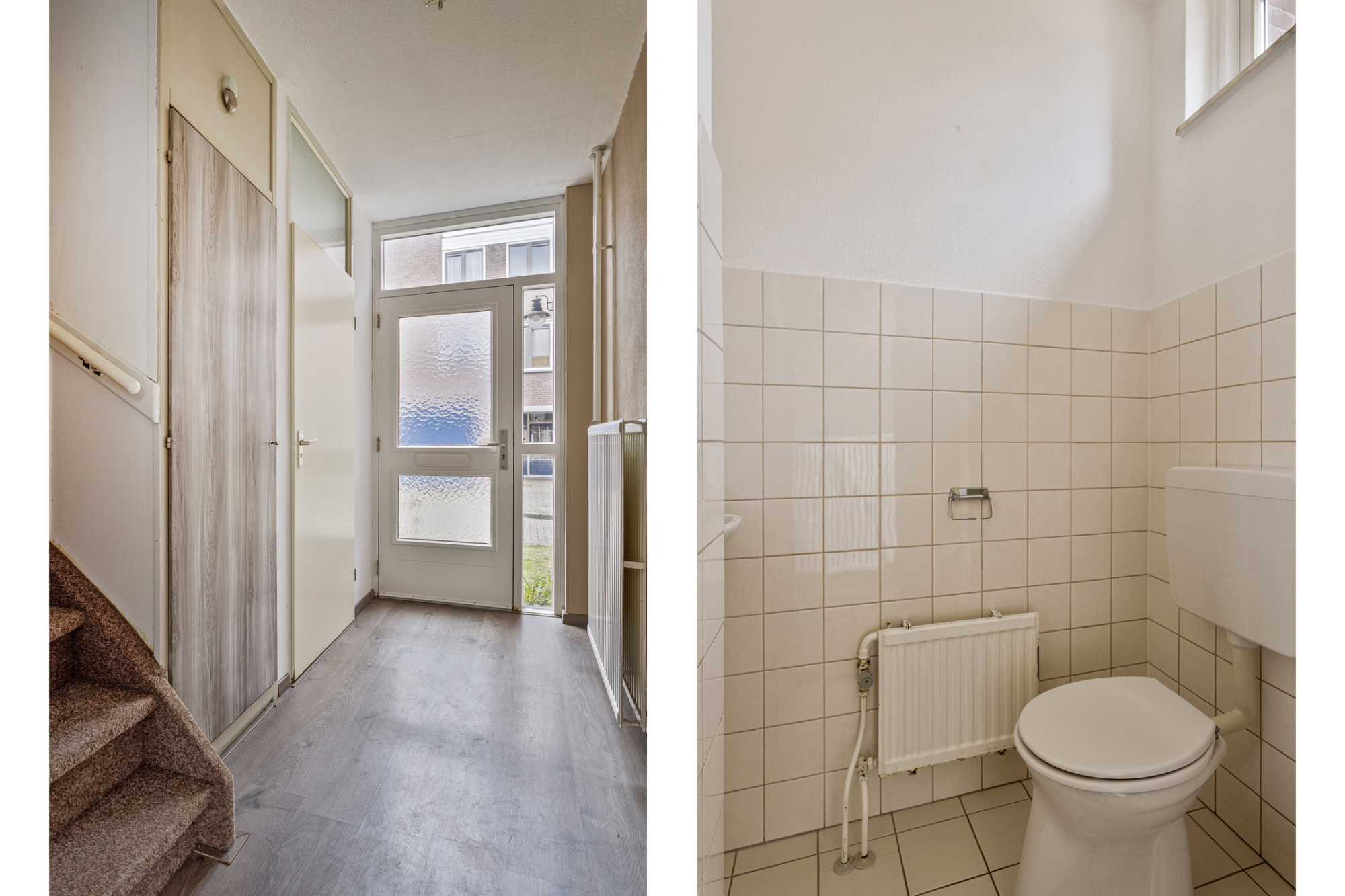 U betreedt de woning in de hal, welke toegang biedt tot de halfhoog betegelde toiletruimte, de meterkast, de trapopgang tot de verdieping en de woonkamer.