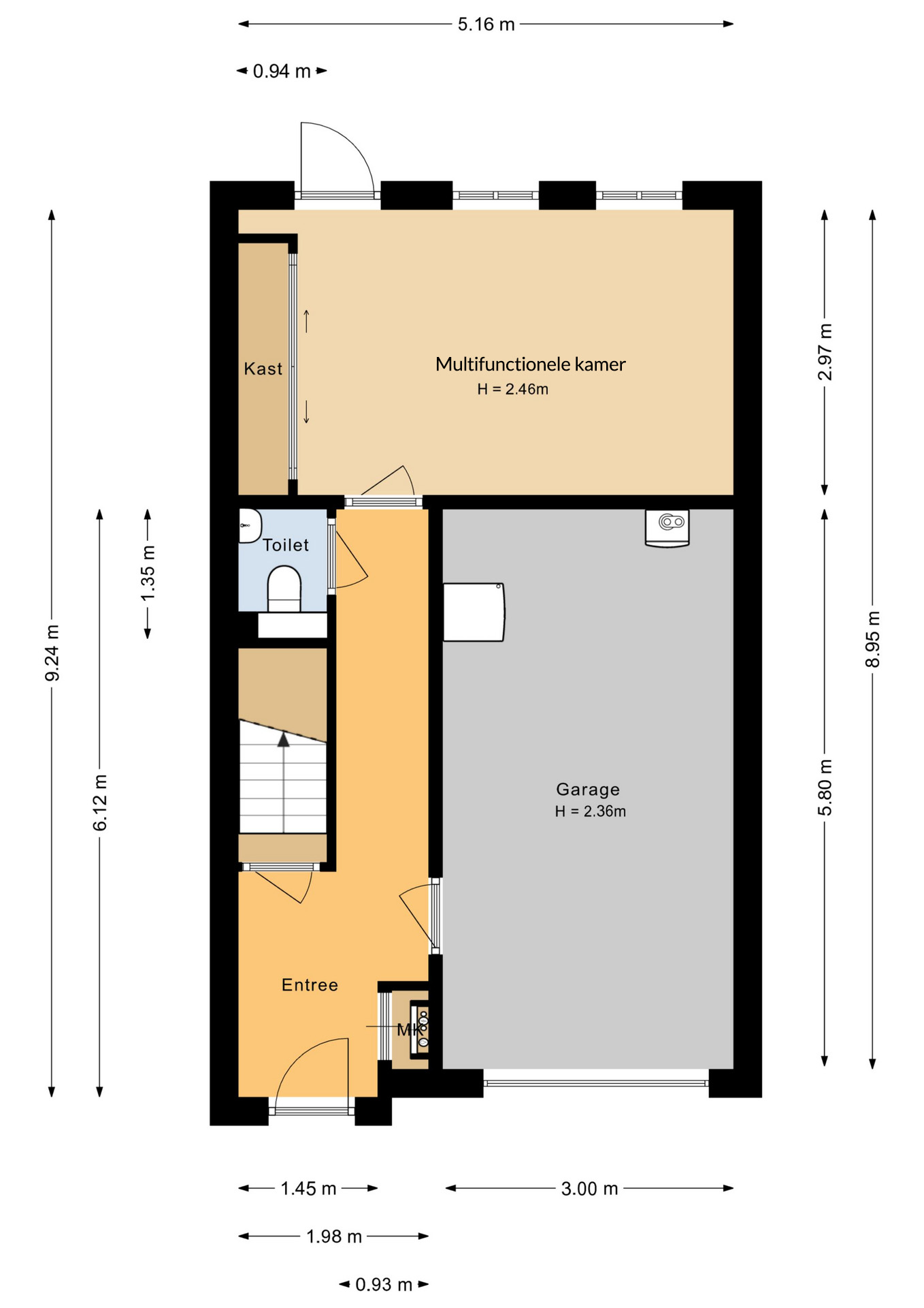 Entree met gang en toiletruimte met hangend toilet en fonteintje. Vanuit de gang is er toegang tot de royale garage met elektrische rolpoort (ca. 18 m2). Tevens ligt er op de begane grond een slaap/hobby/werkkamer van (ca. 13.5 m2) welke ook directe toegang biedt naar de tuin.