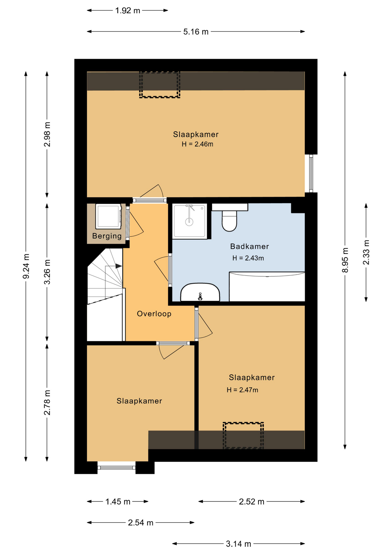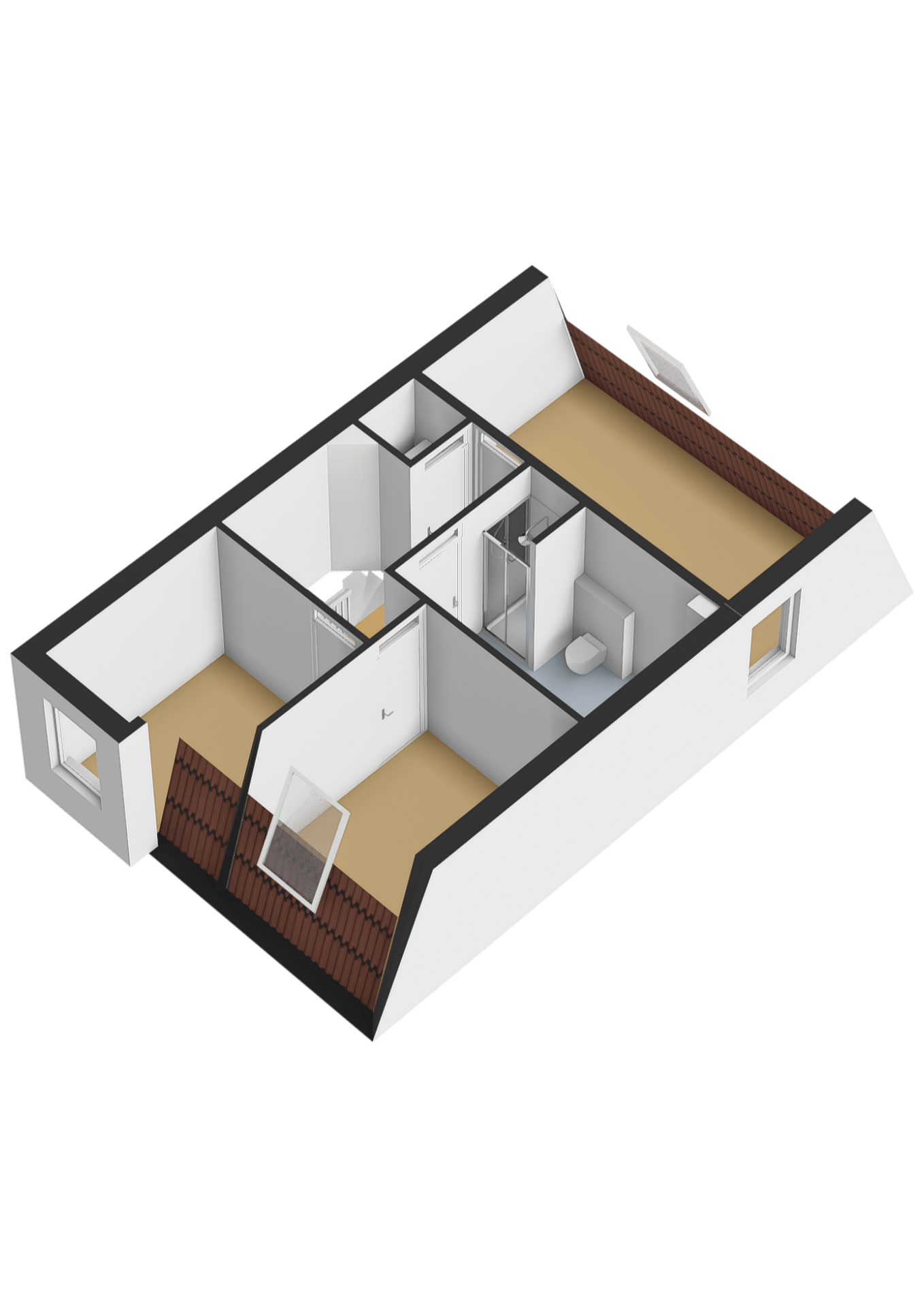 Hier bevinden zich drie slaapkamers van (ca. 15.5, 8.5 en 7 m2) , een praktische berging met witgoedaansluiting en de badkamer. De badkamer van (ca. 7 m2) is uit gerust met een douche, ligbad, toilet, wastafel en een lichtkoepel dat zorgt voor natuurlijk licht.
