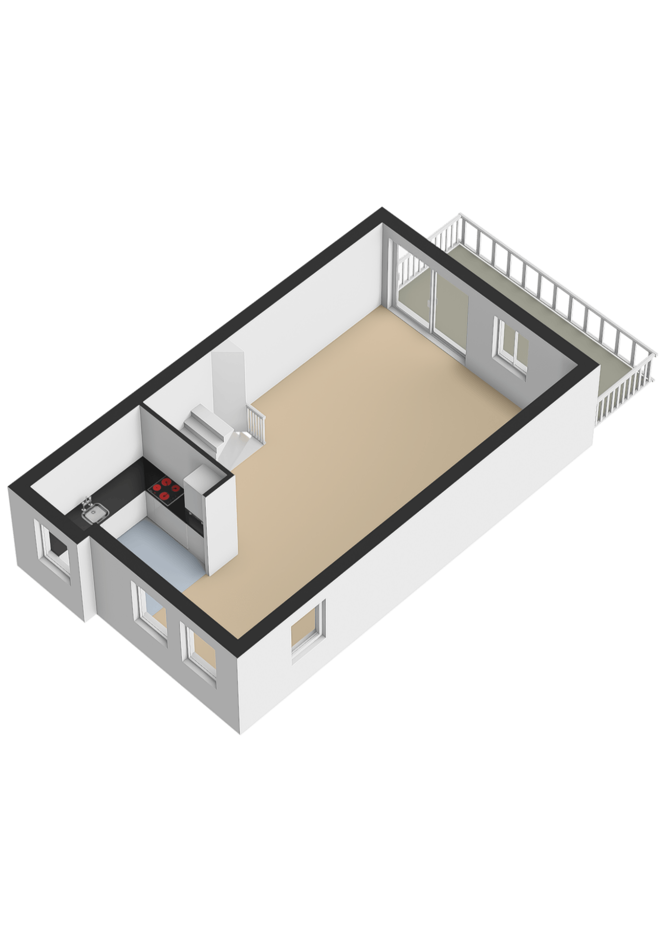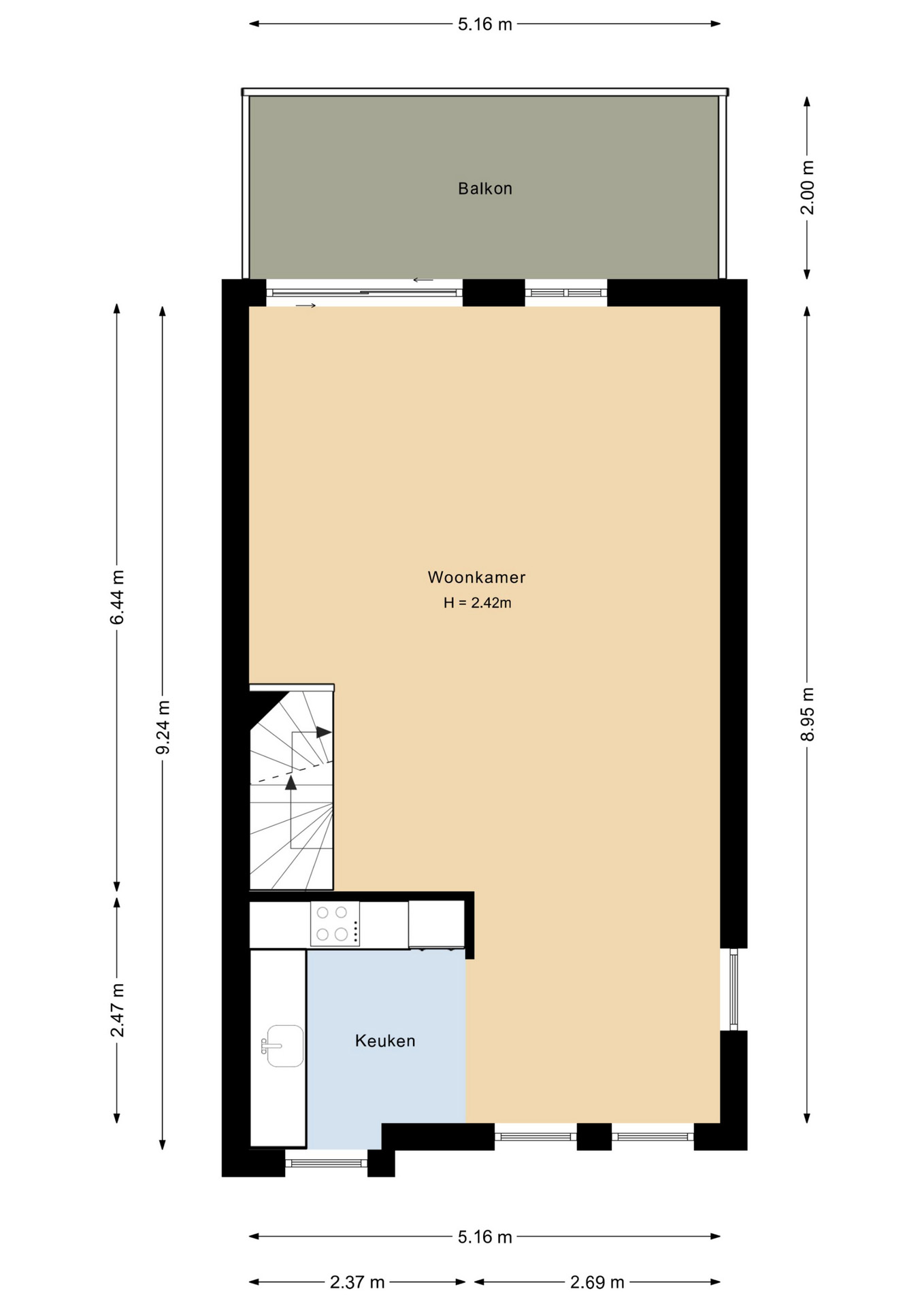 De trap leidt naar de lichte woonkamer met open woonkeuken (ca. 47 m2). De keuken is voorzien van inbouwapparatuur zoals een 4-pits elektrische kookplaat, afzuigkap, oven, vaatwasser en koelkast. Vanuit de woonkamer is er toegang tot een balkon (ca. 10 m2). Een vaste trap vanaf het balkon leidt naar de tuin, die beschikt over een vrije achterom.