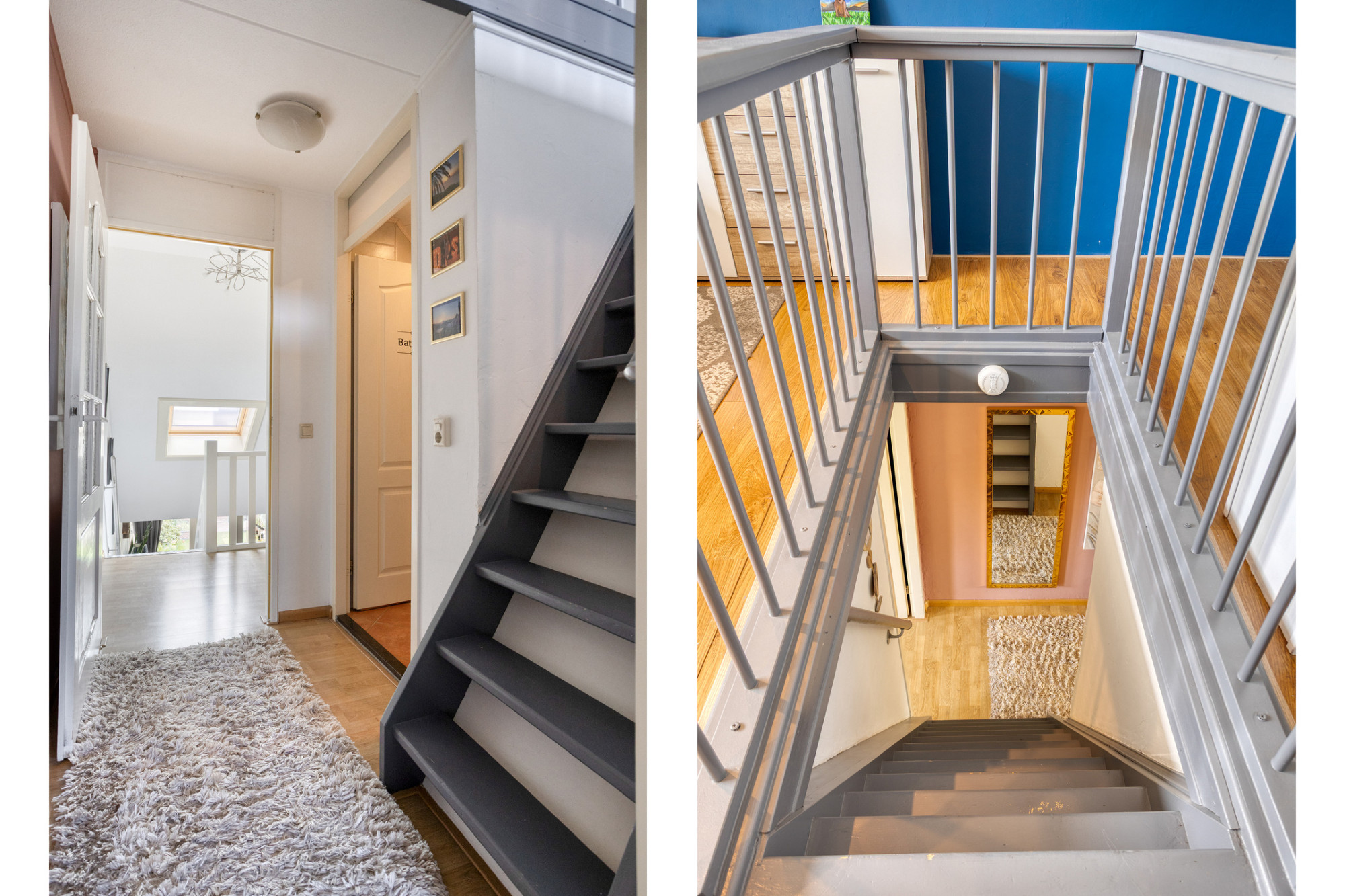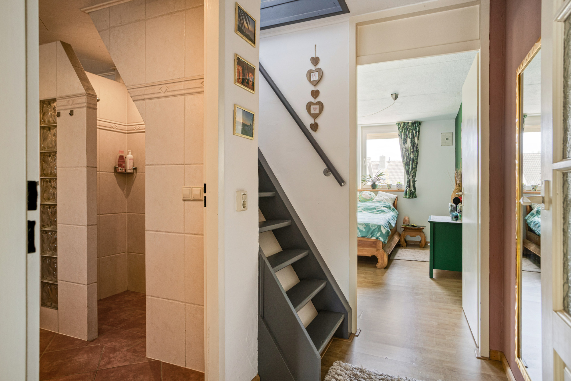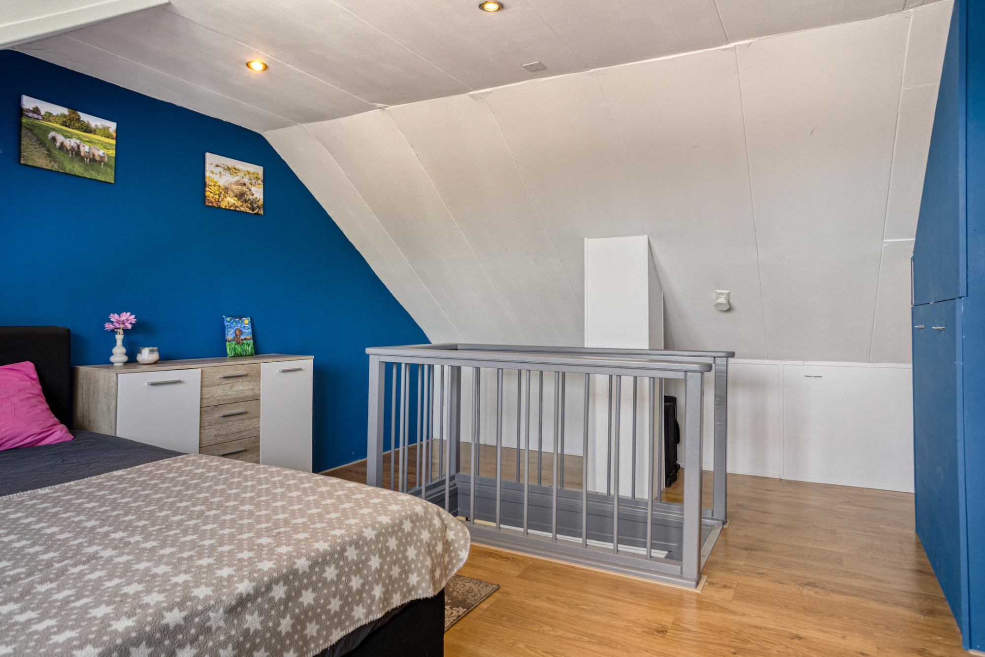 De trap naar de eerste verdieping staat in de woonkamer. Boven kom je uit op de overloop met vide, die uitkijkt over de woonkamer en zorgt voor een ruimtelijk effect. Vanuit de overloop zijn een ruime slaapkamer van circa 20 m² en de badkamer bereikbaar. De slaapkamer ligt aan de voorzijde van de woning en is uitgerust met elektrische rolluiken.
