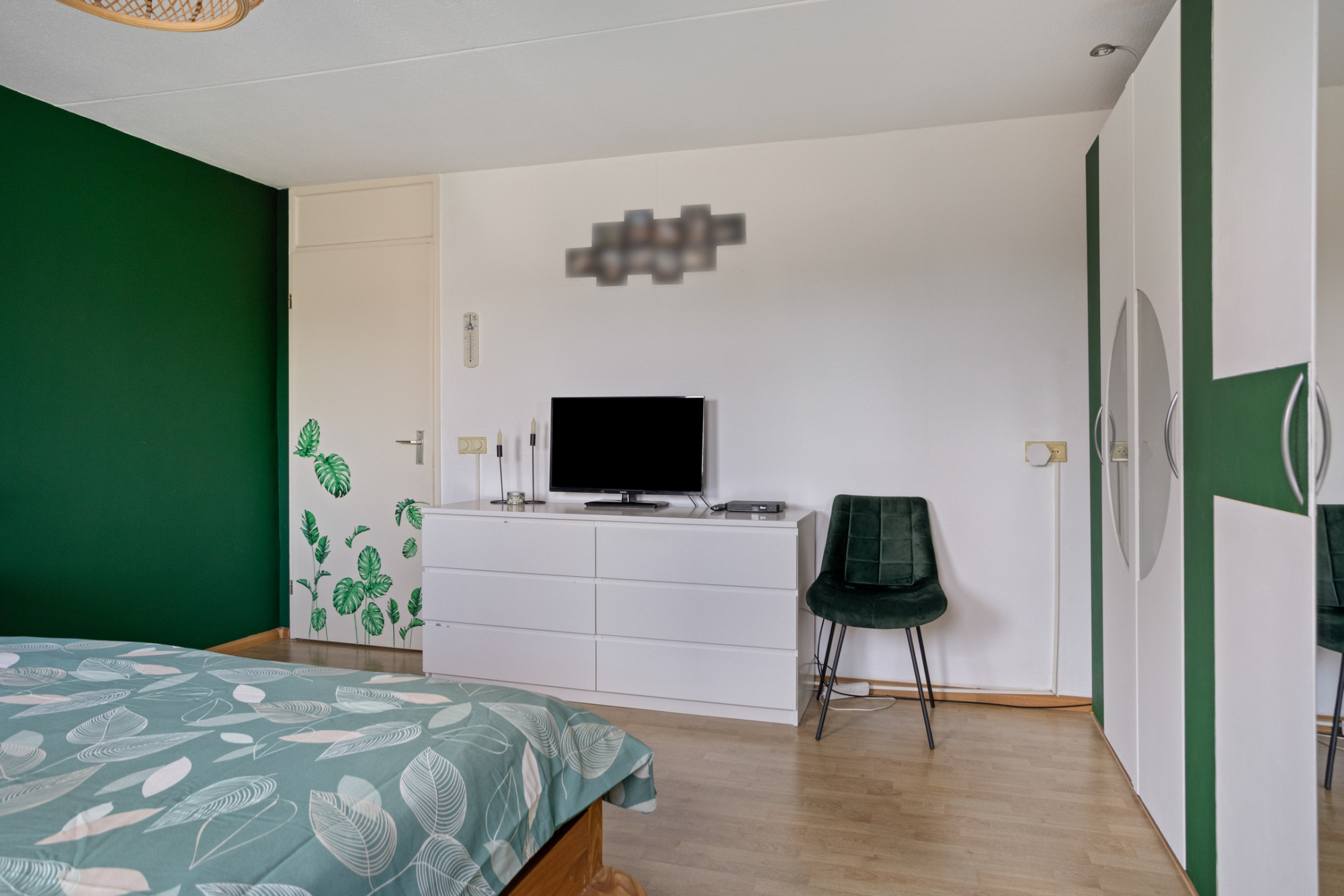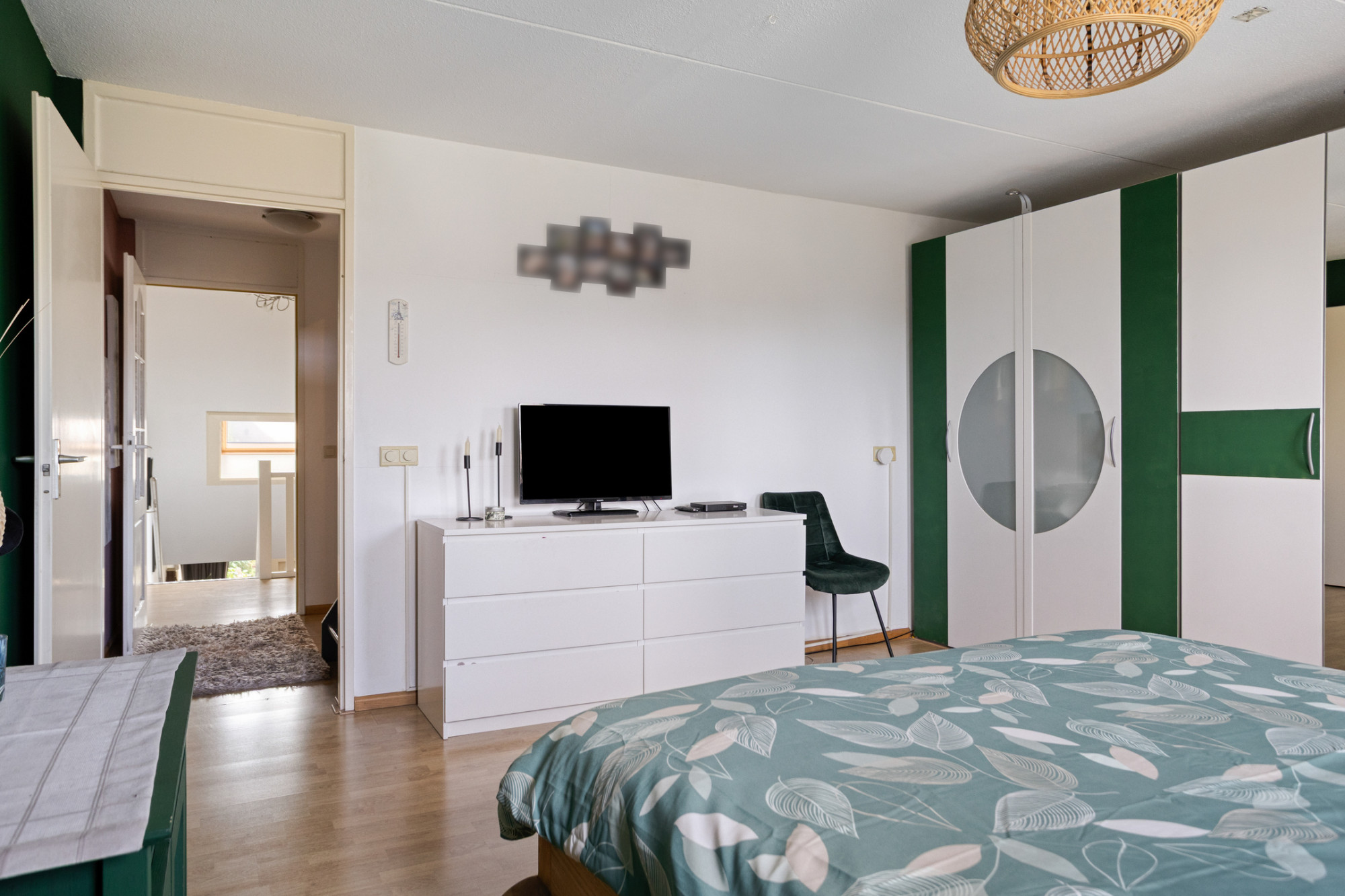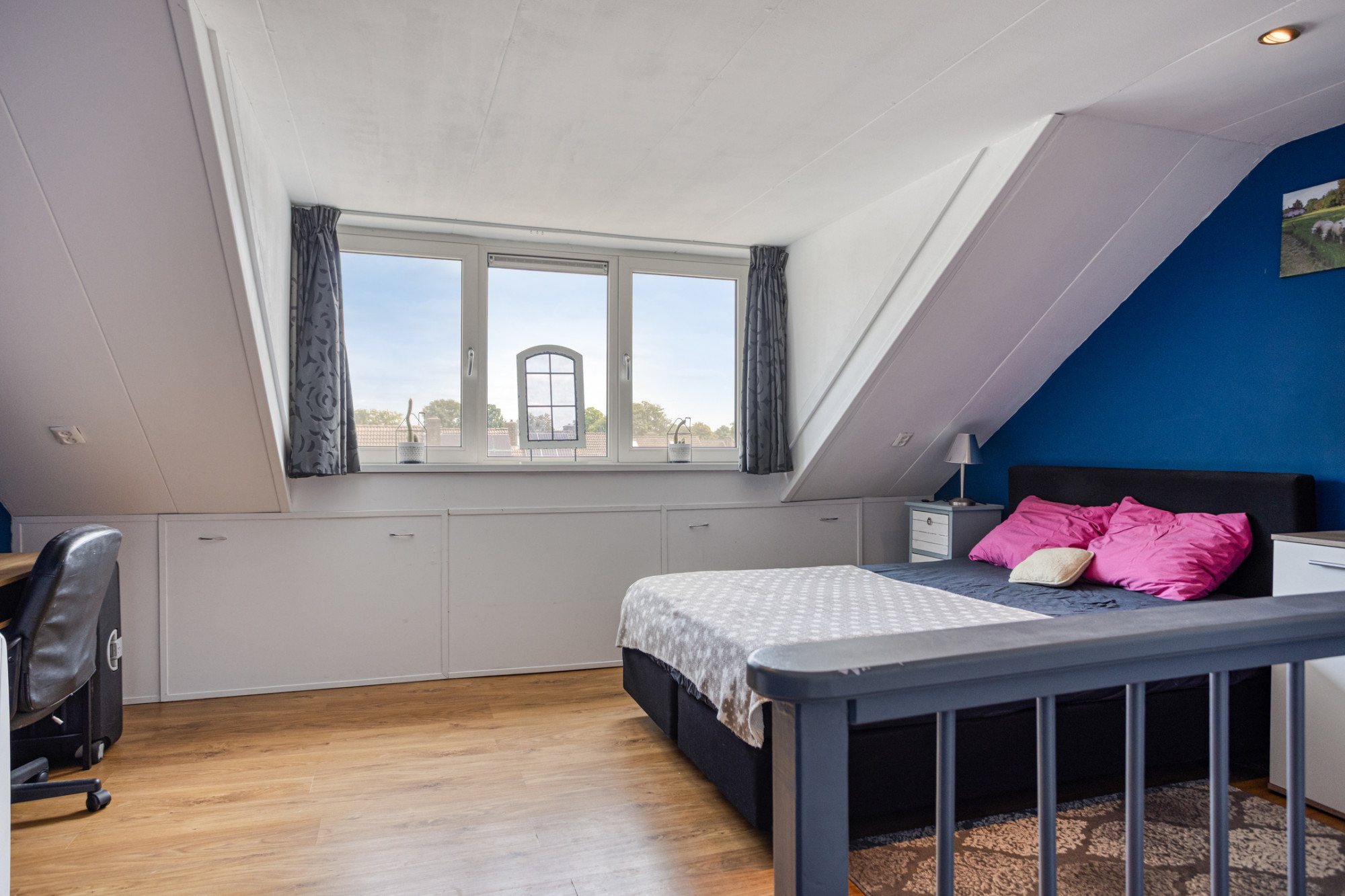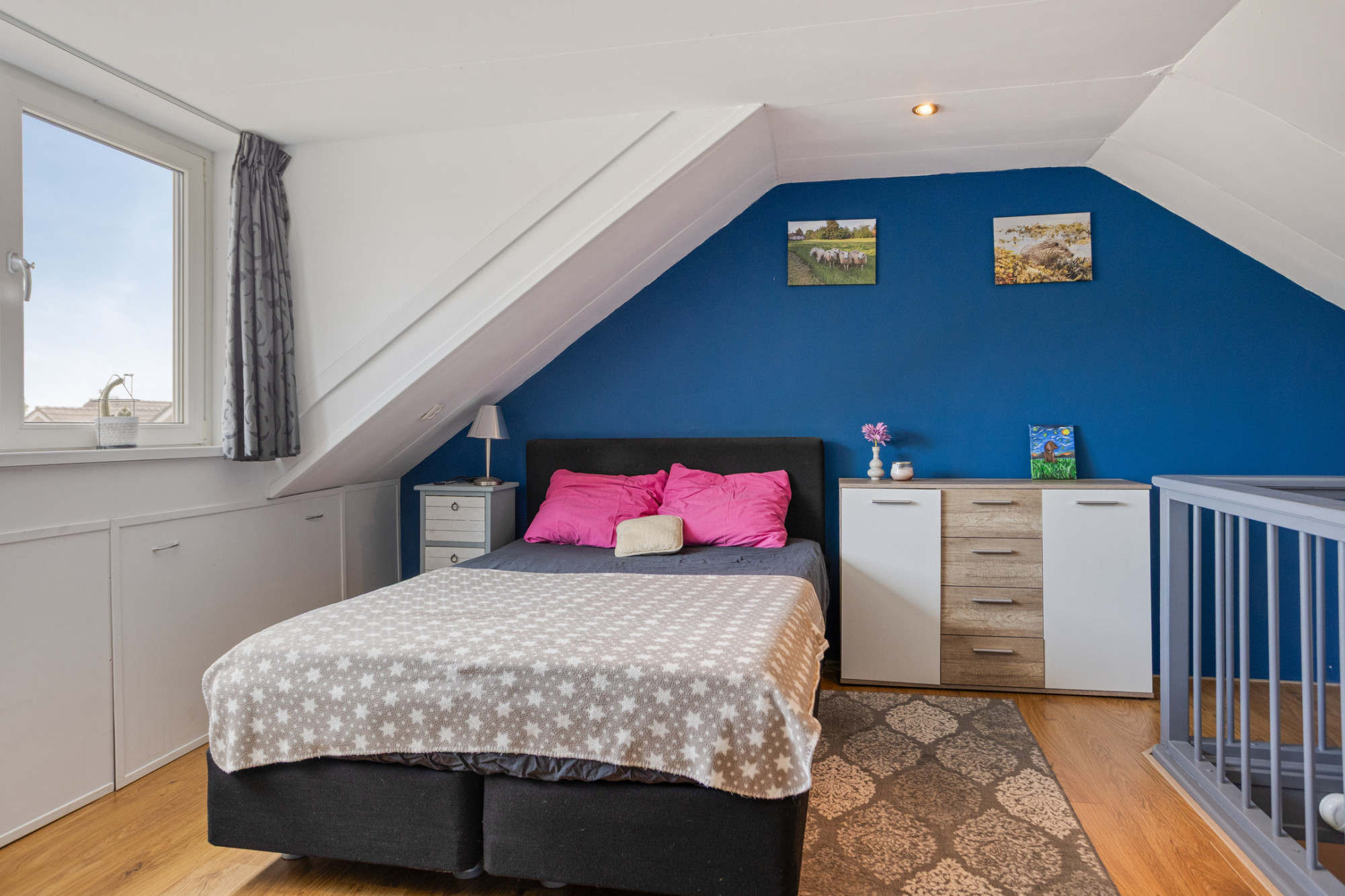De trap naar de eerste verdieping staat in de woonkamer. Boven kom je uit op de overloop met vide, die uitkijkt over de woonkamer en zorgt voor een ruimtelijk effect. Vanuit de overloop zijn een ruime slaapkamer van circa 20 m² en de badkamer bereikbaar. De slaapkamer ligt aan de voorzijde van de woning en is uitgerust met elektrische rolluiken.