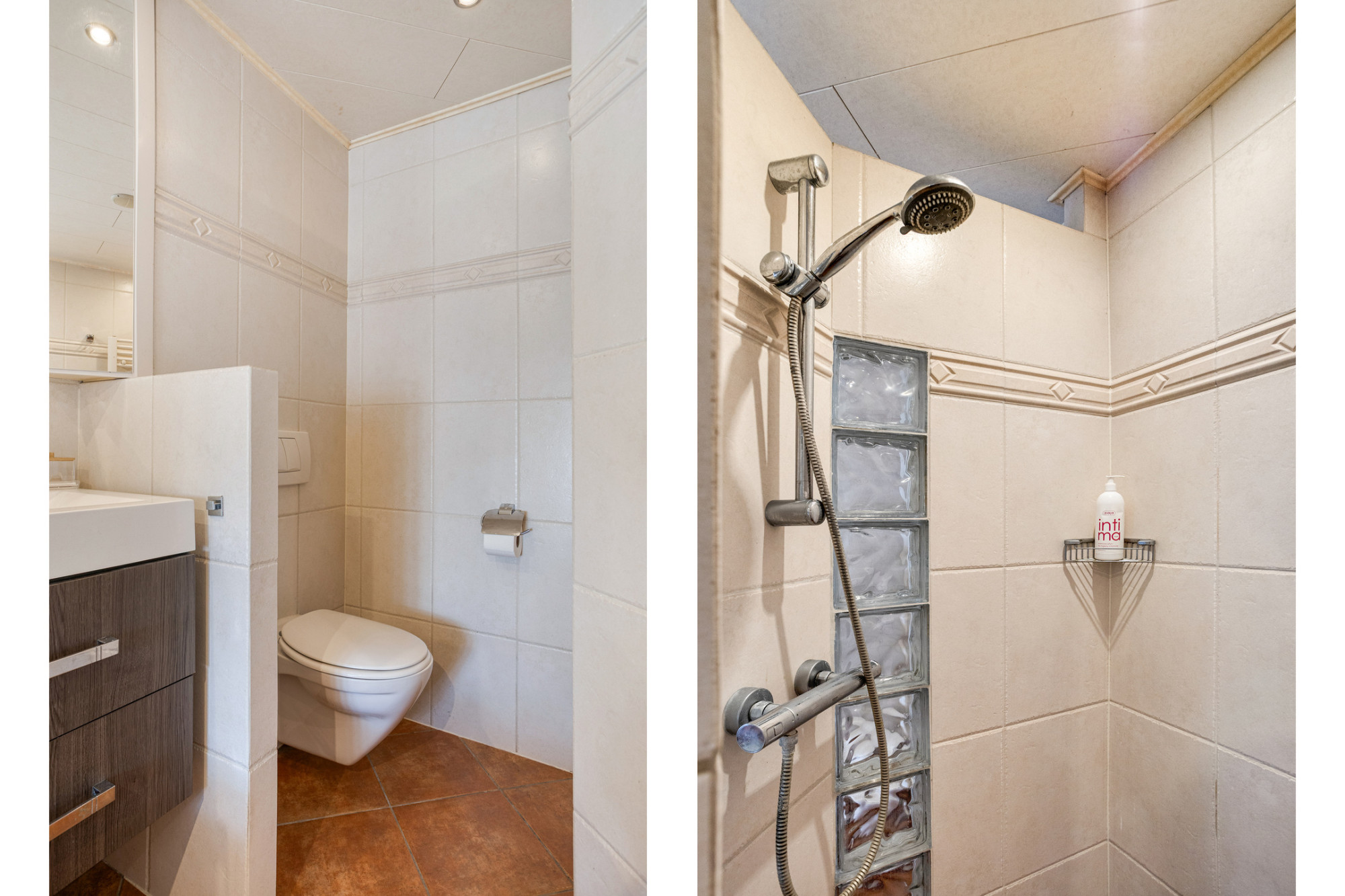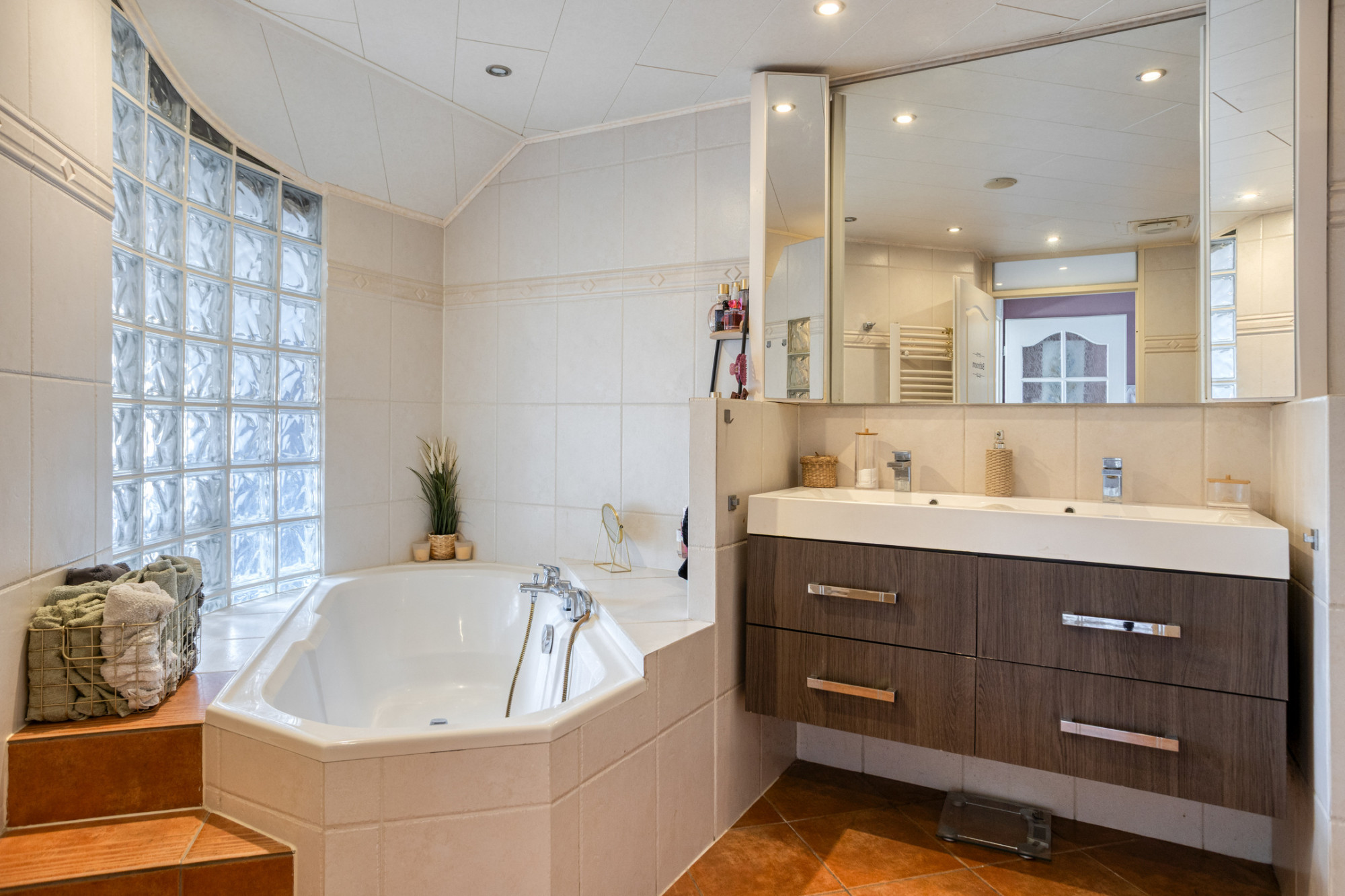 De badkamer is volledig betegeld en netjes afgewerkt. De ruimte beschikt over een ligbad, een inloopdouche, een dubbele wastafel met meubel, een toilet en mechanische ventilatie. Door de toepassing van glasblokken en dakramen in de woonkamer profiteert de badkamer bovendien van extra natuurlijk licht.