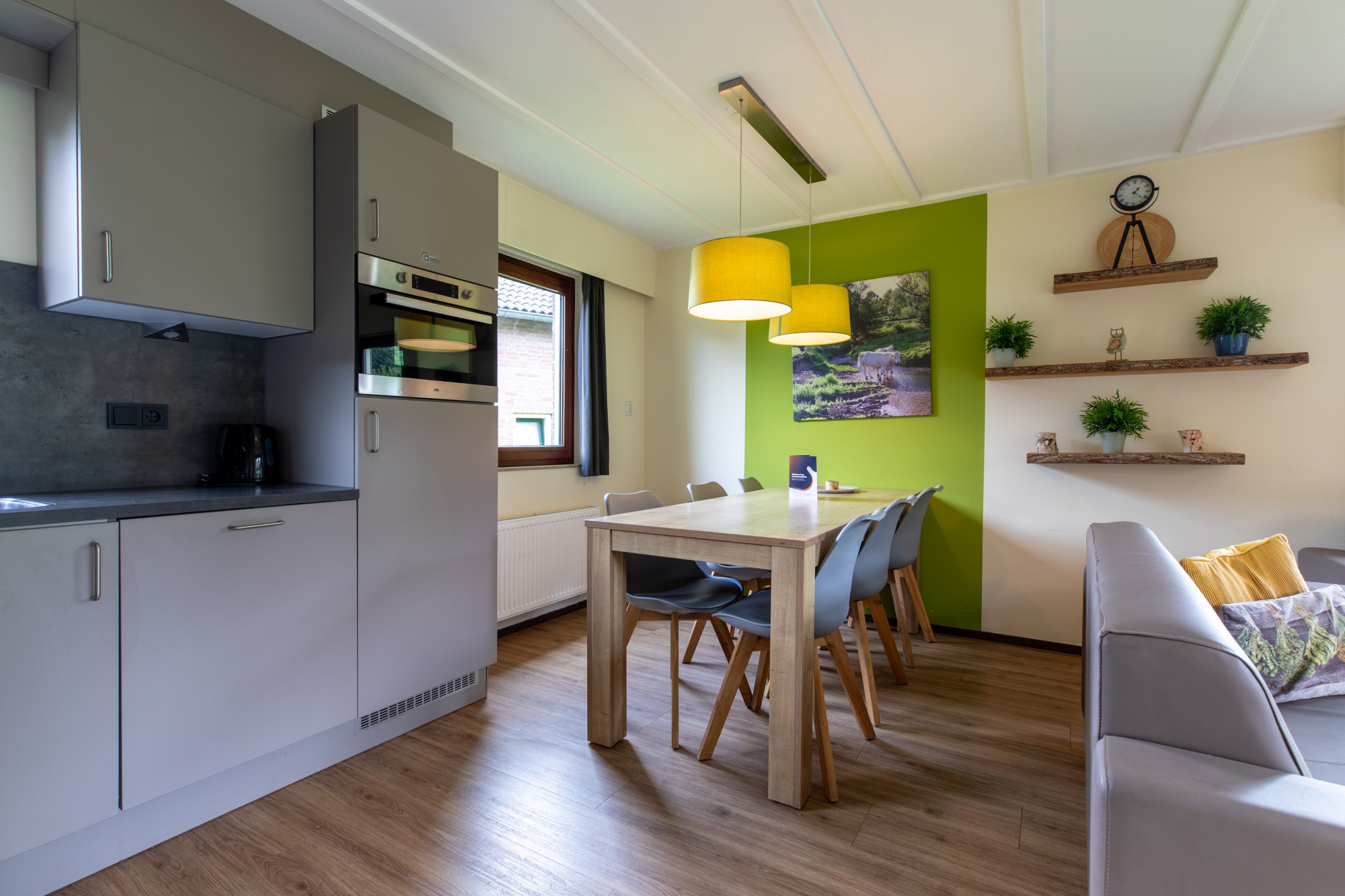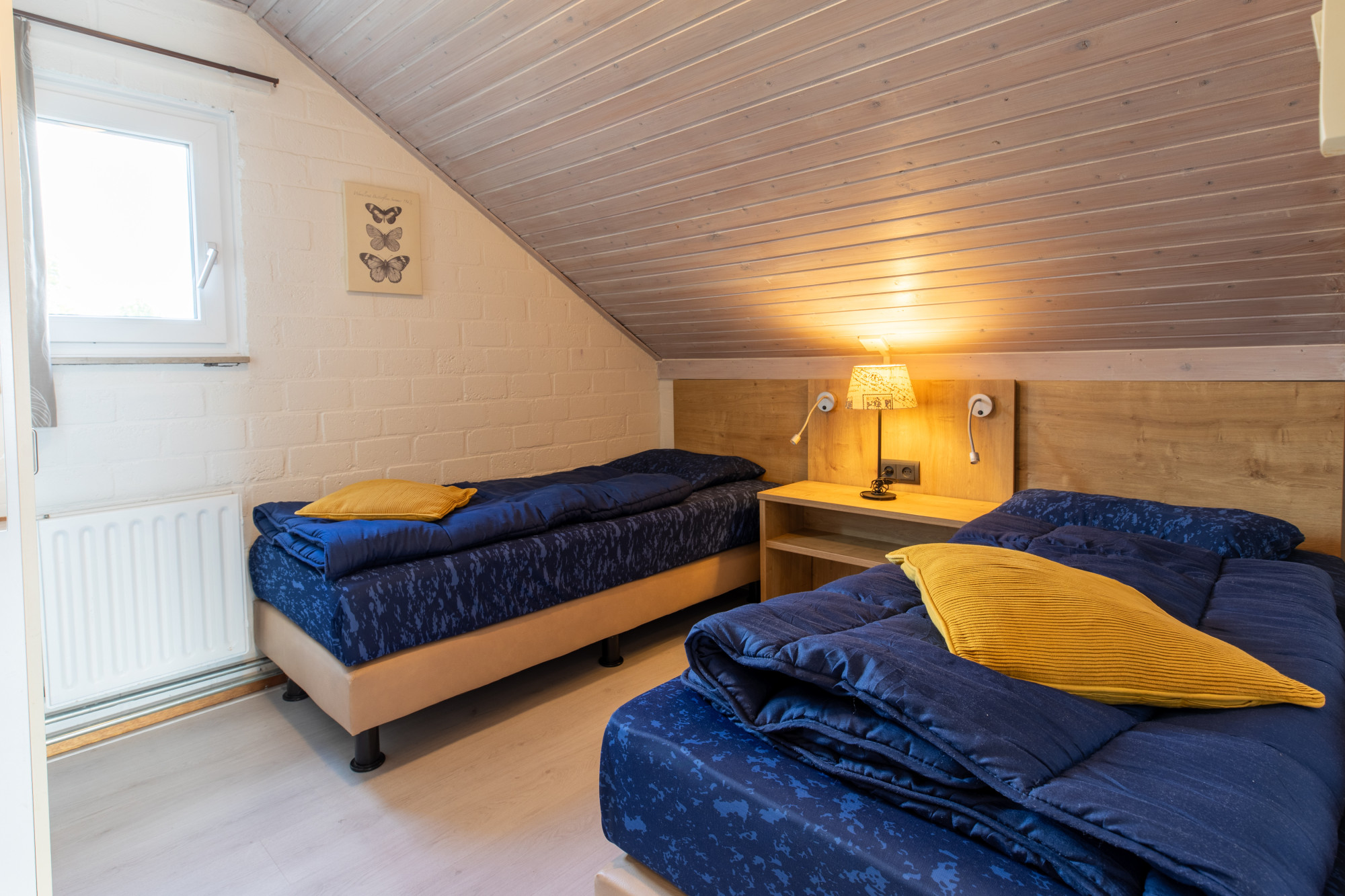 Hal met de toegang tot de badkamer met vaste wastafel, designradiator, bad en douchecabine. Gastentoilet met fonteintje. Vanuit de hal kom je in de woonkamer met openkeuken uitgerust met gascomfort, vaatwasser, afzuigkap, koelkast met vriesvak en combimagnetron. Bij de keukenstaat een gezellige eettafel met uitzicht naar buiten. Via de trap in de hal om je op de overloop hier vinden we drie tweepersoonsslaapkamer met boxspringbedden en hang en legkasten. Op deze etage is ook een toilet en wastafel. Tussen de 2 slaapkamers is nog nog een kleine berging voor eventuele koffers.