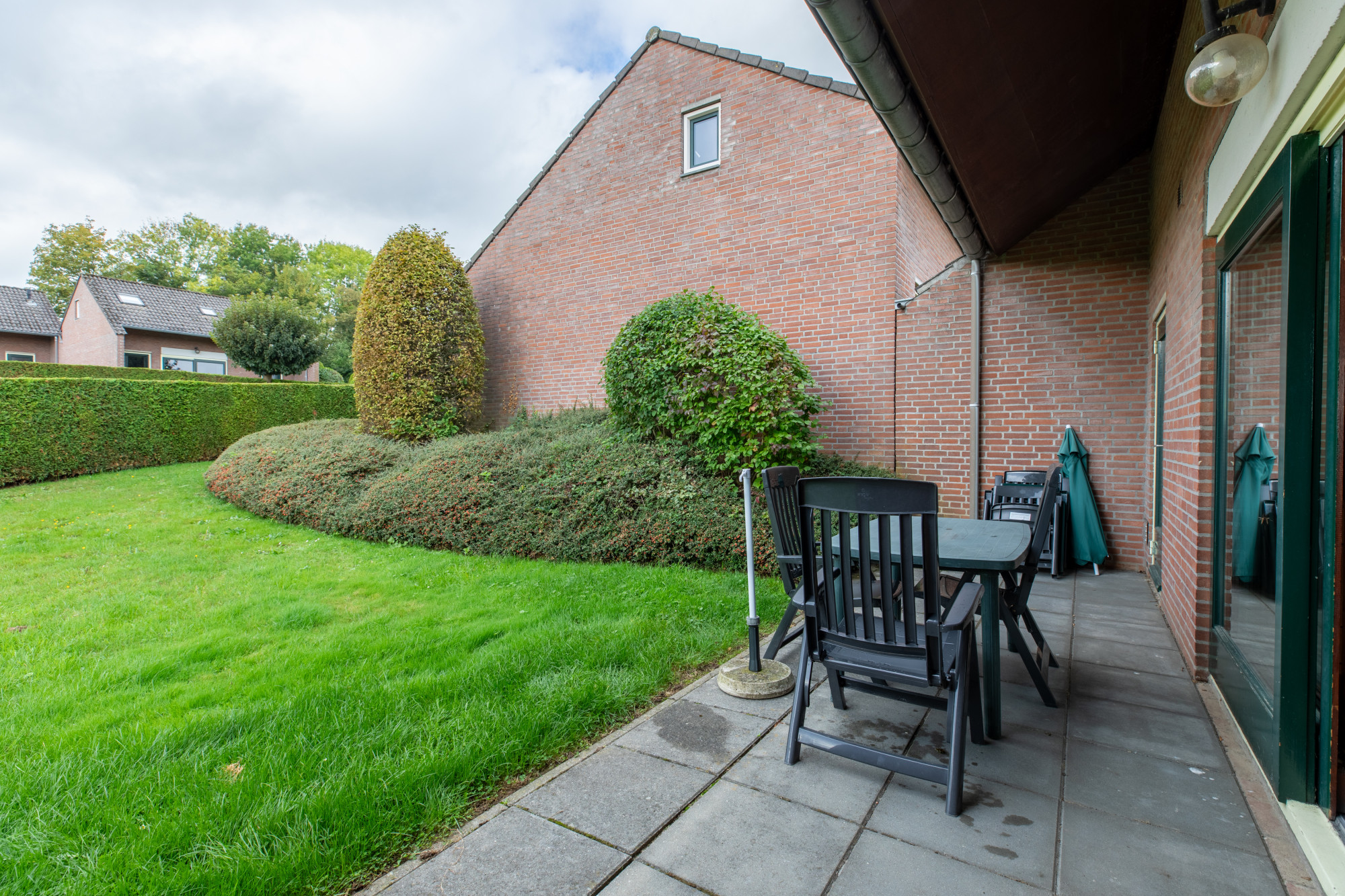 Het terras gelegen op het zuidwesten dat toegankelijk is vanuit de woonkamer via de schuifpui met de omsloten tuin. Naast het terras is nog een kleine berging waar o.a. de cv-installatie is ondergebracht.