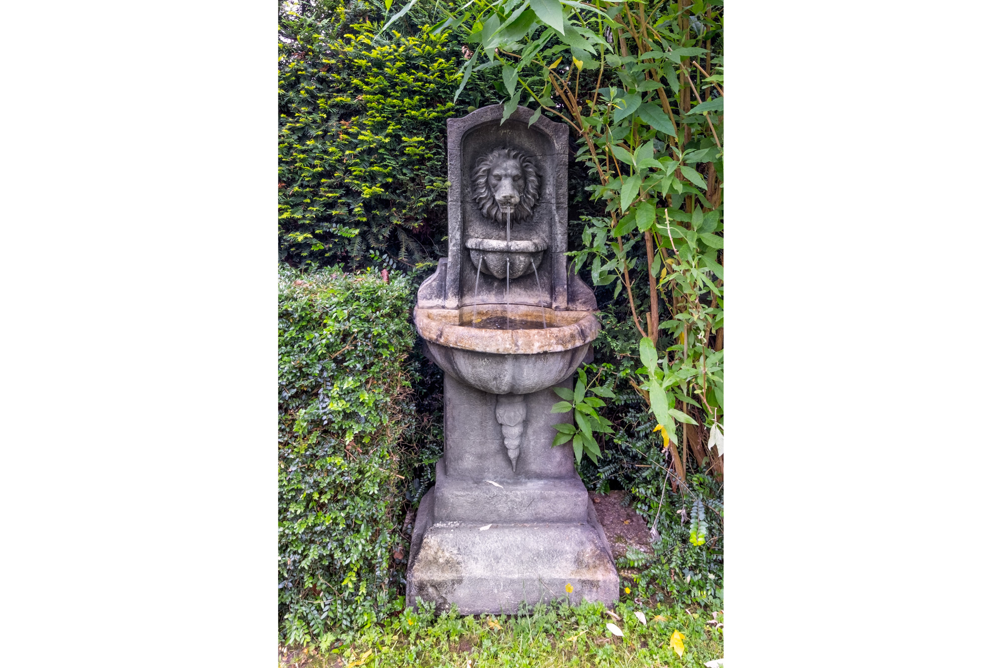 De tuin aan de linkerzijde is ingedeeld met bomen, wandelpaden en een vijver.