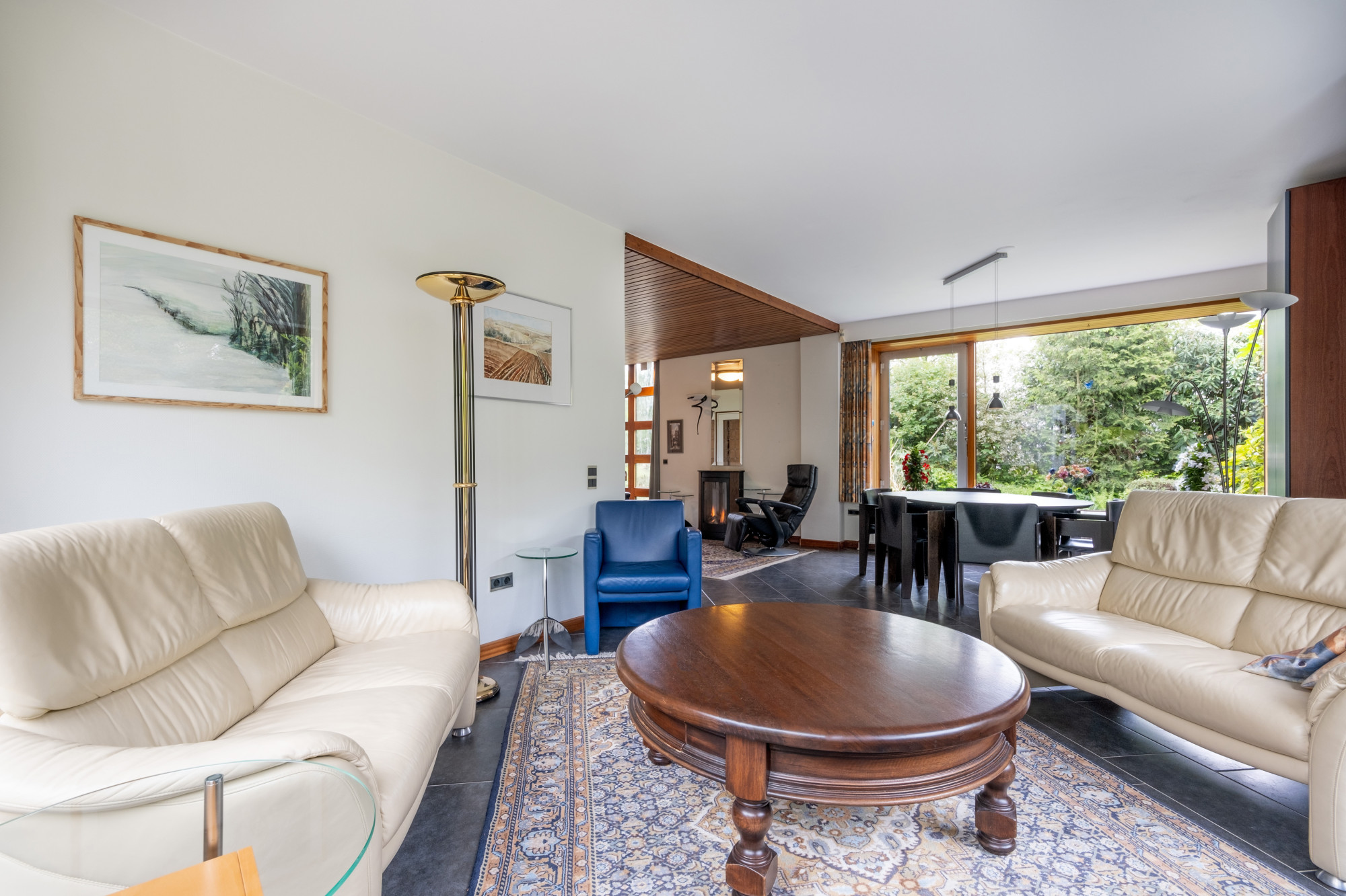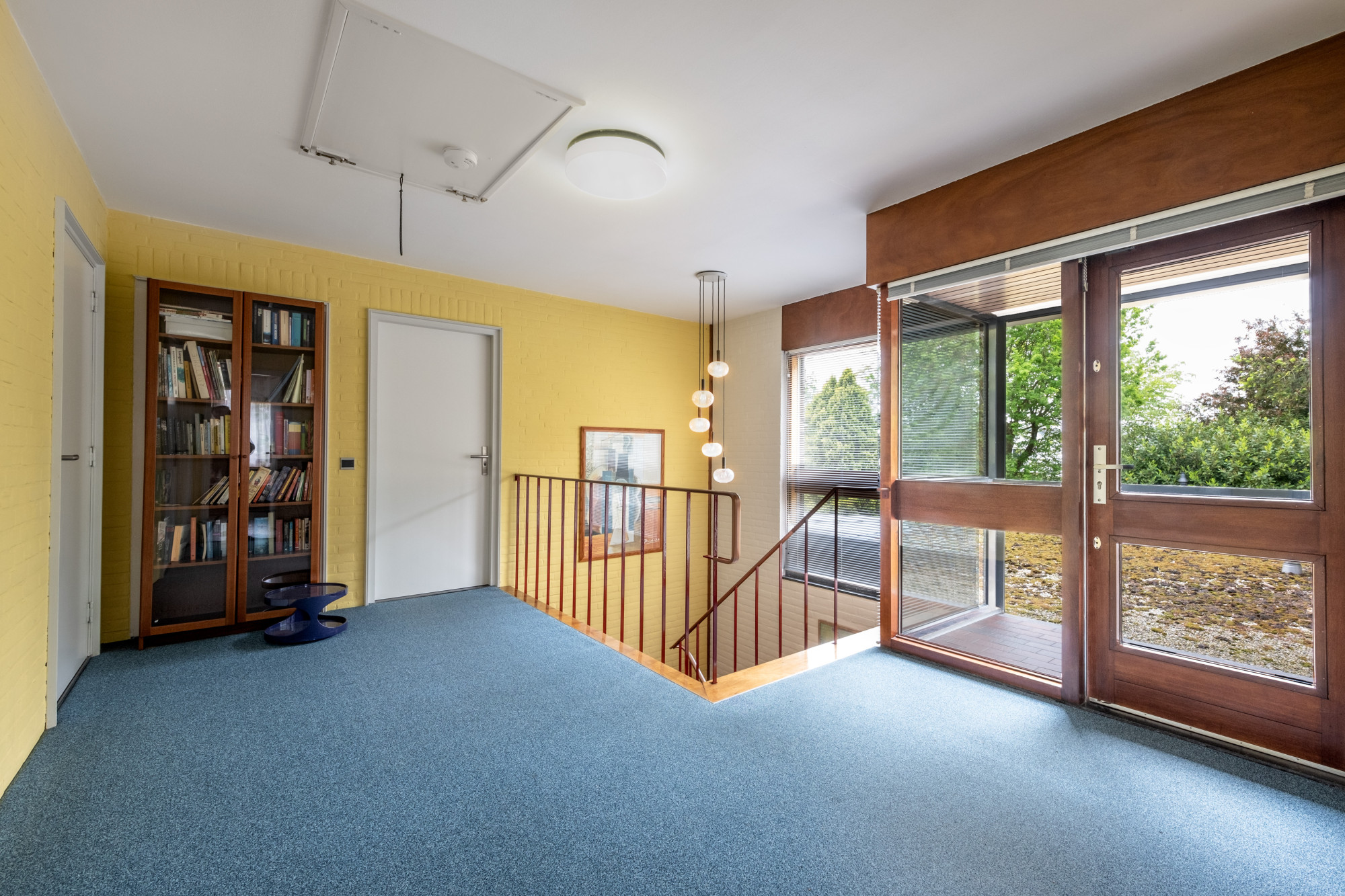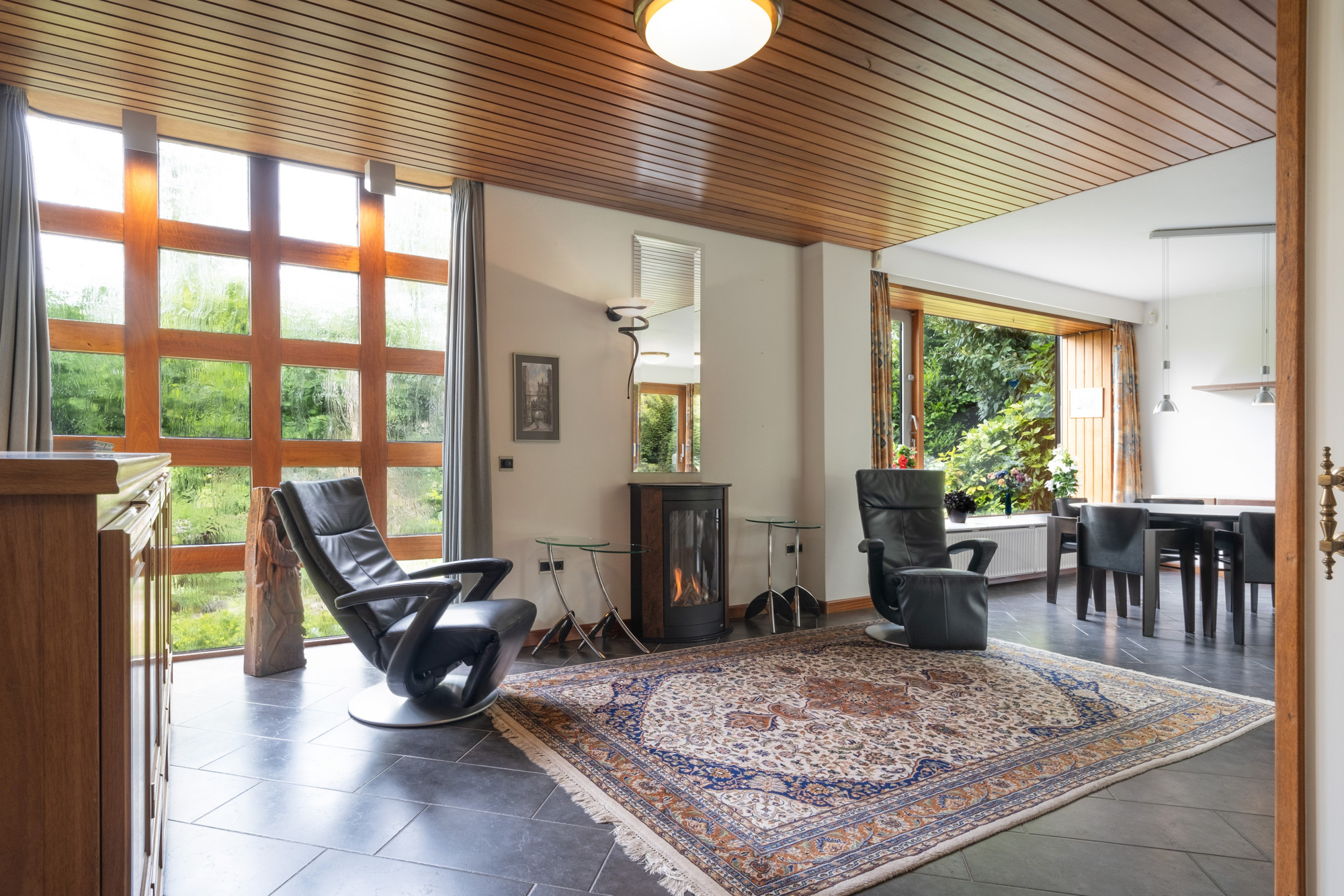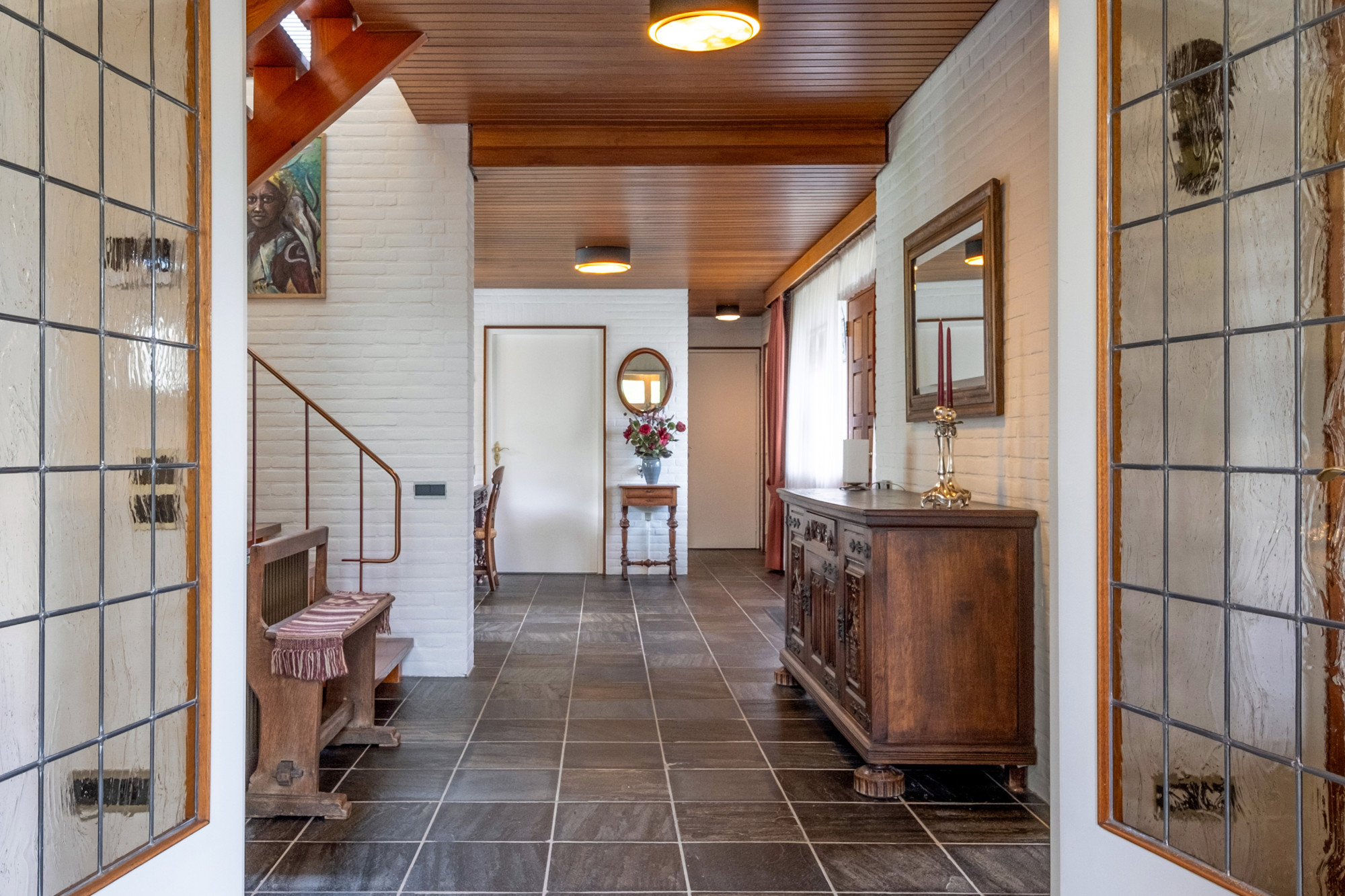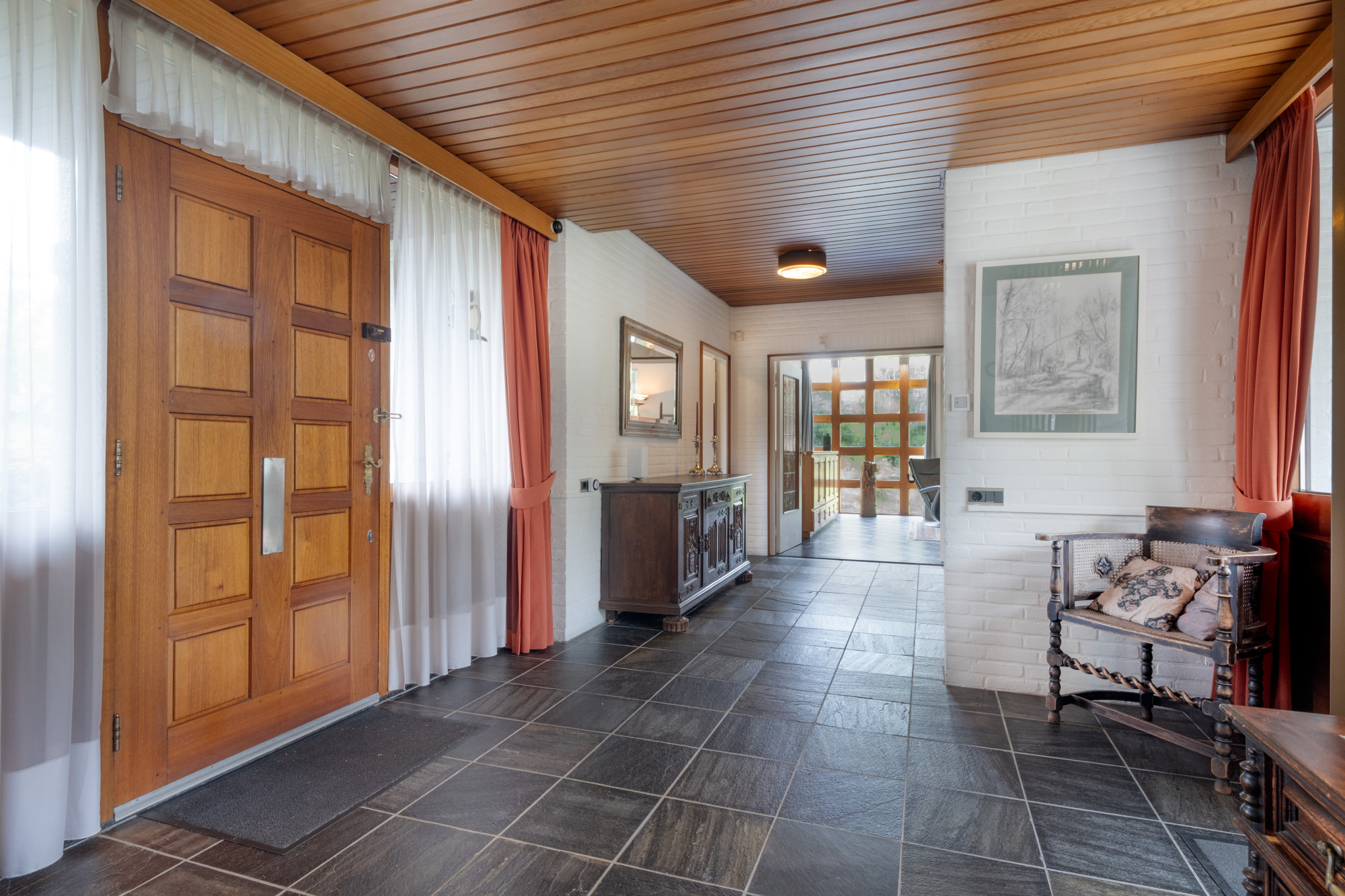 Overdekte entree, prachtige ruime ontvangsthal met kwartsiet vloer, zitkuil en toegang naar alle vertrekken en achtertuin. L-vormige woonkamer met tegelvoer. Veel lichtinval door de hoge ramen en tevens toegang via een schuifpui naar terras/tuin.