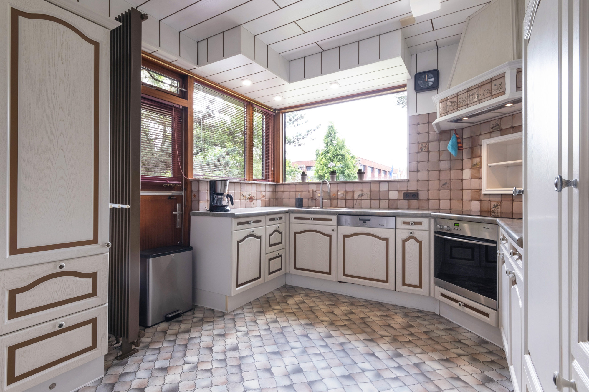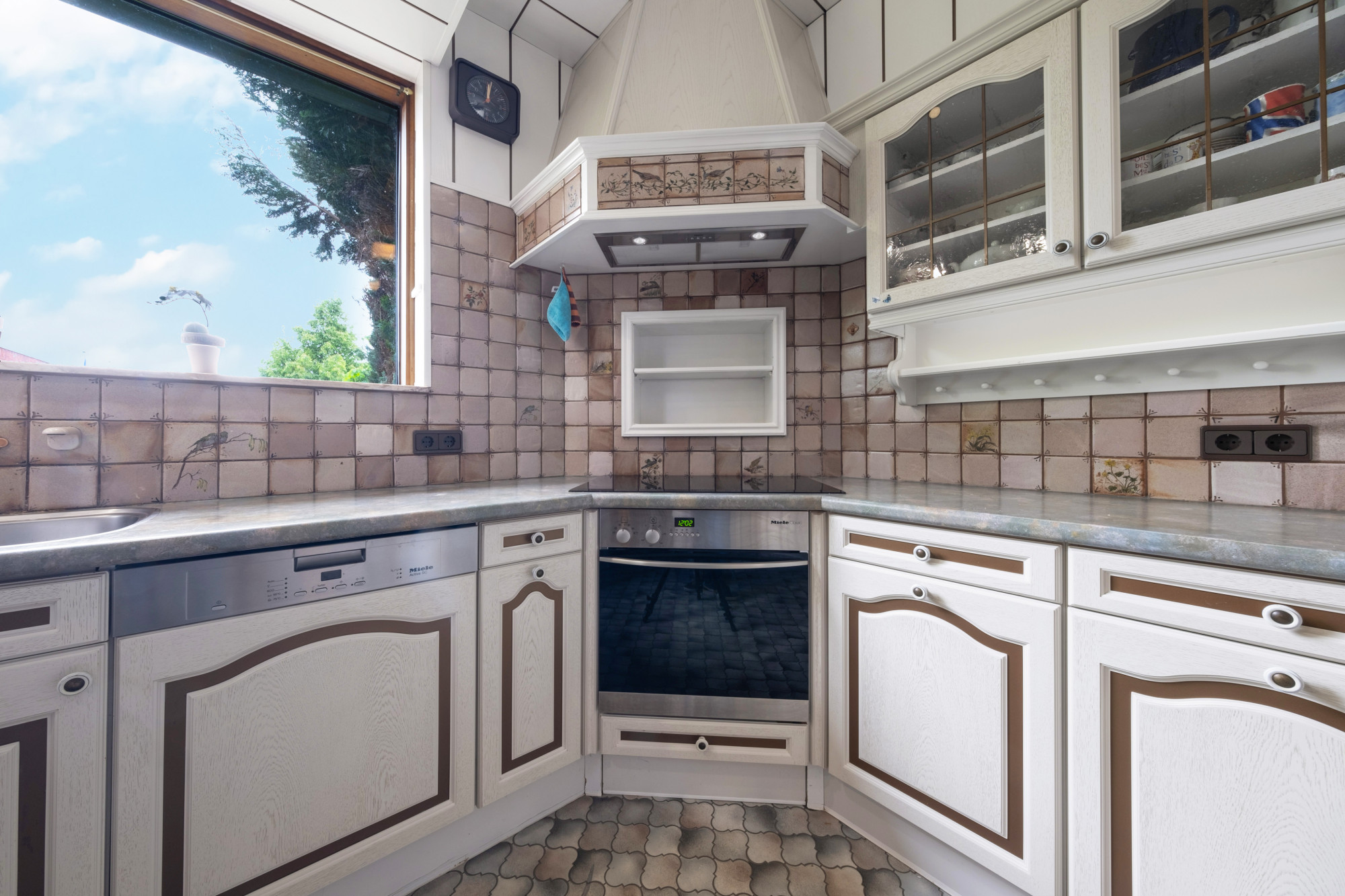 Gesloten keuken met veel lichtinval en een op maat gemaakte keuken voorzien van 5 pits inductie kooktoestel, oven, koelkast en vaatwasser (allen van het merk Siemens/Miele).