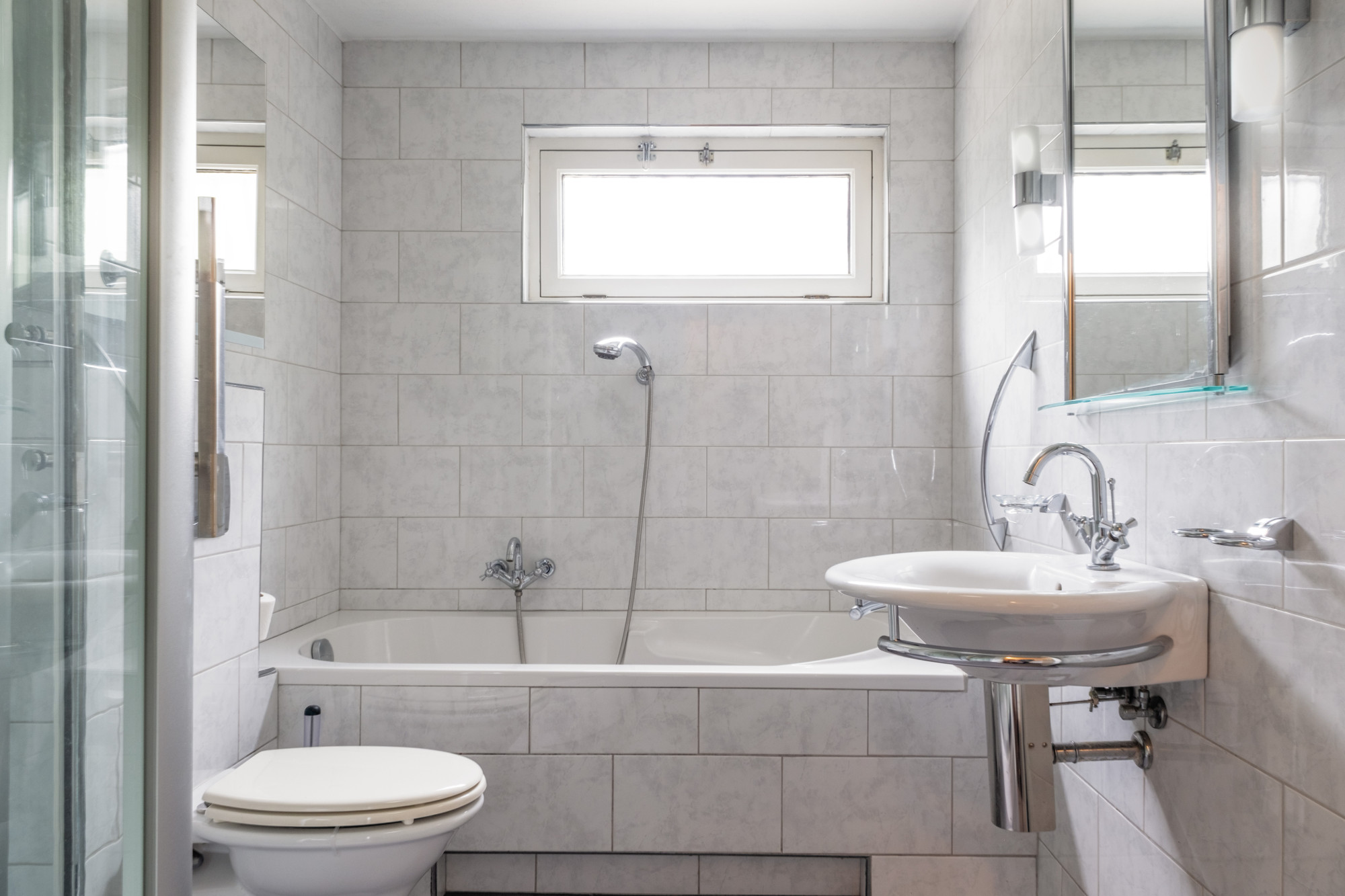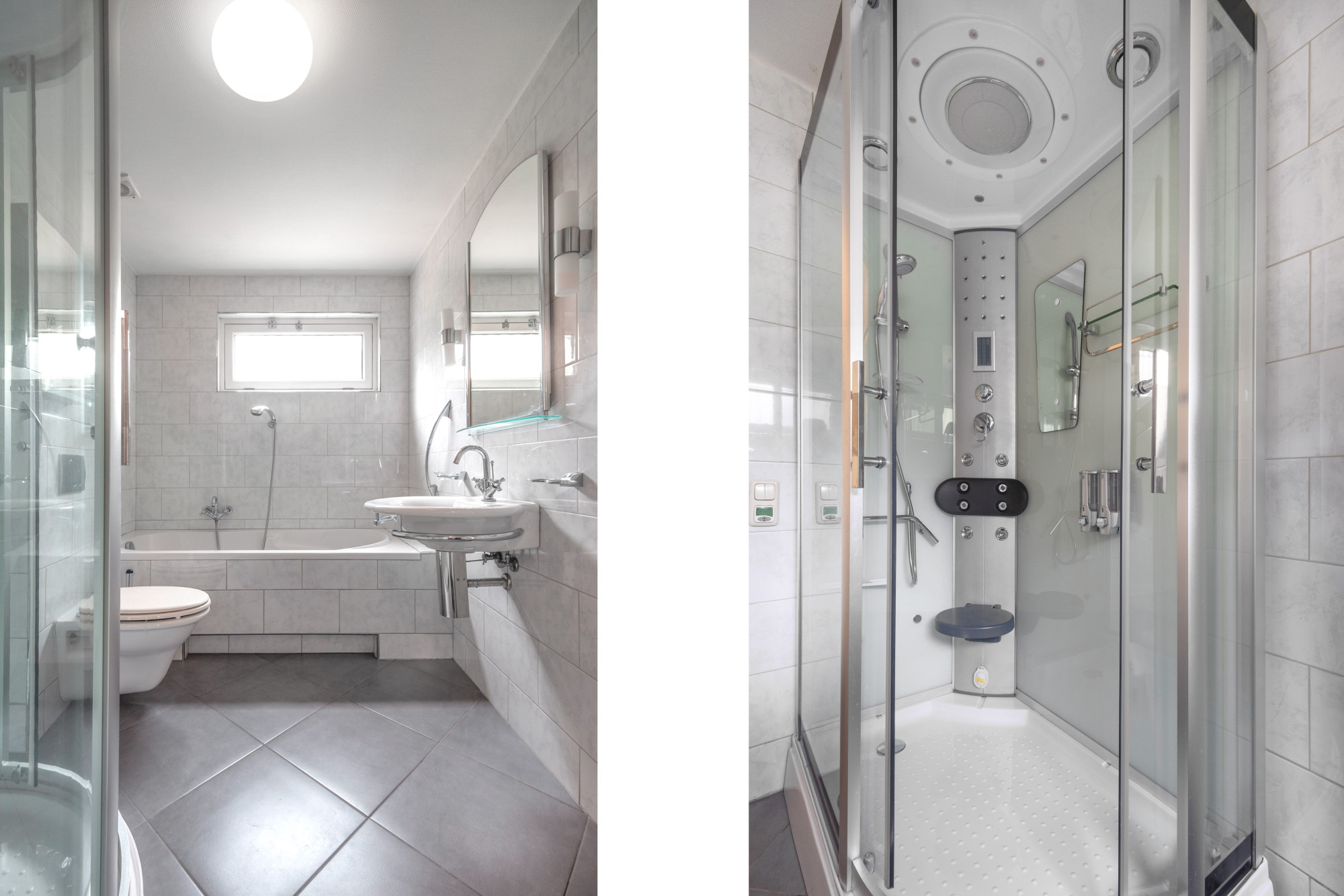 Badkamer met stoomcabine, ligbad, toilet en vaste wastafel.