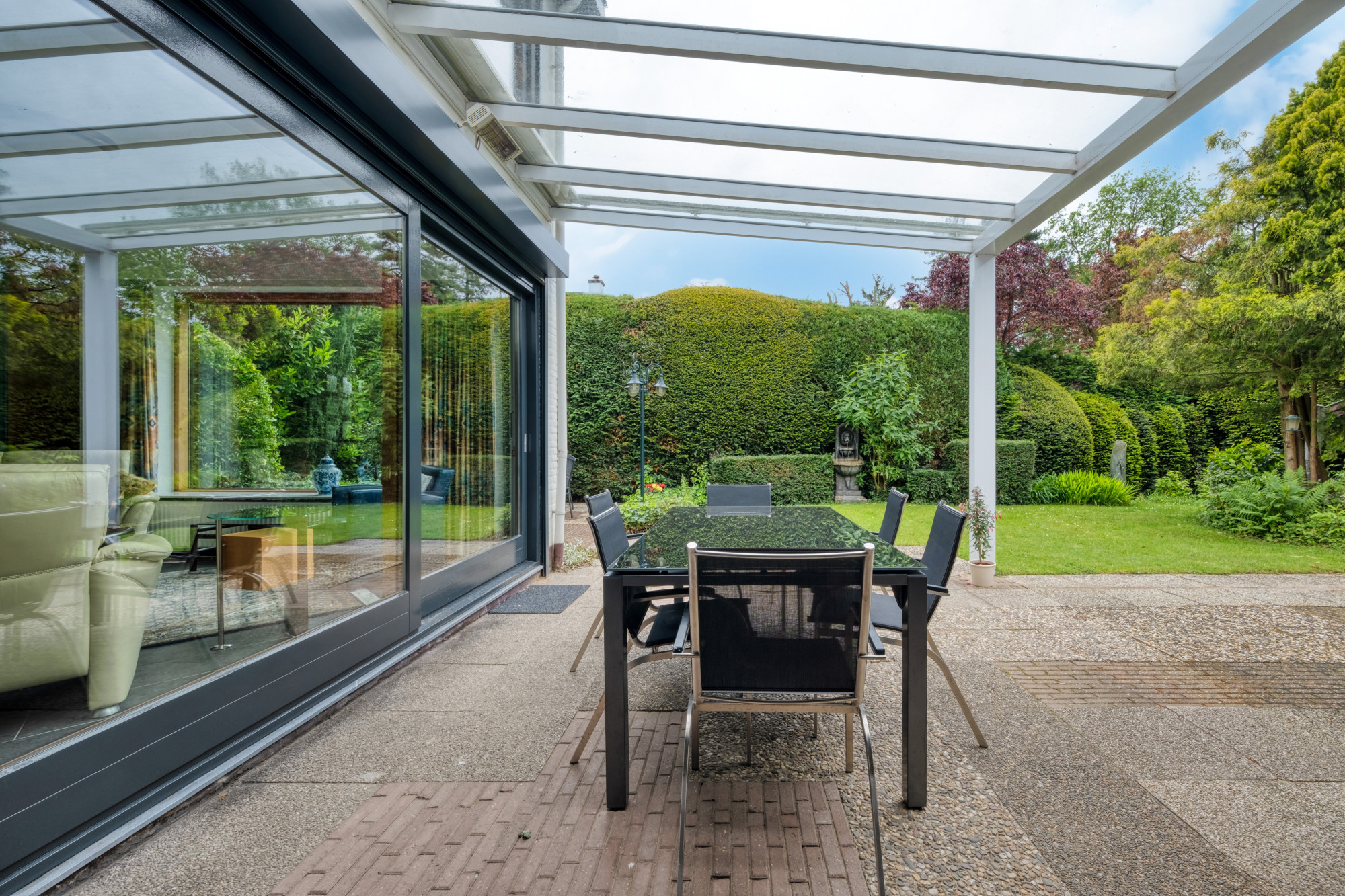 Aan de achterzijde kan men genieten van rust en is de fraai aangelegde tuin ingedeeld met een overdekt terras met screen, tuinhuis opbergruimte en diverse terrassen.