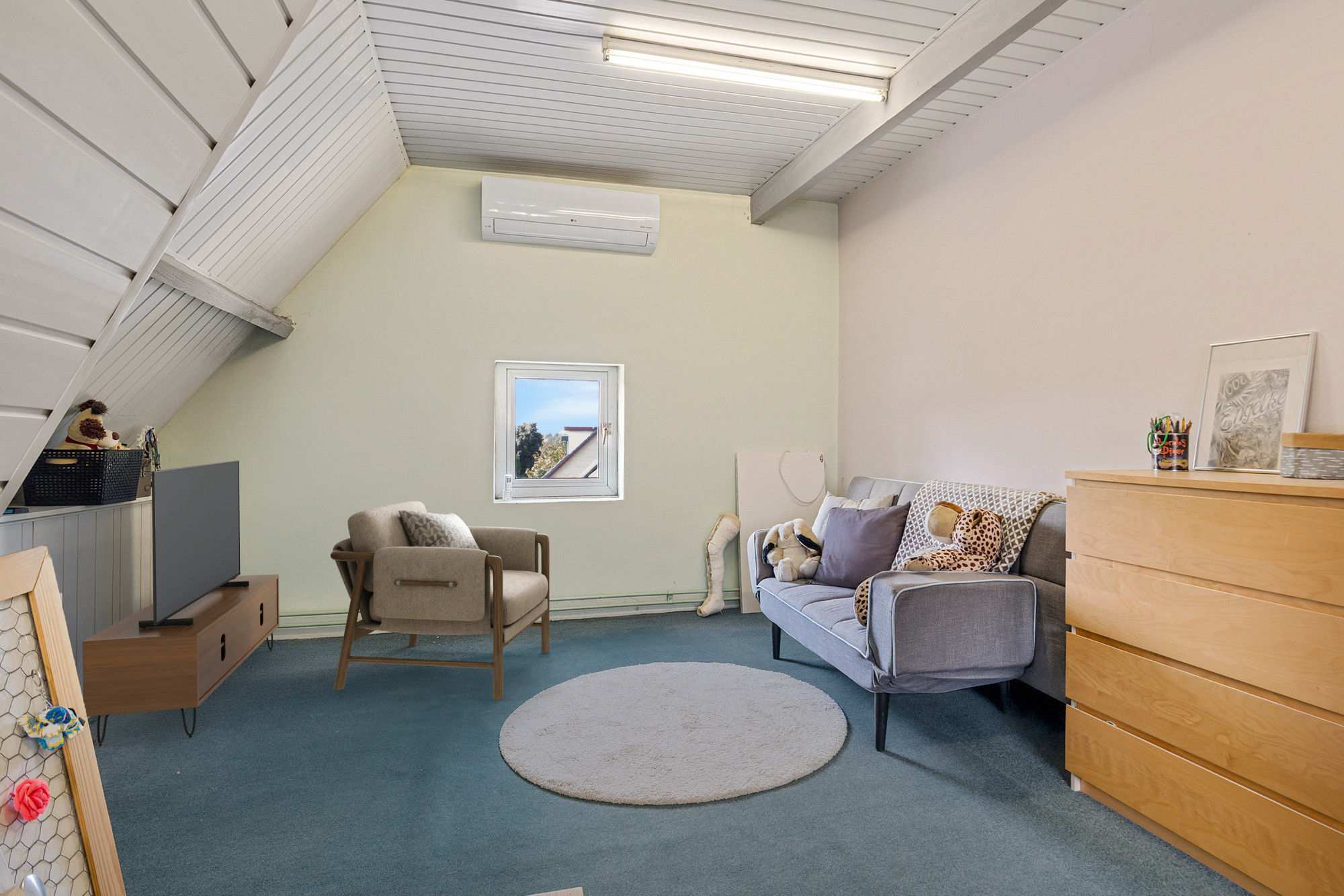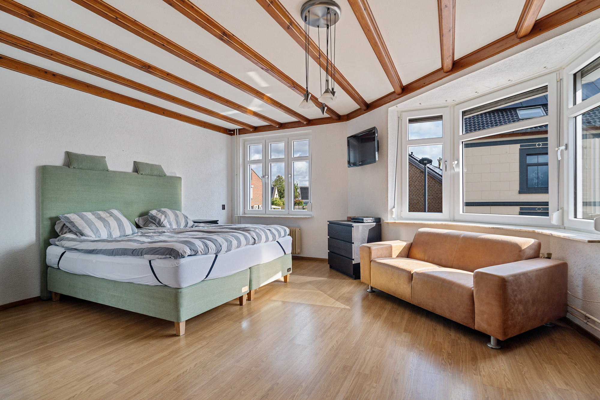 Via een vaste trap bereik je de zolder. Hier tref je een slaapkamer en een royale zolderruimte, beide voorzien van vloerbedekking.