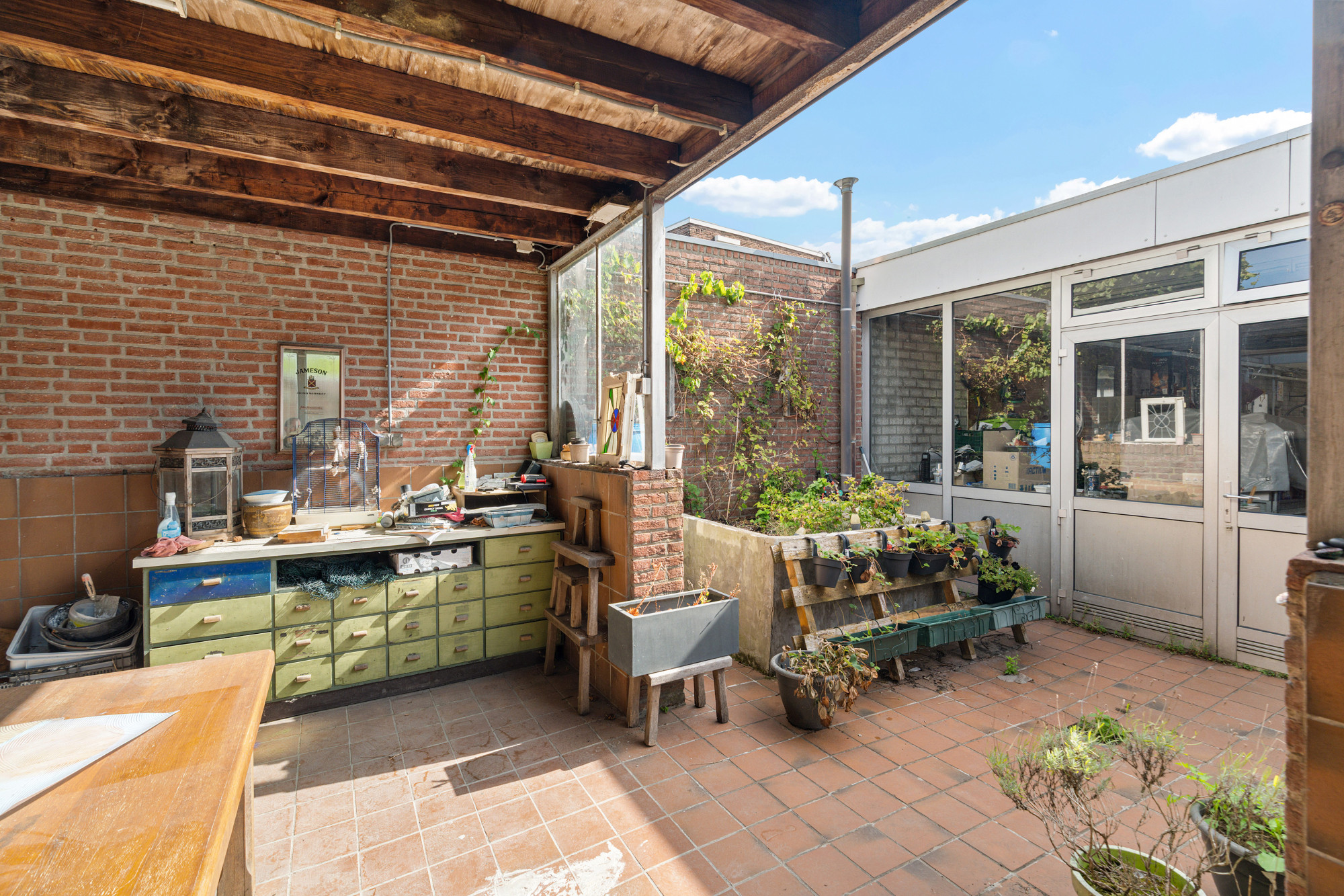 Achter de woning bevindt zich een fijne buitenruimte met een half overdekte werkplaats. Dit biedt de perfecte plek voor klussers of om buiten te genieten met voldoende beschutting.