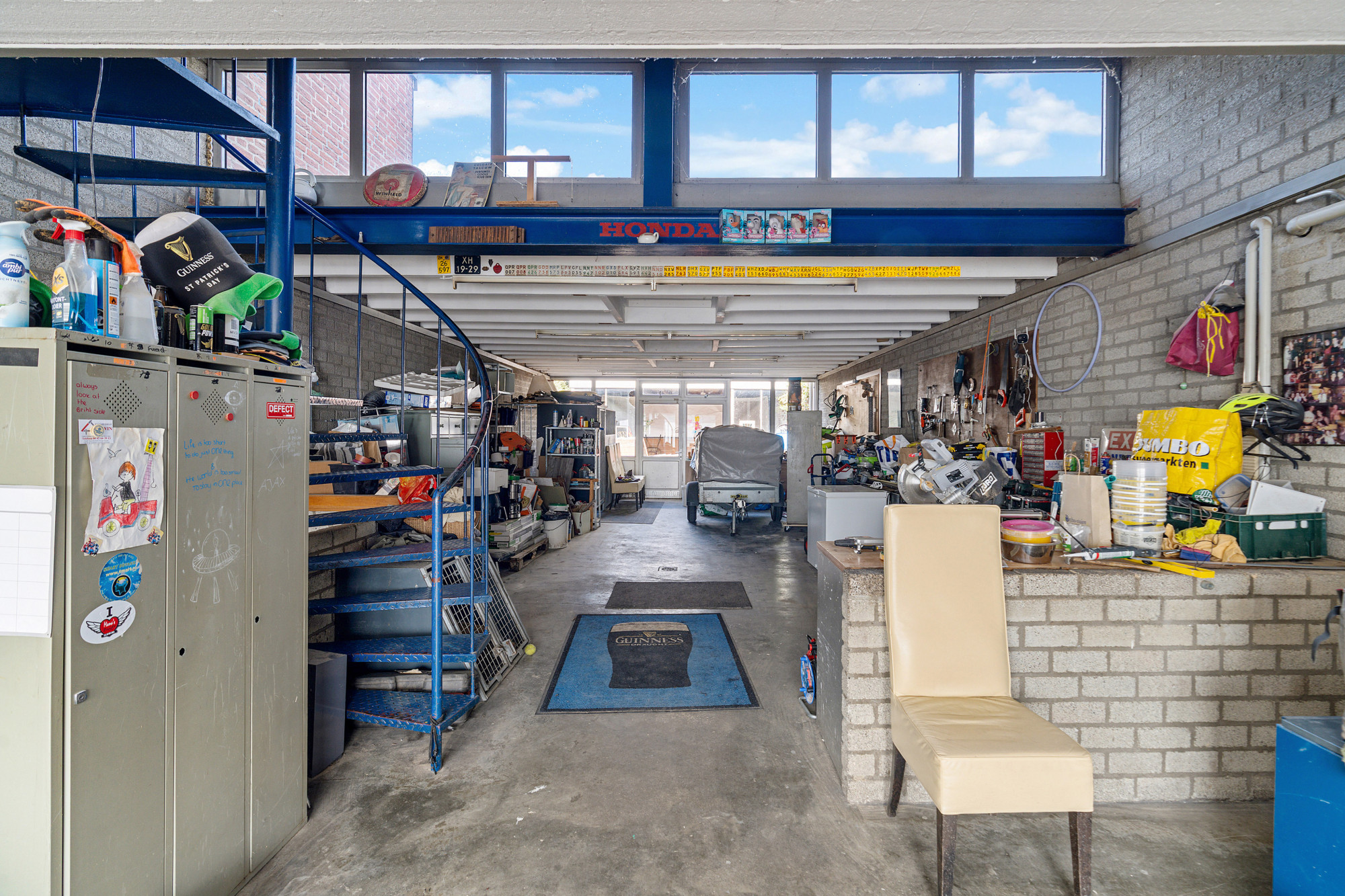 De garage is zowel vanuit de woning als de keuken toegankelijk en beschikt over een meterkast. Een krultrap leidt naar nog een multifunctionele ruimte, ideaal voor hobby of werk.