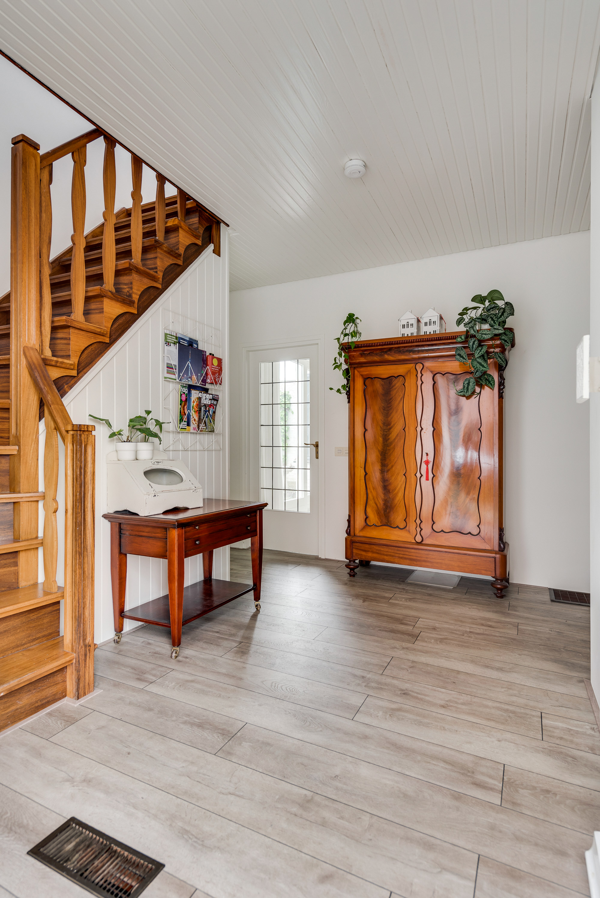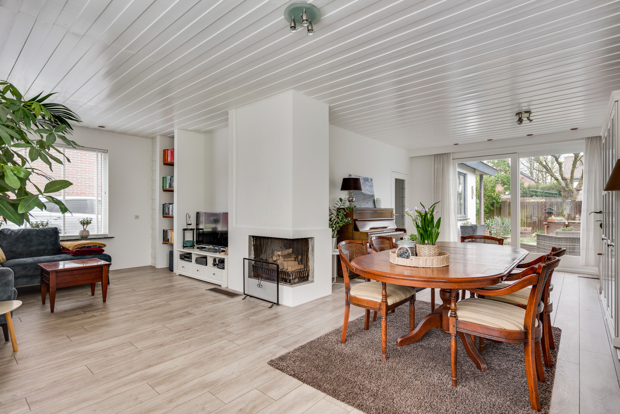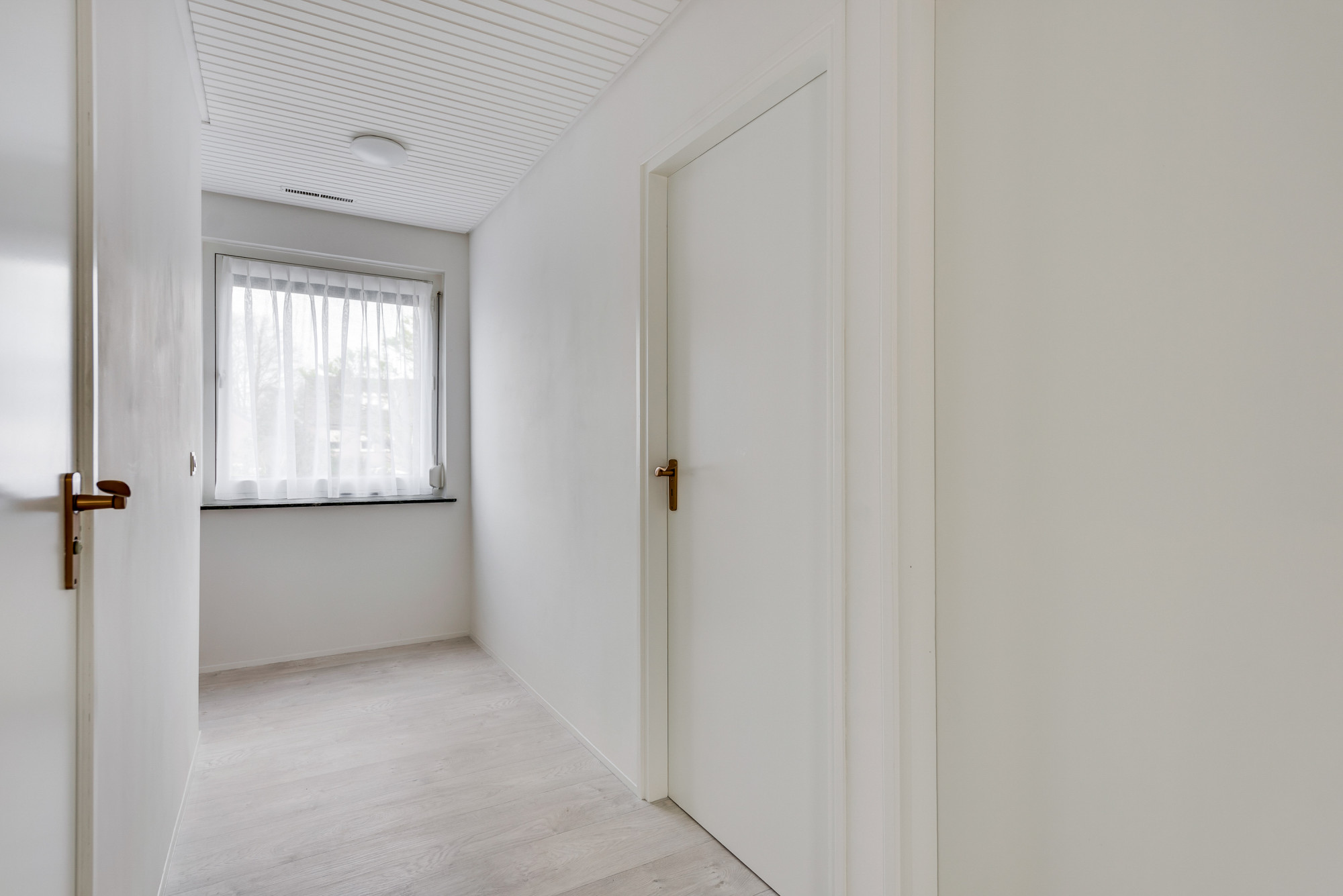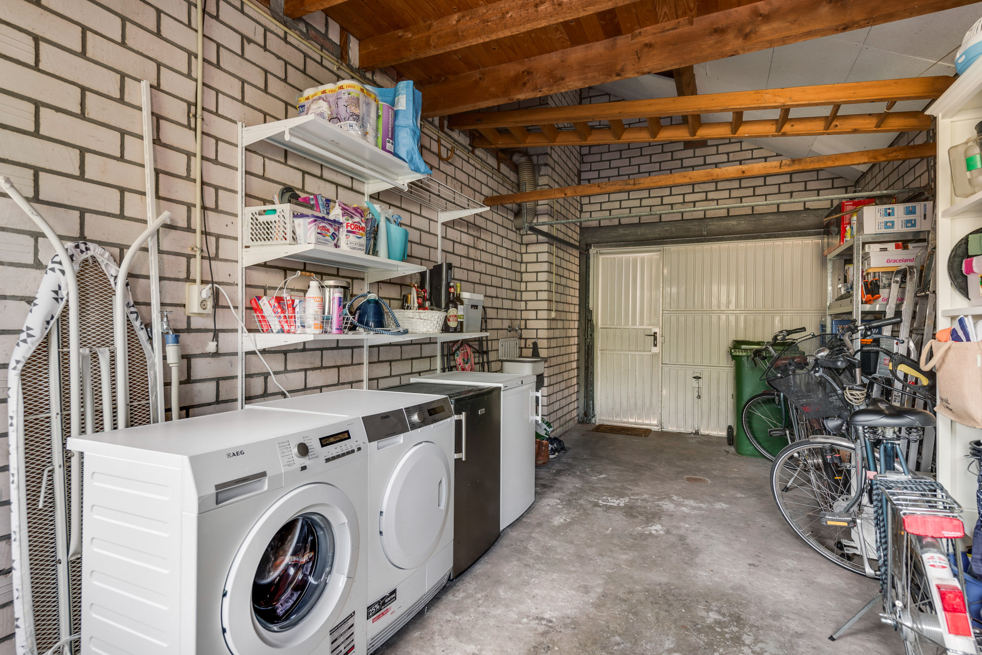 De royale hal biedt via een hardhouten trap toegang tot de eerste verdieping, de toiletruimte met toilet en fonteintje, meterkast, kelder, keuken en de woonkamer. De L-vormige woonkamer kent veel lichtinval, beschikt over een schouw en biedt voldoende ruimte voor een apart eet- en zitgedeelte. Vanuit de woonkamer is een multifunctionele gelijkvloerse extra (slaap-/hobby-/kantoor)kamer te bereiken. Tevens is middels een schuifpui de fraaie achtertuin bereikbaar. De royale woonkeuken biedt voldoende ruimte voor een grote eettafel en is voorzien van een nette doch eenvoudige keuken in hoekopstelling met de navolgende inbouwapparatuur: 4-pits gasfornuis met afzuigkap, koelkast (met vriesvakje) en een oven. Bovendien beschikt de royale woonkeuken over de witgoedaansluitingen (ook in garage aanwezig) en is de achtertuin vanuit de woonkeuken met overkapping direct toegankelijk. De garage is in spouw uitgevoerd en beschikt over 2 ramen voor daglicht toetreding en is voorzien van verwarming, elektra, een wasbak, wateraansluiting, 2e wasmachine aansluiting en een praktische vliering. De garage geeft middels een loopdeur toegang tot de achtertuin en middels een overkapping toegang tot de keuken. De begane grond is grotendeels voorzien van een recente gelegde laminaatvloer en deels een tegelvloer.