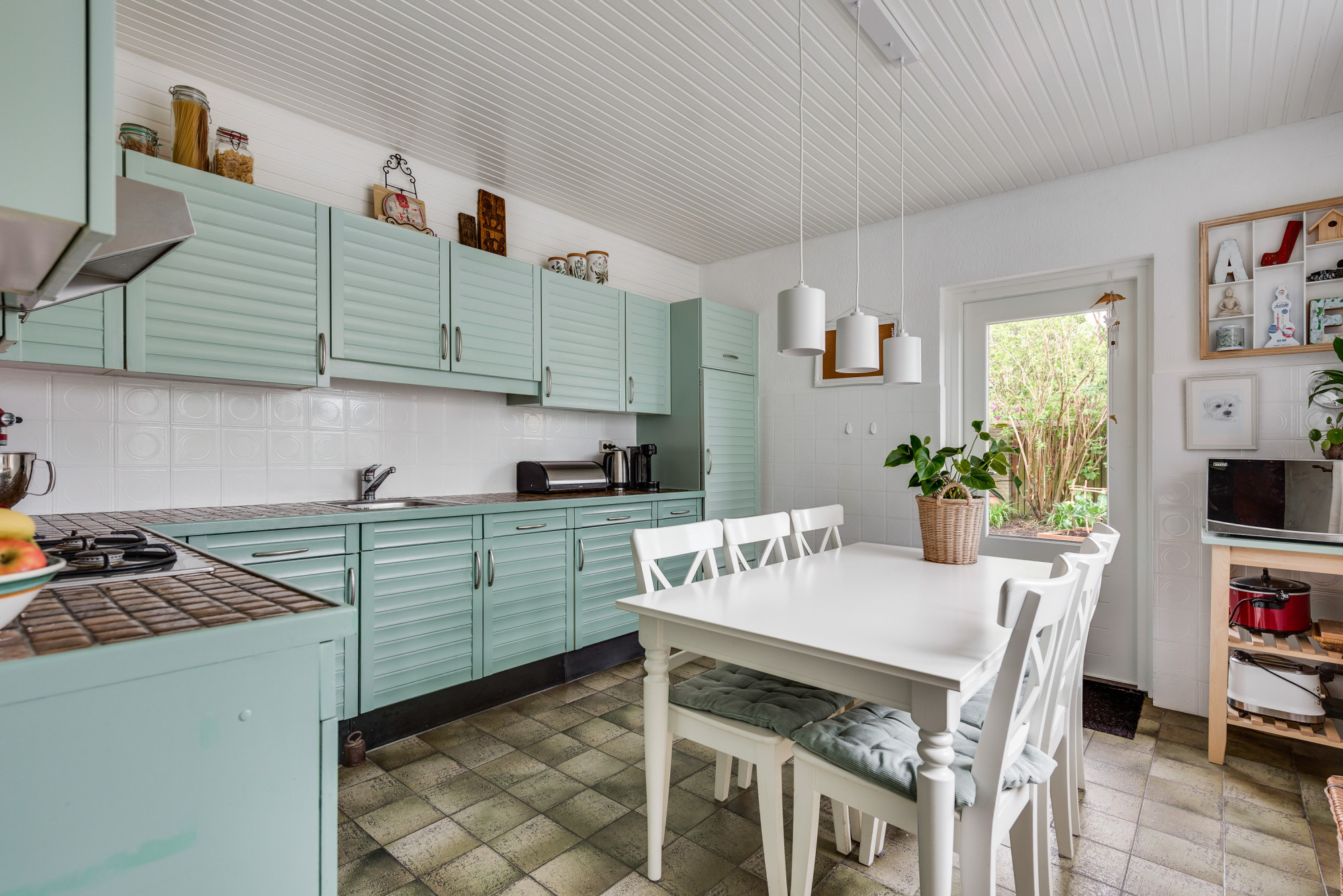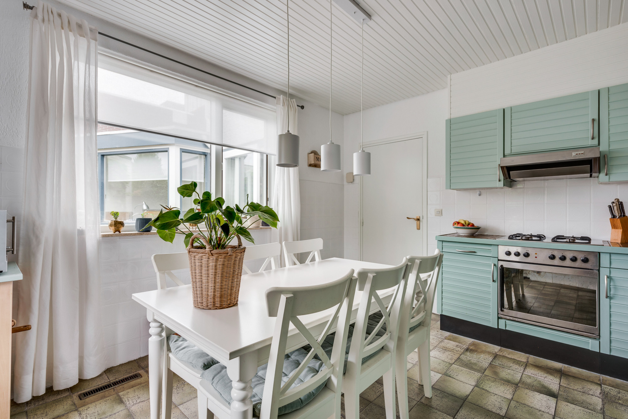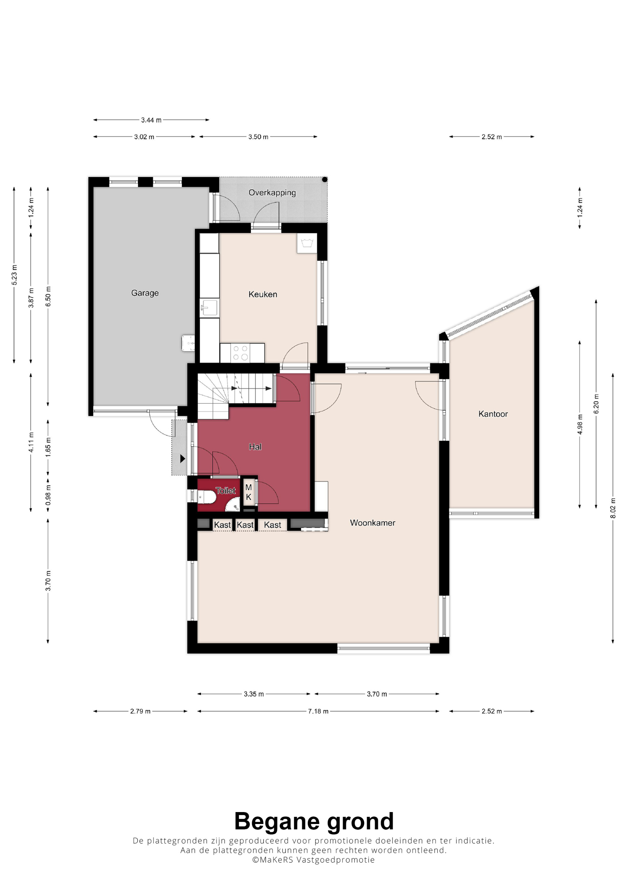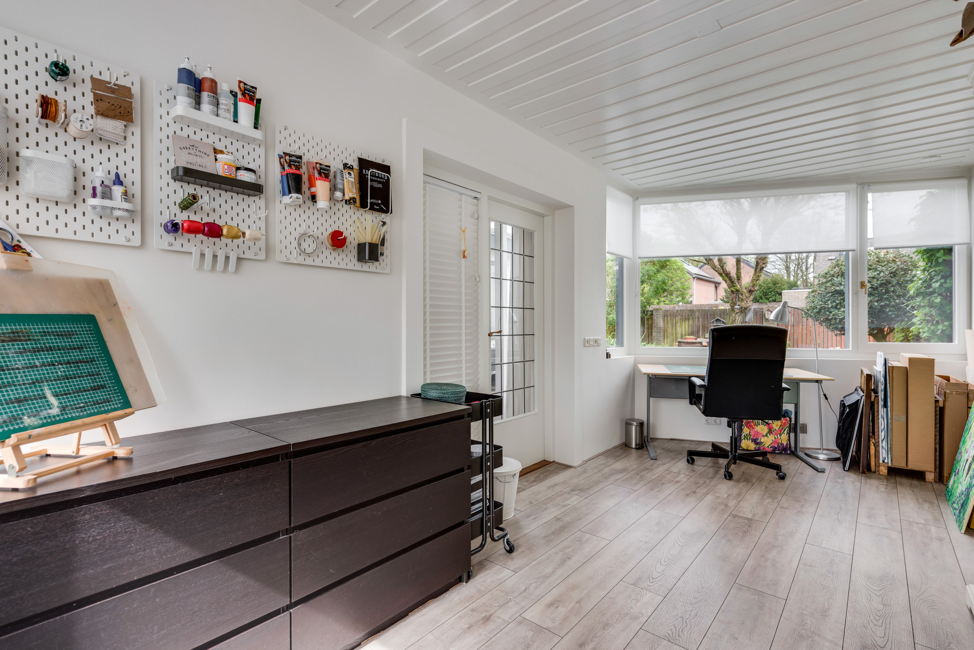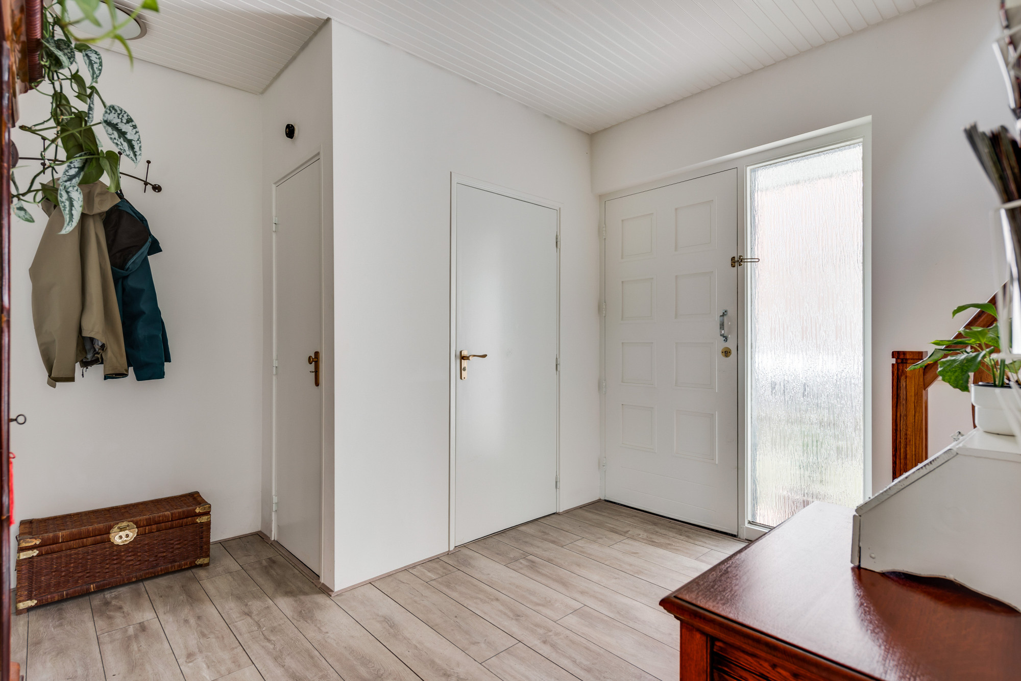 De royale hal biedt via een hardhouten trap toegang tot de eerste verdieping, de toiletruimte met toilet en fonteintje, meterkast, kelder, keuken en de woonkamer. De L-vormige woonkamer kent veel lichtinval, beschikt over een schouw en biedt voldoende ruimte voor een apart eet- en zitgedeelte. Vanuit de woonkamer is een multifunctionele gelijkvloerse extra (slaap-/hobby-/kantoor)kamer te bereiken. Tevens is middels een schuifpui de fraaie achtertuin bereikbaar. De royale woonkeuken biedt voldoende ruimte voor een grote eettafel en is voorzien van een nette doch eenvoudige keuken in hoekopstelling met de navolgende inbouwapparatuur: 4-pits gasfornuis met afzuigkap, koelkast (met vriesvakje) en een oven. Bovendien beschikt de royale woonkeuken over de witgoedaansluitingen (ook in garage aanwezig) en is de achtertuin vanuit de woonkeuken met overkapping direct toegankelijk. De garage is in spouw uitgevoerd en beschikt over 2 ramen voor daglicht toetreding en is voorzien van verwarming, elektra, een wasbak, wateraansluiting, 2e wasmachine aansluiting en een praktische vliering. De garage geeft middels een loopdeur toegang tot de achtertuin en middels een overkapping toegang tot de keuken. De begane grond is grotendeels voorzien van een recente gelegde laminaatvloer en deels een tegelvloer.