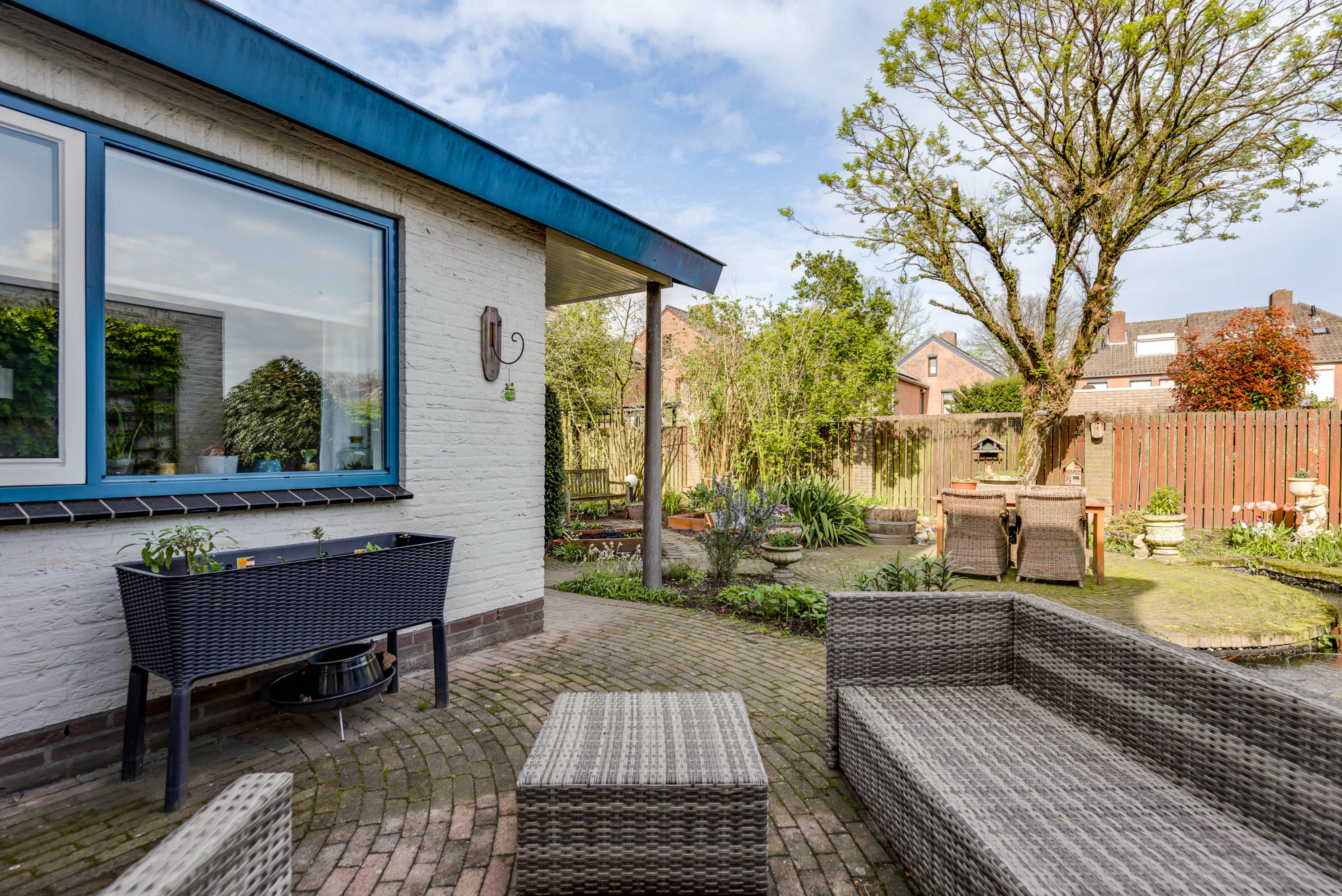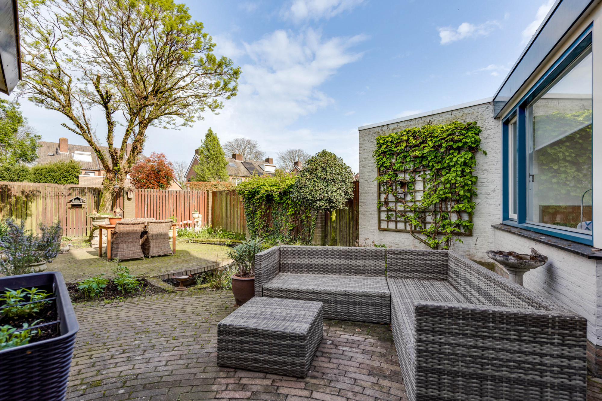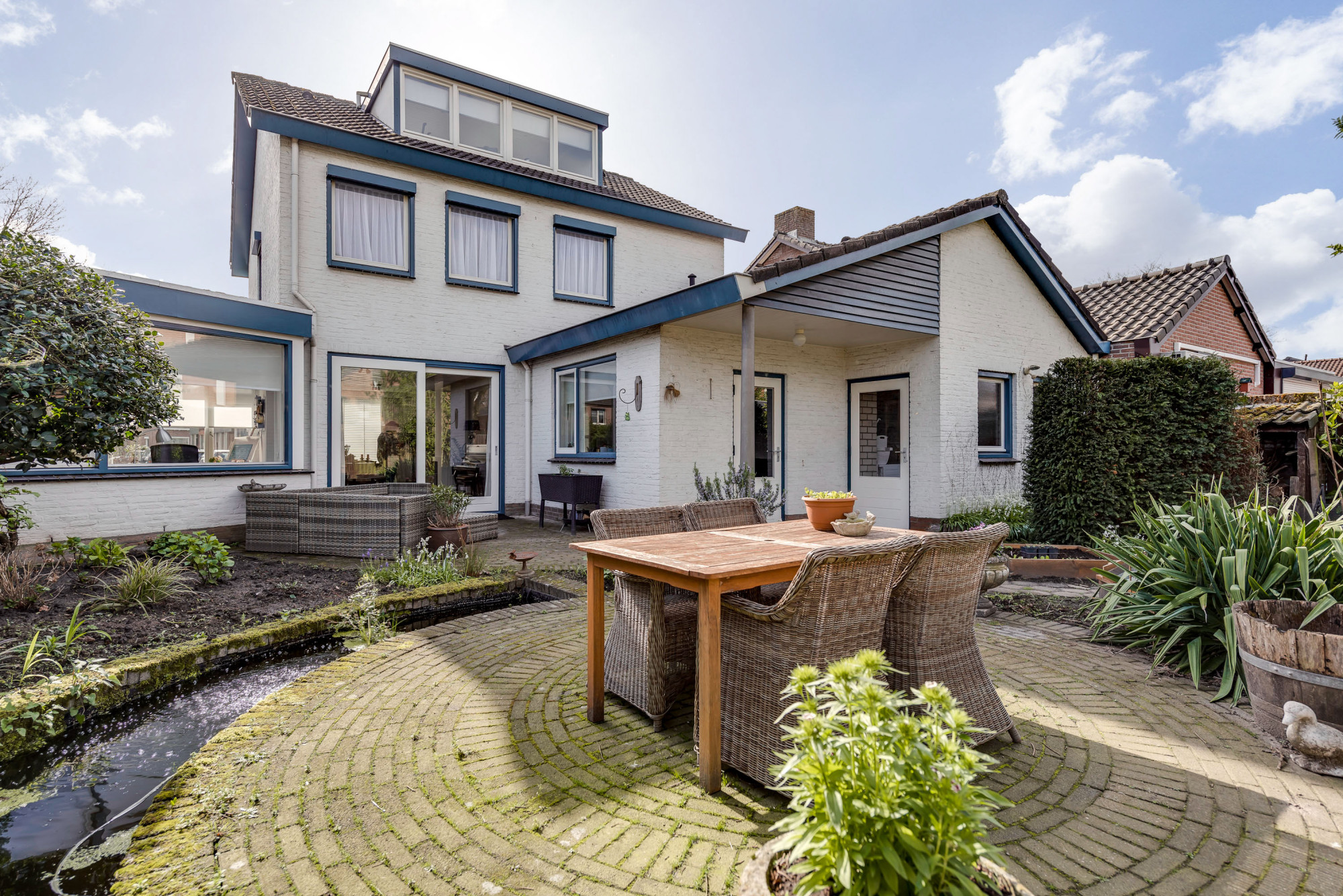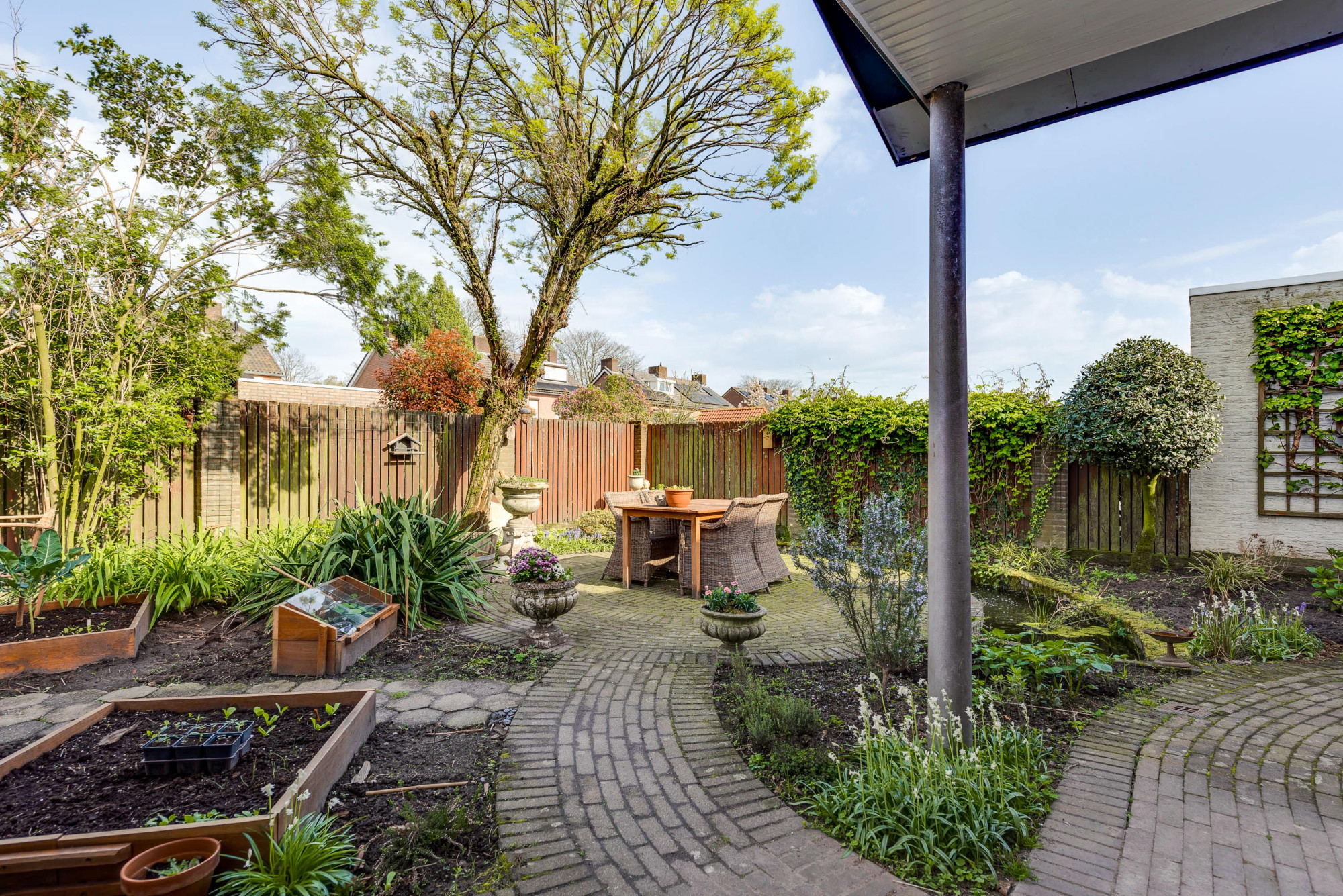 Er is een voortuin met eigen oprit welke leidt naar de garage en de achtertuin. De fraai aangelegde zonnige en groene achtertuin beschikt over een overkapping, meerdere terrassen, kleine ondiepe vijver en borders met diverse aanplant. Door de tuinligging is altijd de zon en de schaduw op te zoeken en is er ook veel privacy aanwezig.