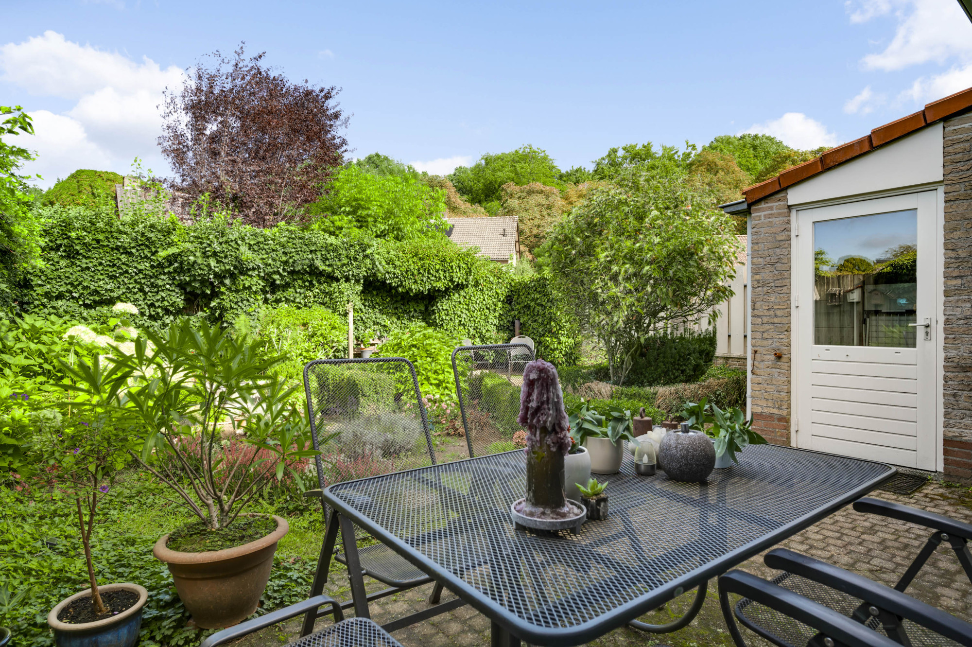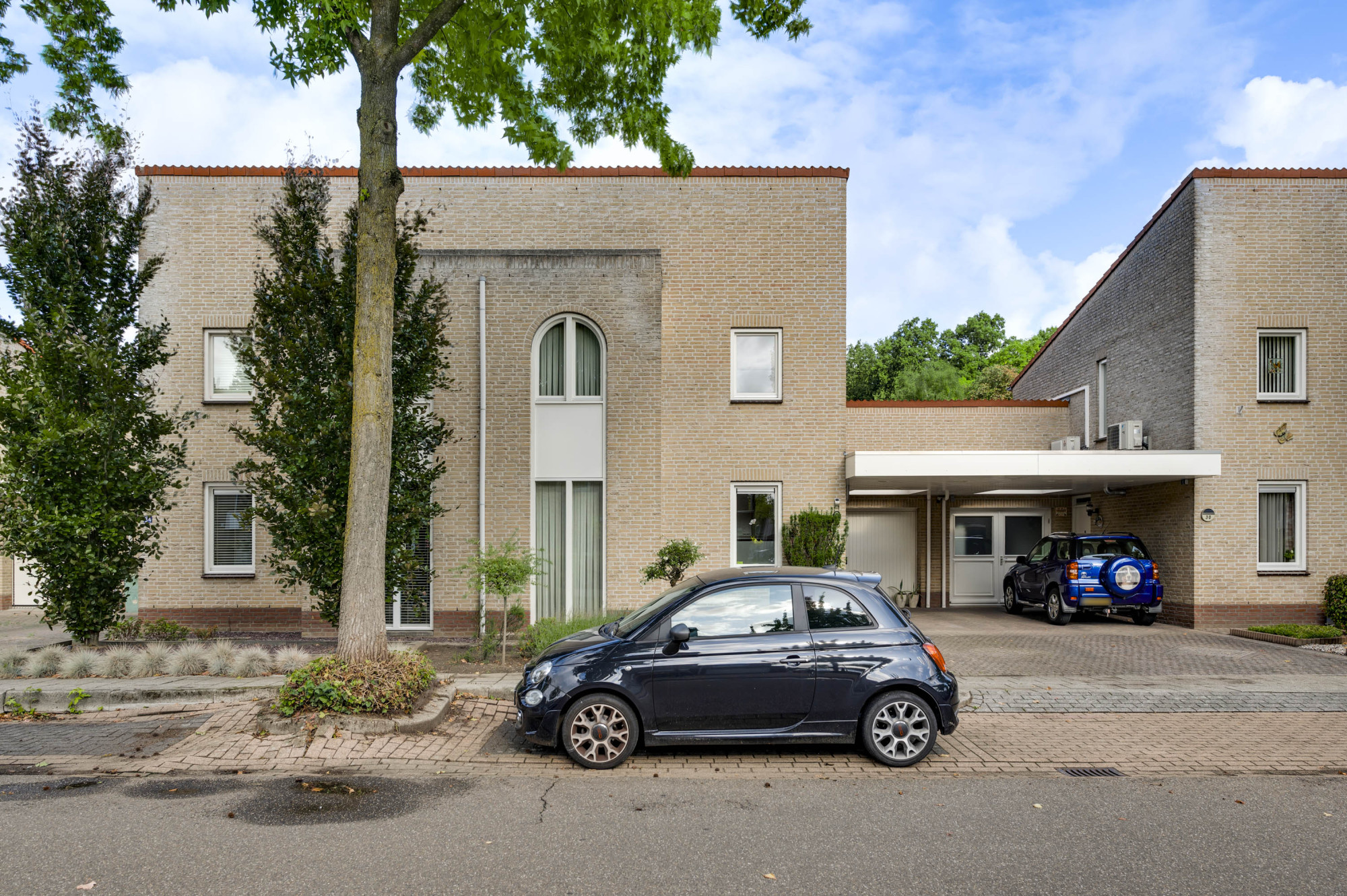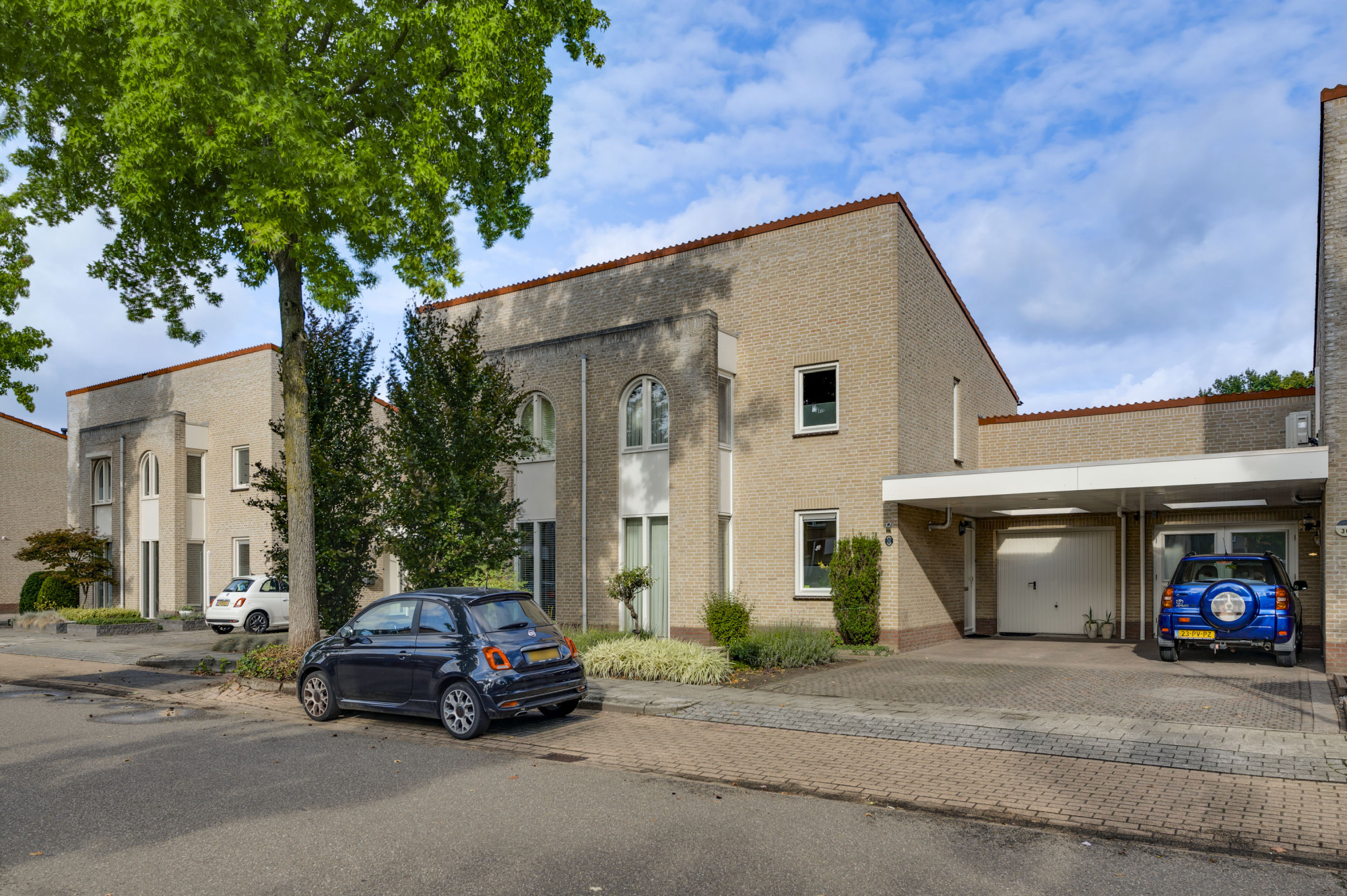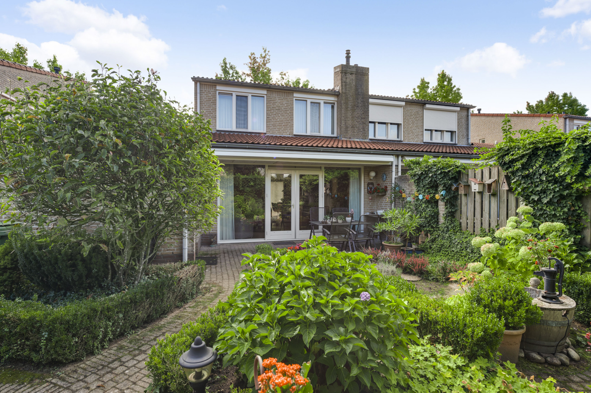 Aan de voorzijde ligt een onderhoudsvriendelijke tuin met een diepe oprit en carport die leidt naar de garage en de entree van de woning. De achtertuin biedt volop privacy en is ingericht met meerdere terrassen, bestrating, groenaanplant en een elektrisch zonnescherm.