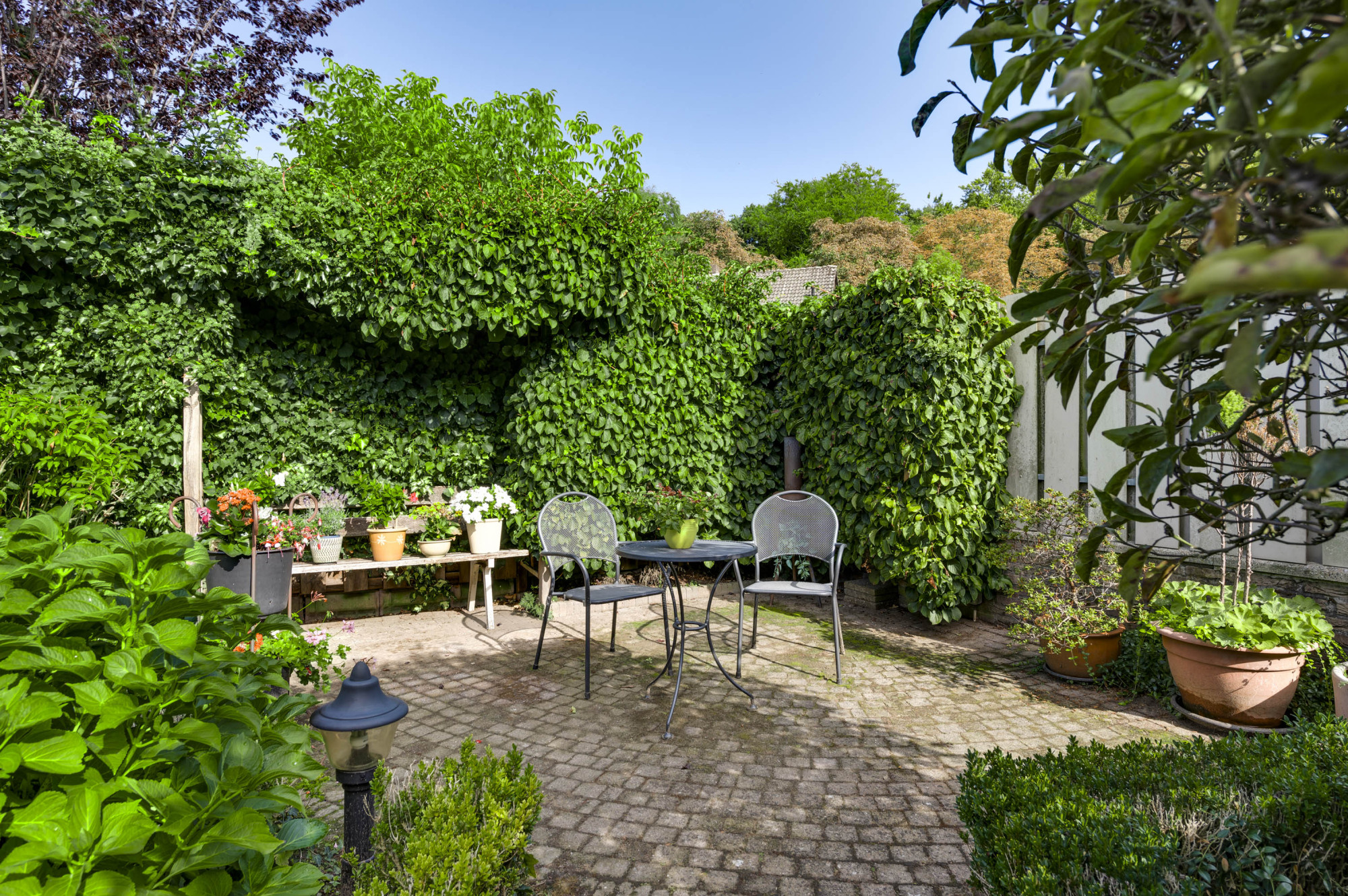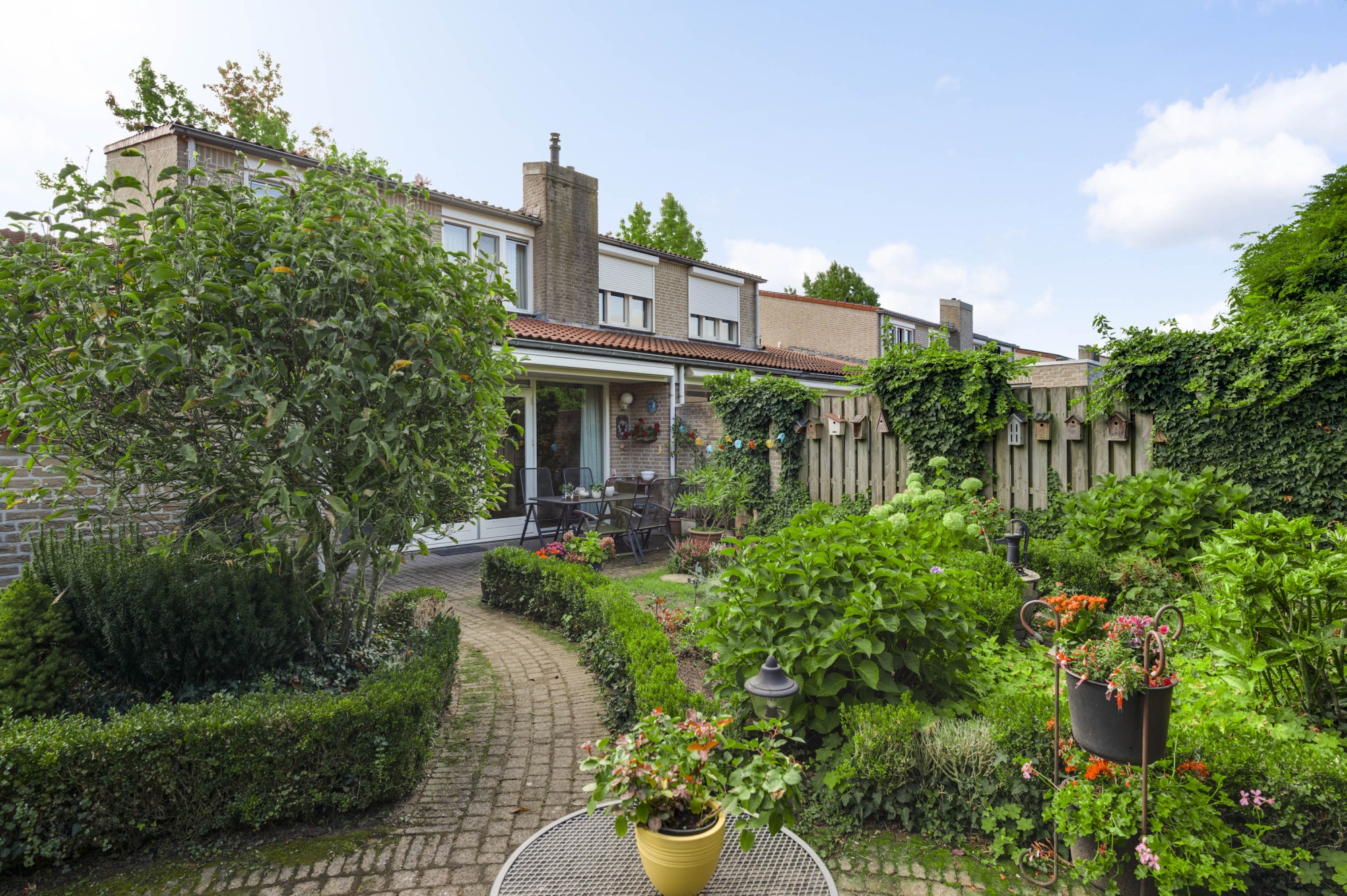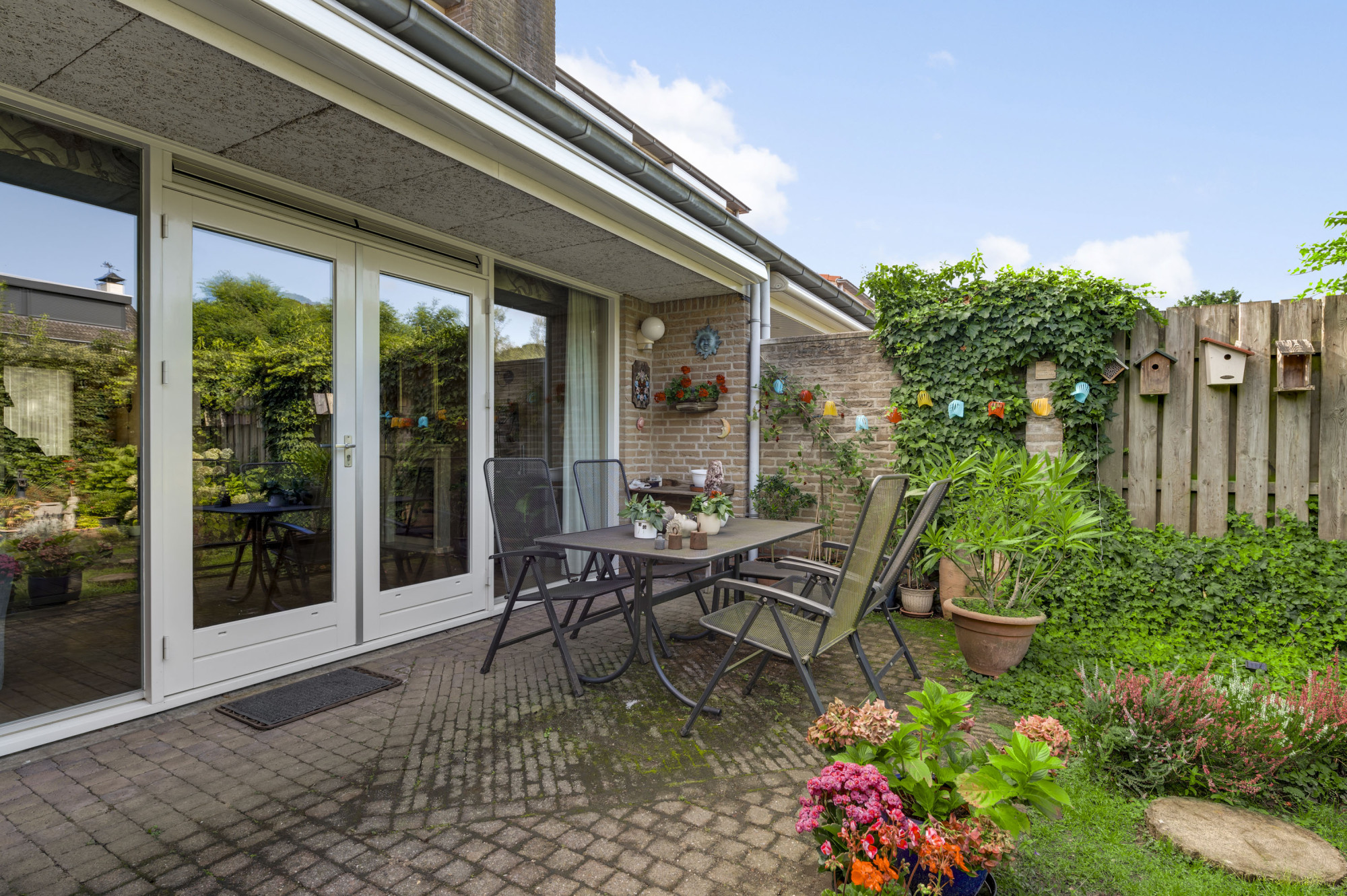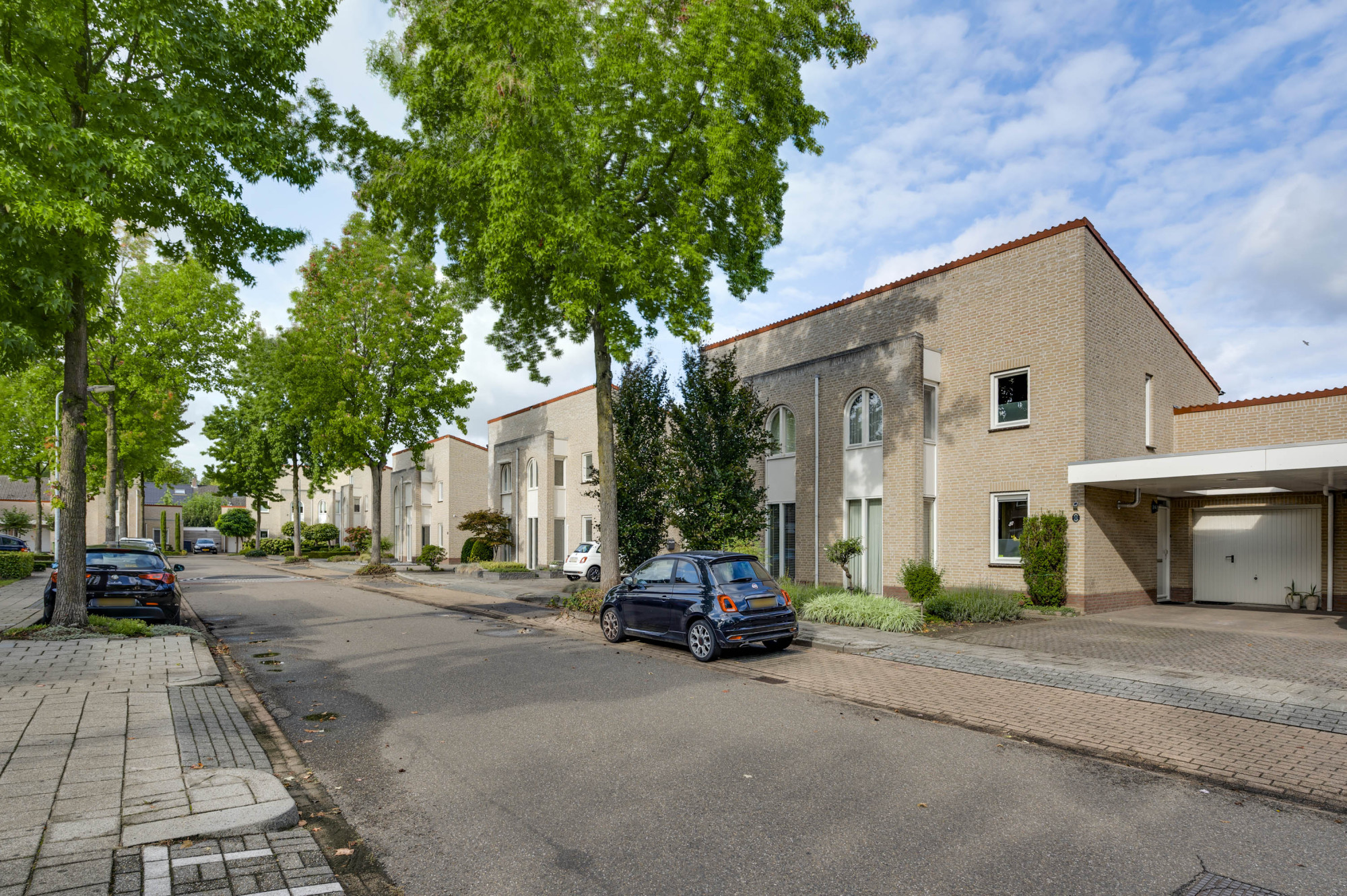 Aan de voorzijde ligt een onderhoudsvriendelijke tuin met een diepe oprit en carport die leidt naar de garage en de entree van de woning. De achtertuin biedt volop privacy en is ingericht met meerdere terrassen, bestrating, groenaanplant en een elektrisch zonnescherm.