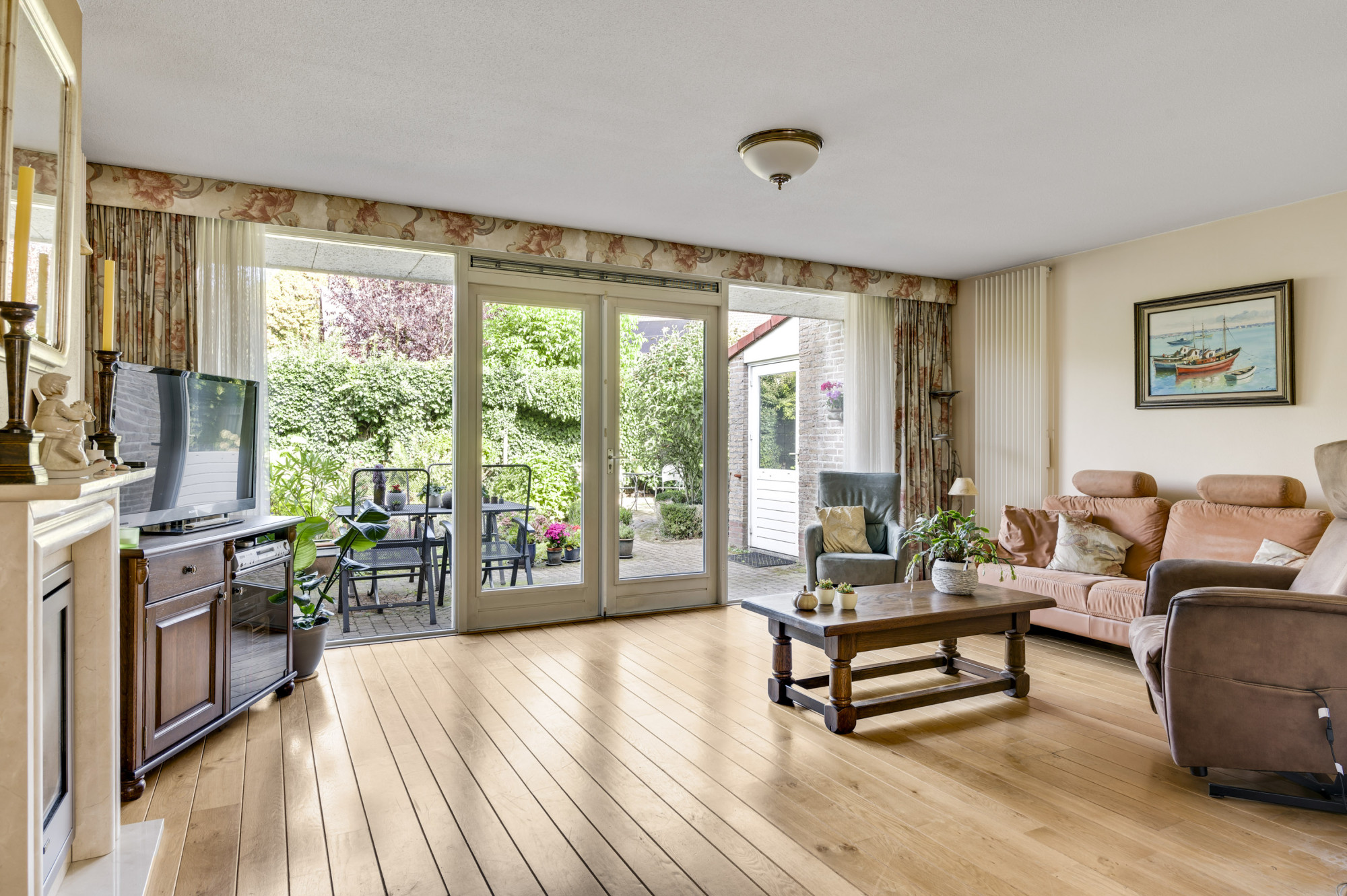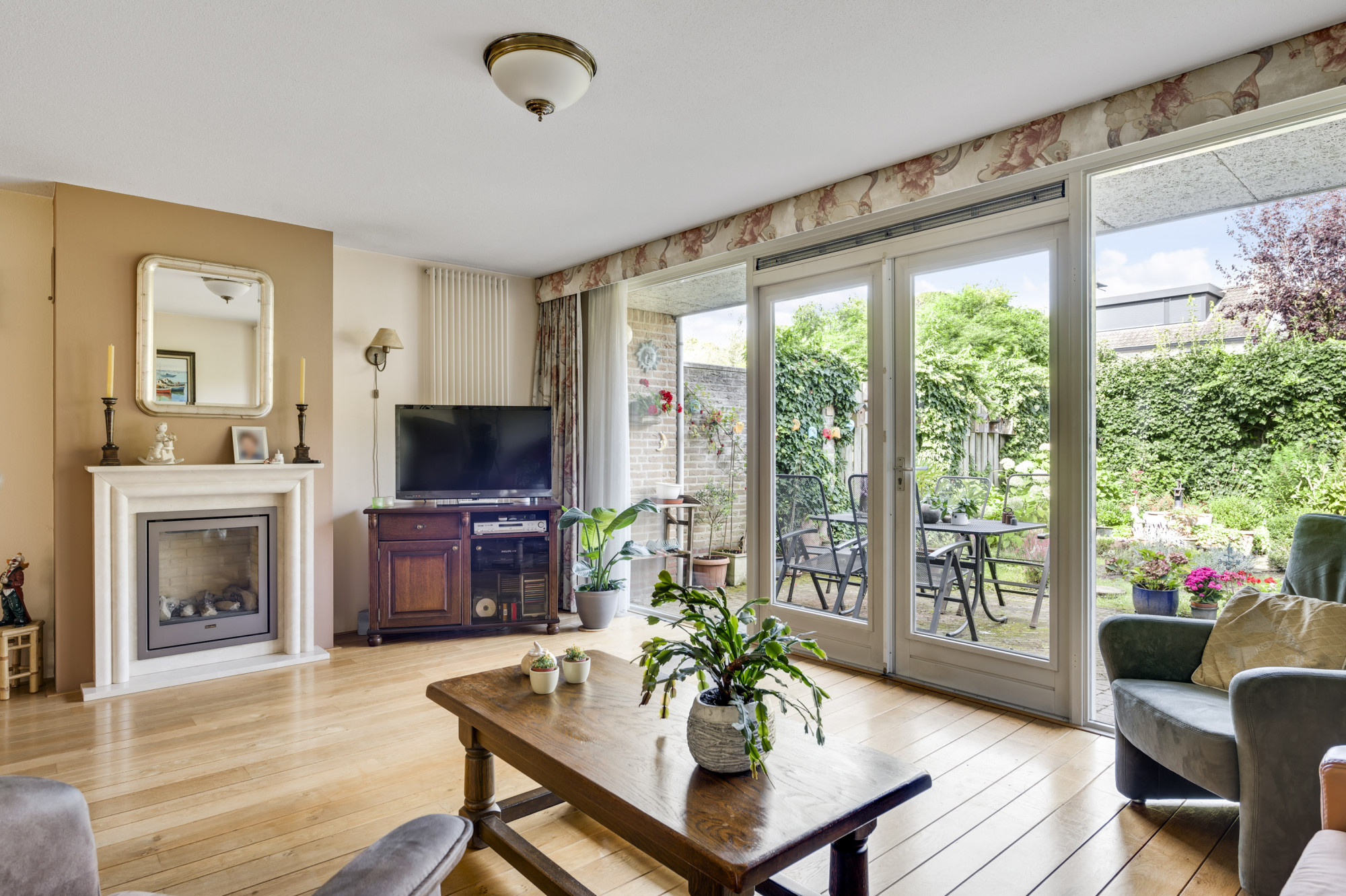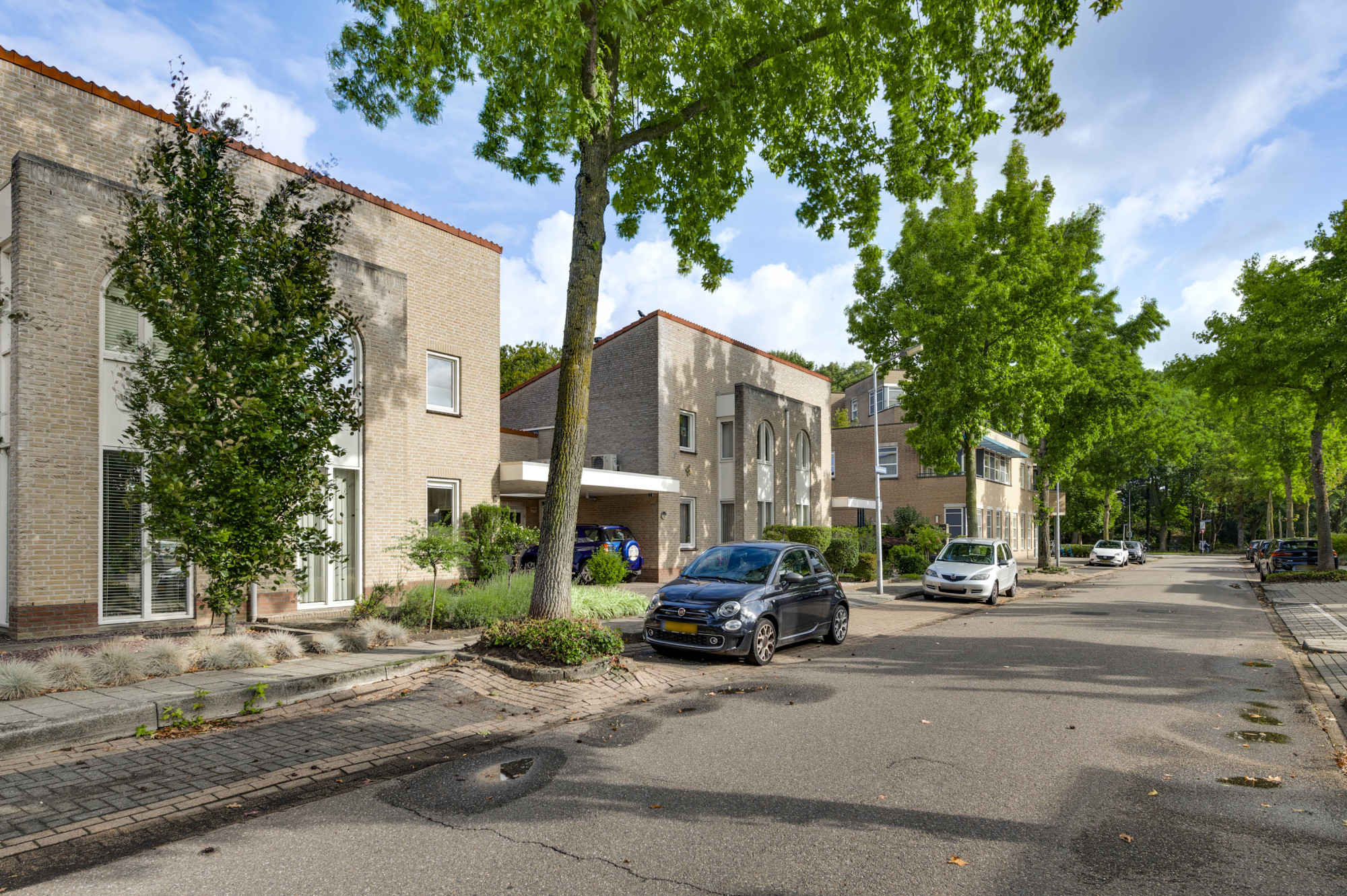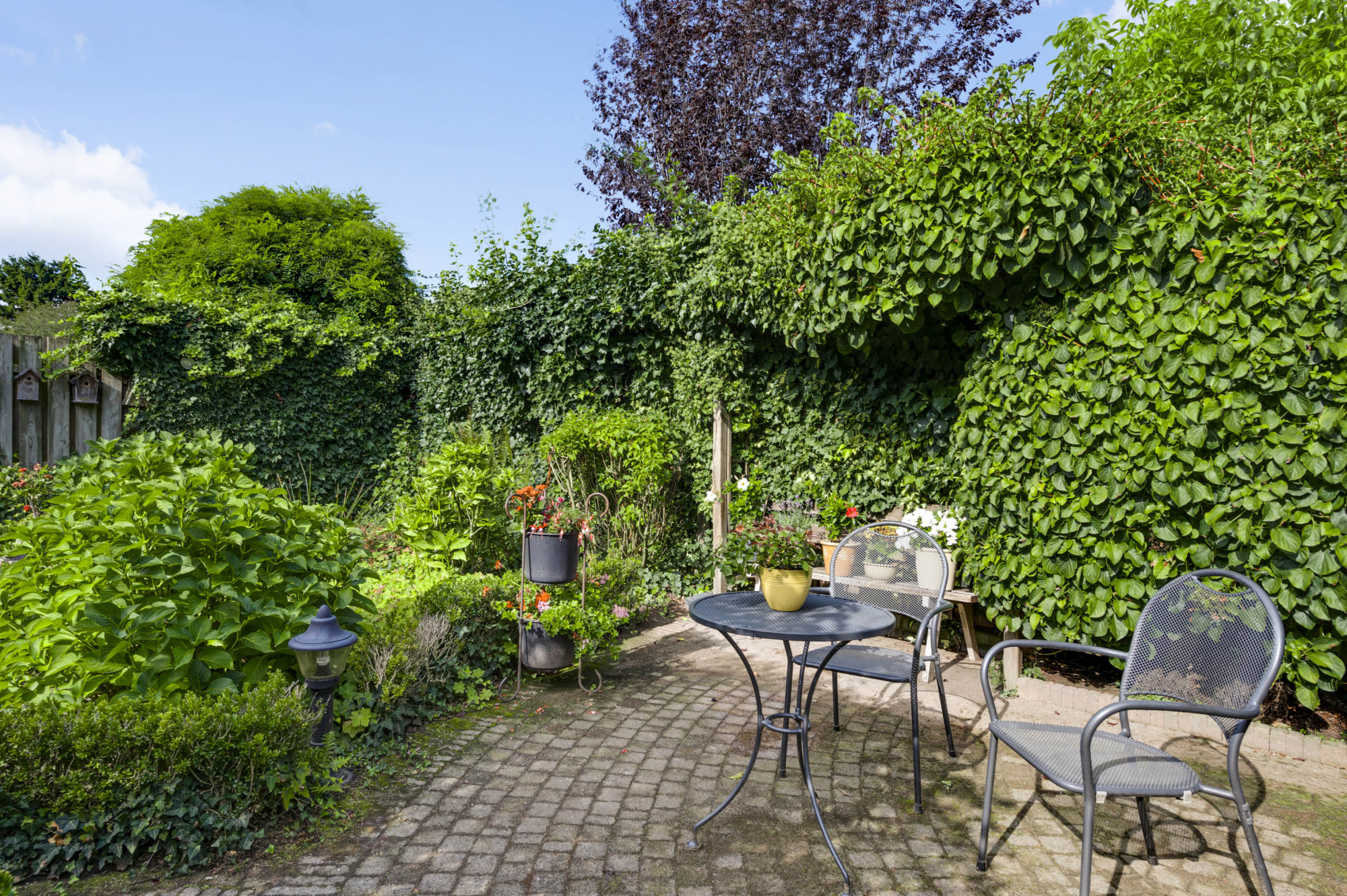 Aan de voorzijde ligt een onderhoudsvriendelijke tuin met een diepe oprit en carport die leidt naar de garage en de entree van de woning. De achtertuin biedt volop privacy en is ingericht met meerdere terrassen, bestrating, groenaanplant en een elektrisch zonnescherm.