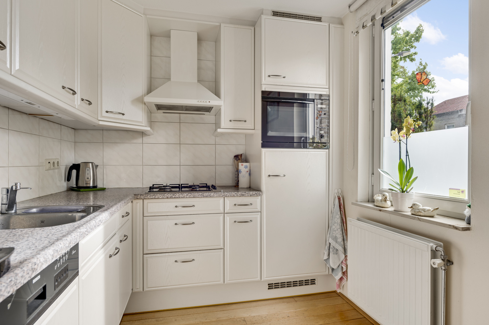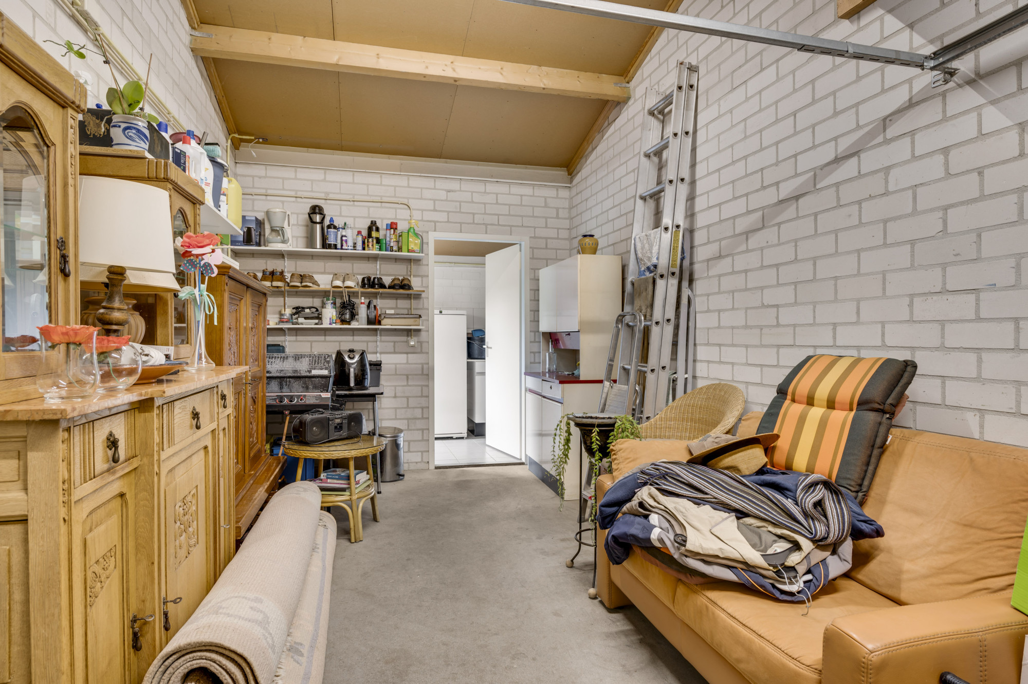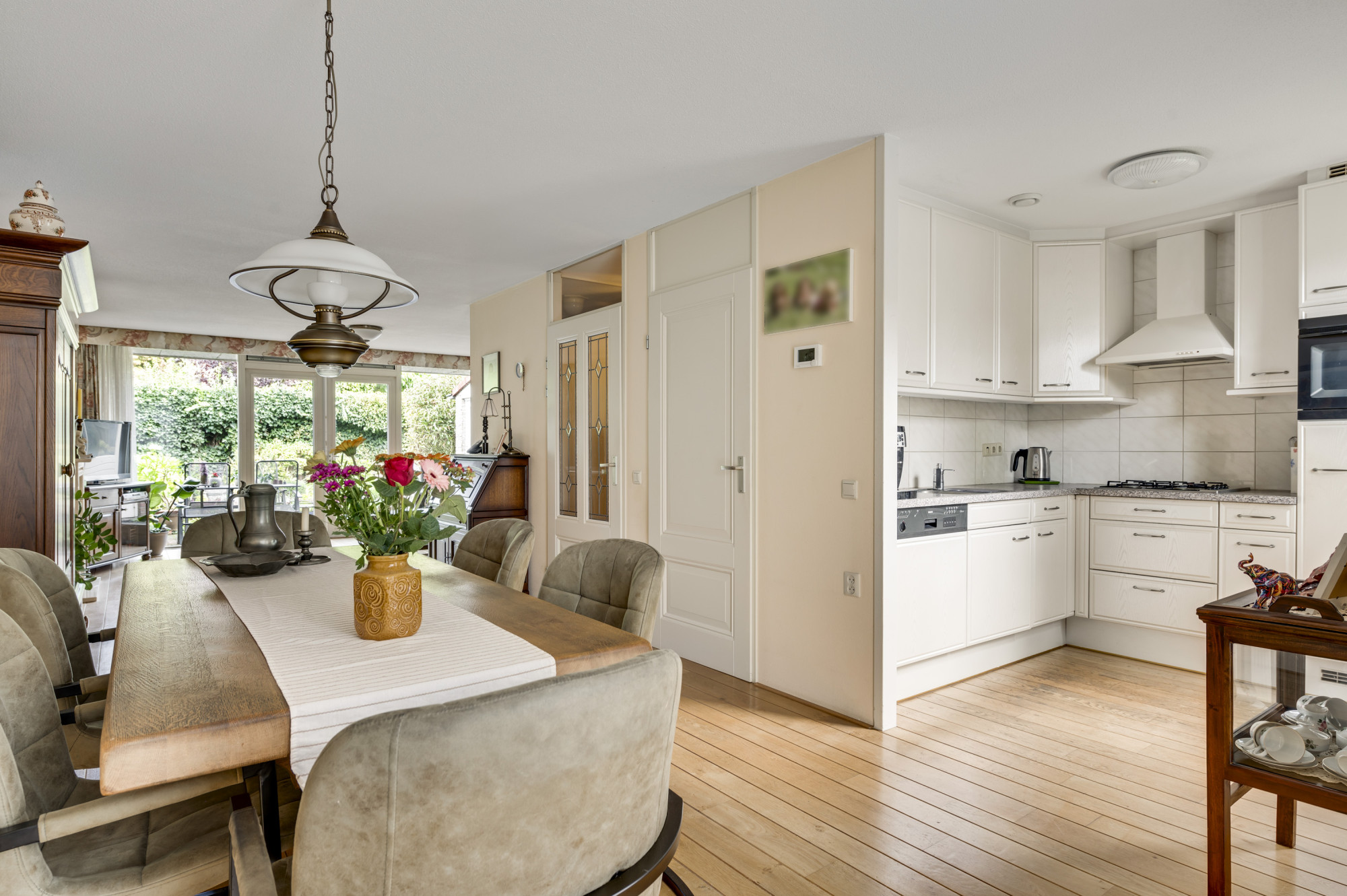 Via de hal met meterkast, trapopgang en toiletruimte met zwevend toilet en fonteintje bereikt u de inpandig bereikbare garage/hobbyruimte en de woonkamer. De woonkamer is ruim opgezet, voorzien van een sfeervolle gashaard, een fraaie parketvloer en geniet van veel daglicht middels de openslaande tuindeuren naar de tuin. De keuken is gelegen aan de voorzijde van de woning en biedt een combinatie in hoekopstelling met diverse inbouwapparatuur, waaronder een gasfornuis, afzuigkap, koelkast, combi-oven en een vaatwasser. Daarnaast is er een praktische trapkast aanwezig, ideaal voor extra voorraad. Vanuit de inpandige garage, voorzien van een kantelpoort en extra loopdeur naar de voorgelegen carport, heeft u toegang tot de achtergelegen berging/bijkeuken met spoelbak en loopdeur naar de tuin.