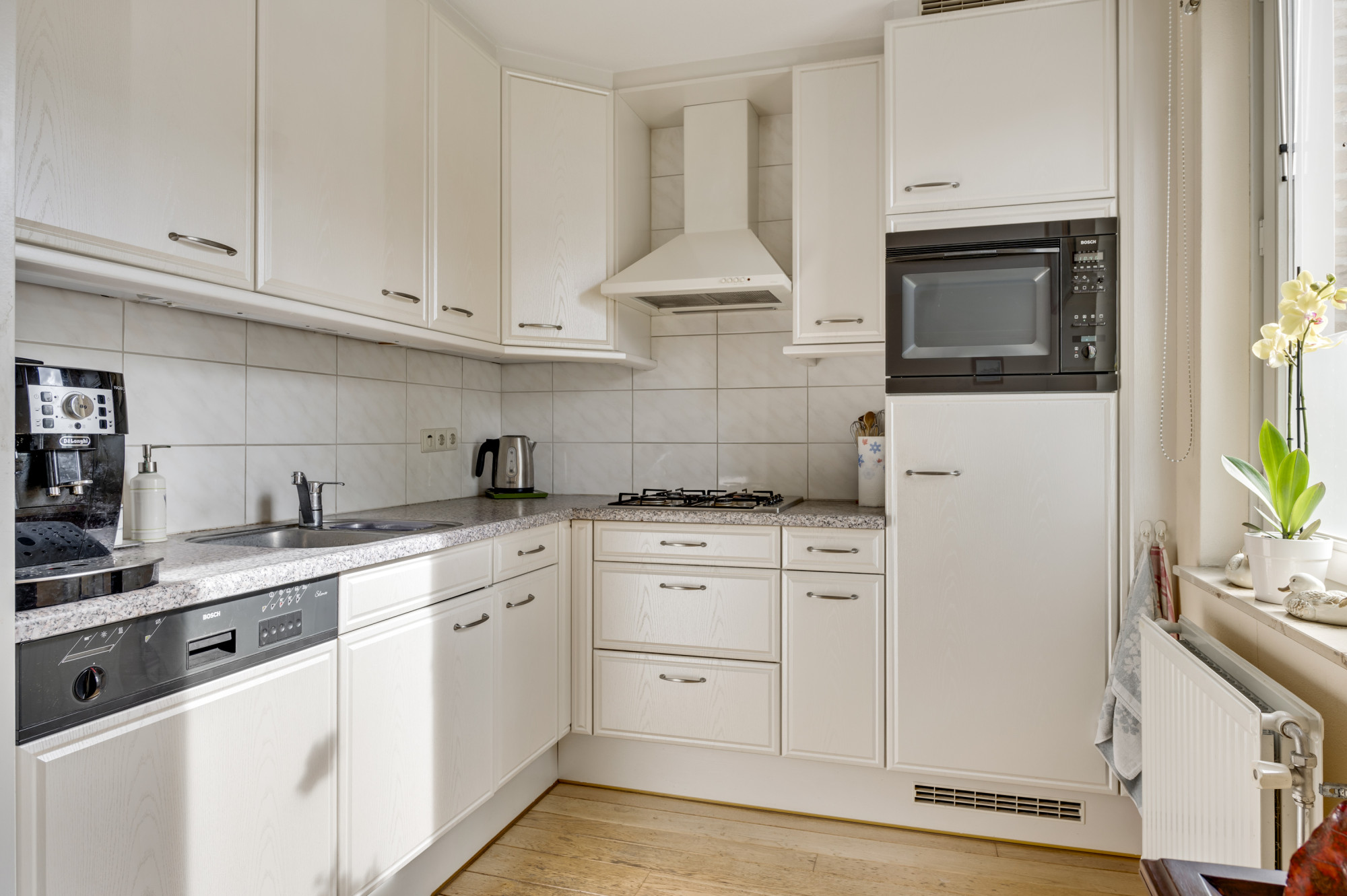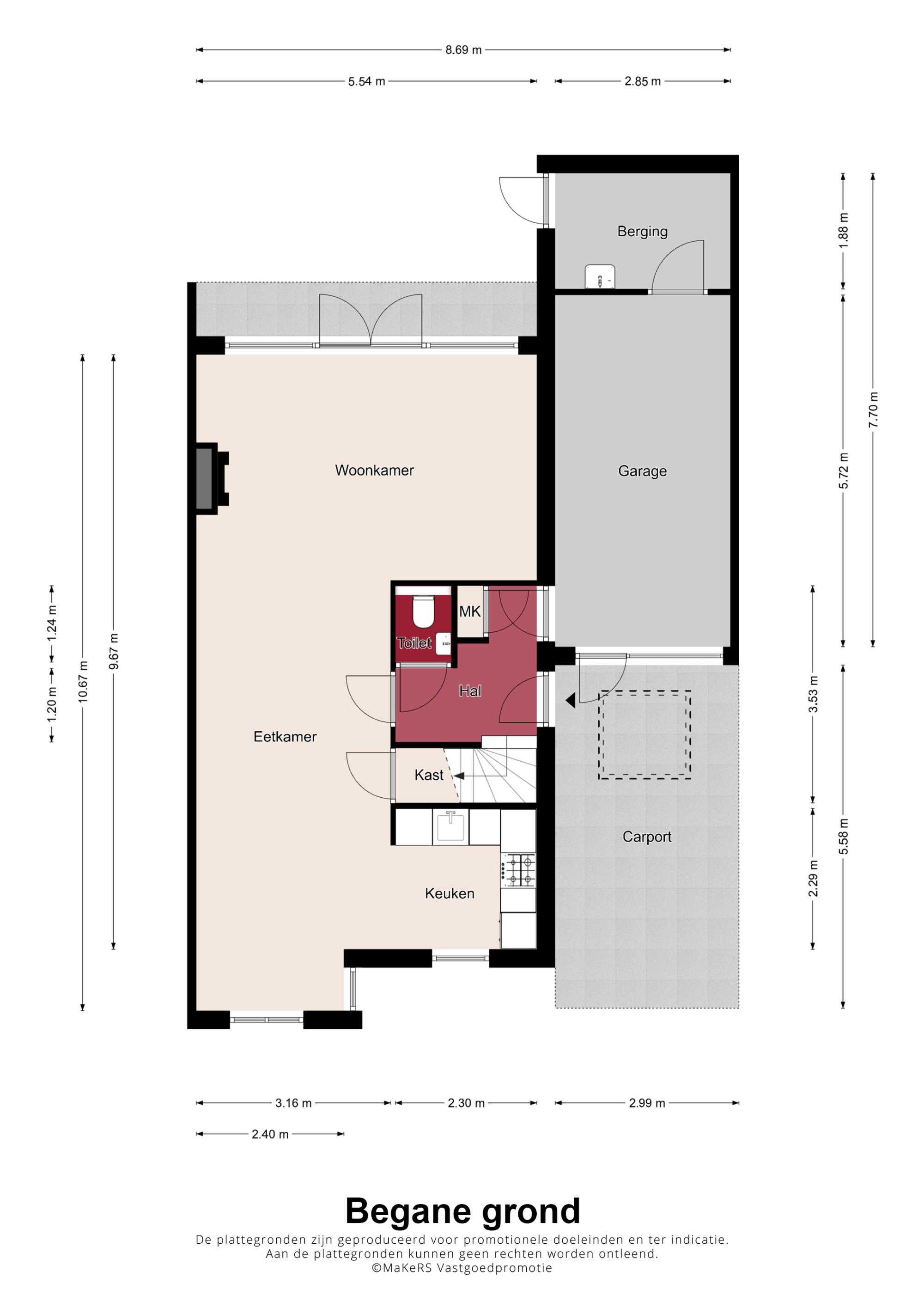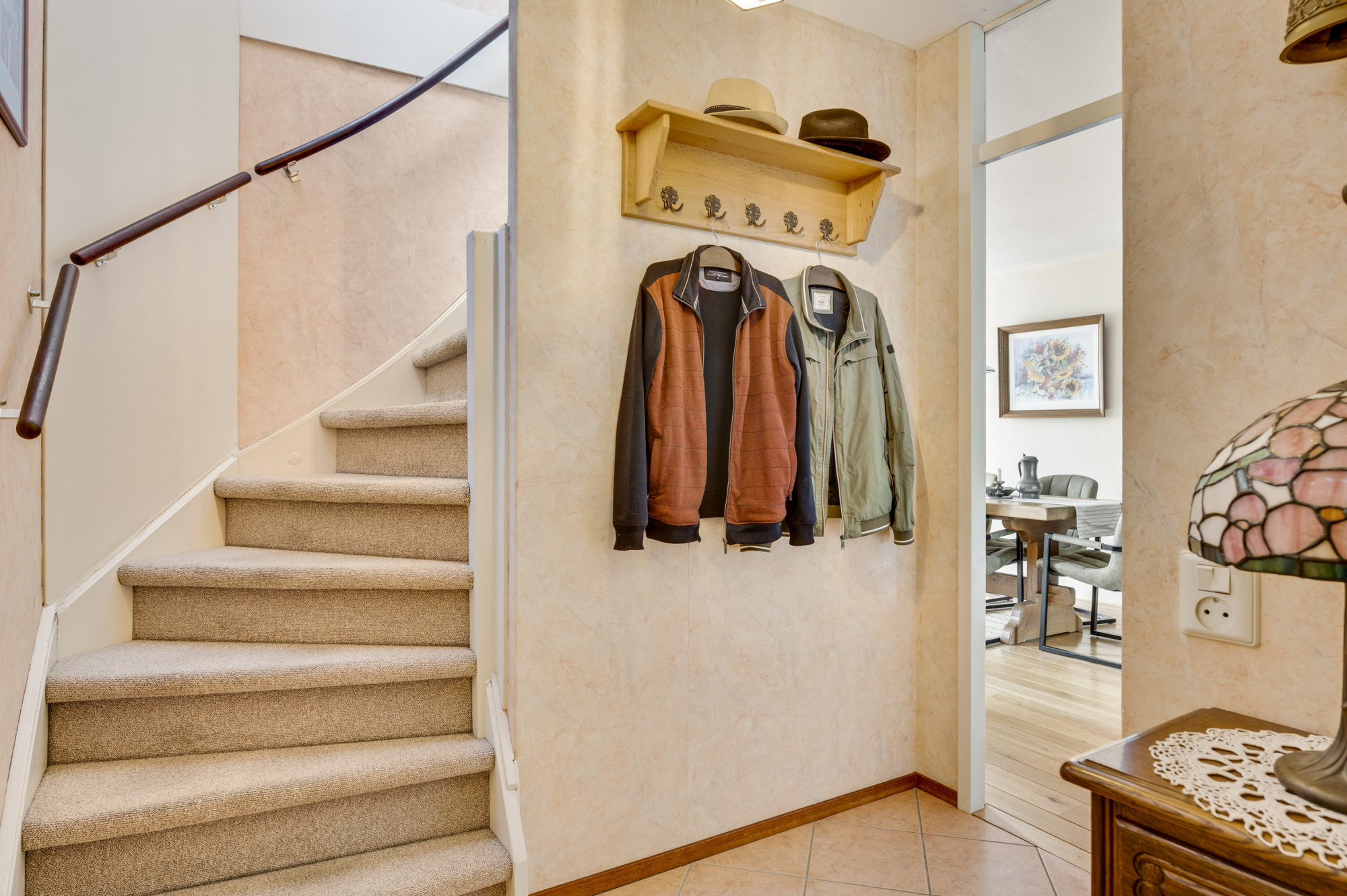Via de hal met meterkast, trapopgang en toiletruimte met zwevend toilet en fonteintje bereikt u de inpandig bereikbare garage/hobbyruimte en de woonkamer. De woonkamer is ruim opgezet, voorzien van een sfeervolle gashaard, een fraaie parketvloer en geniet van veel daglicht middels de openslaande tuindeuren naar de tuin. De keuken is gelegen aan de voorzijde van de woning en biedt een combinatie in hoekopstelling met diverse inbouwapparatuur, waaronder een gasfornuis, afzuigkap, koelkast, combi-oven en een vaatwasser. Daarnaast is er een praktische trapkast aanwezig, ideaal voor extra voorraad. Vanuit de inpandige garage, voorzien van een kantelpoort en extra loopdeur naar de voorgelegen carport, heeft u toegang tot de achtergelegen berging/bijkeuken met spoelbak en loopdeur naar de tuin.